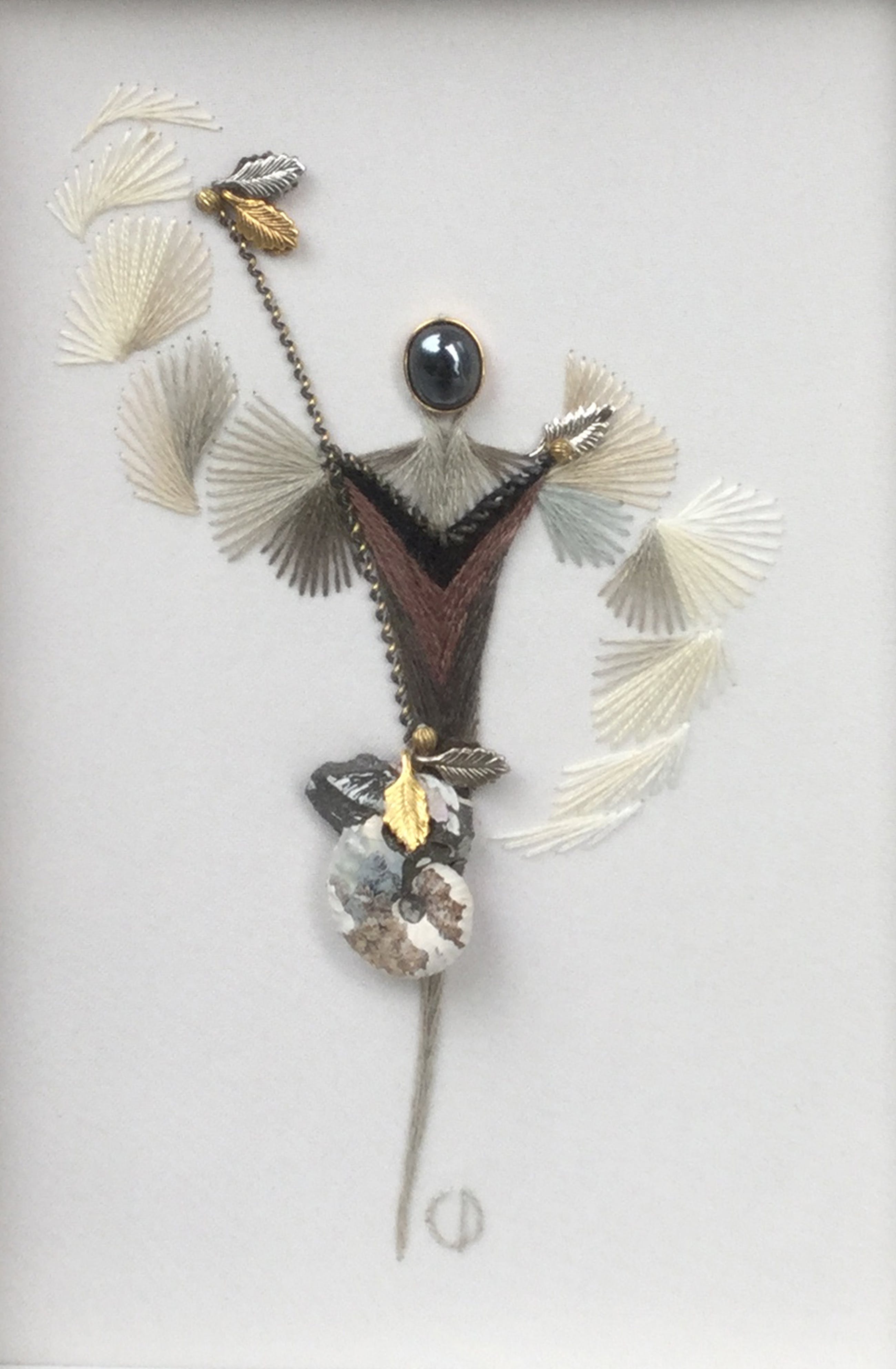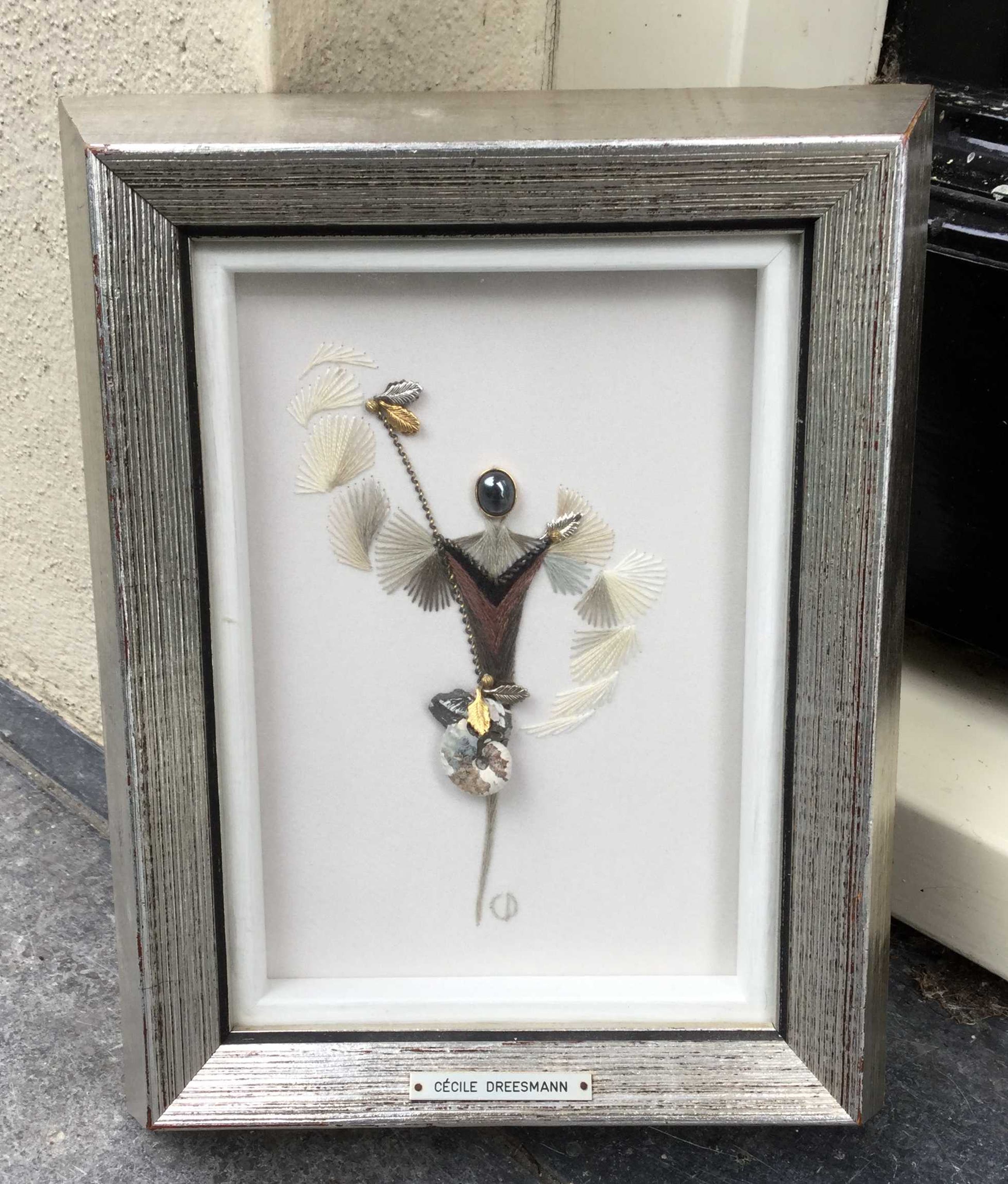 | Borduurwerk ingelijst in diepe lijst met glaswerk. Lijst bevat oppervlaktevuil en slijtschade door de tijd. | |
