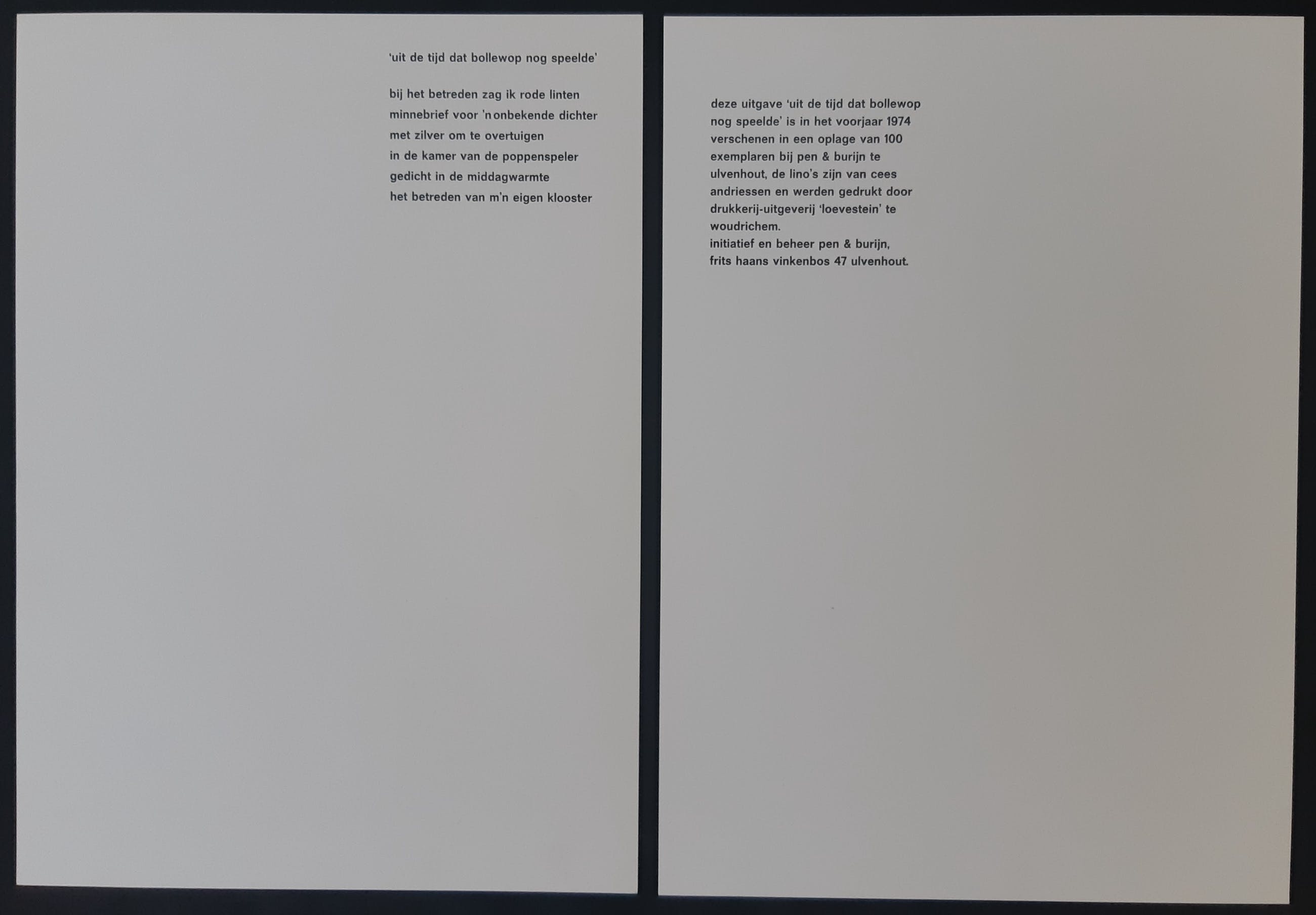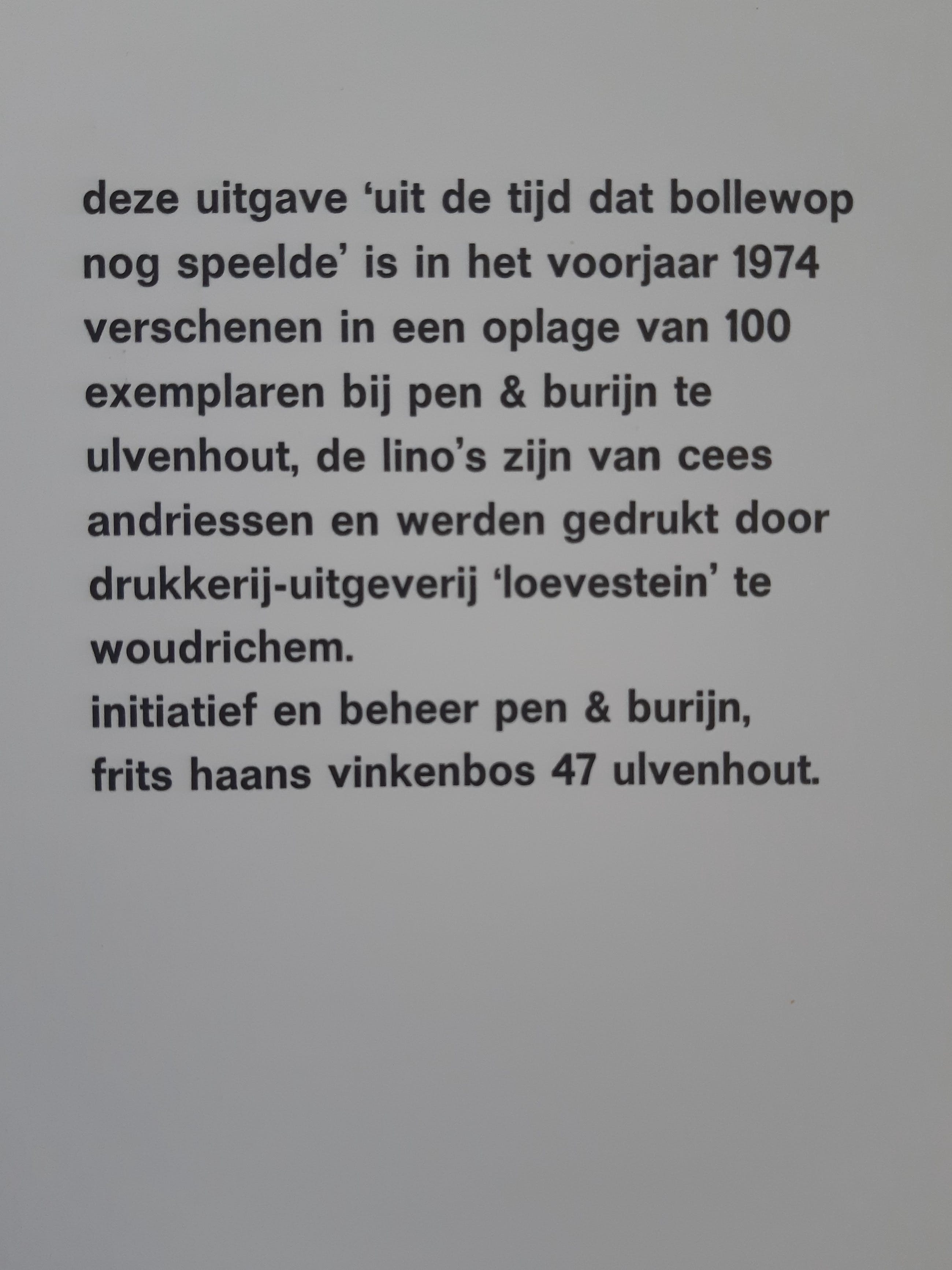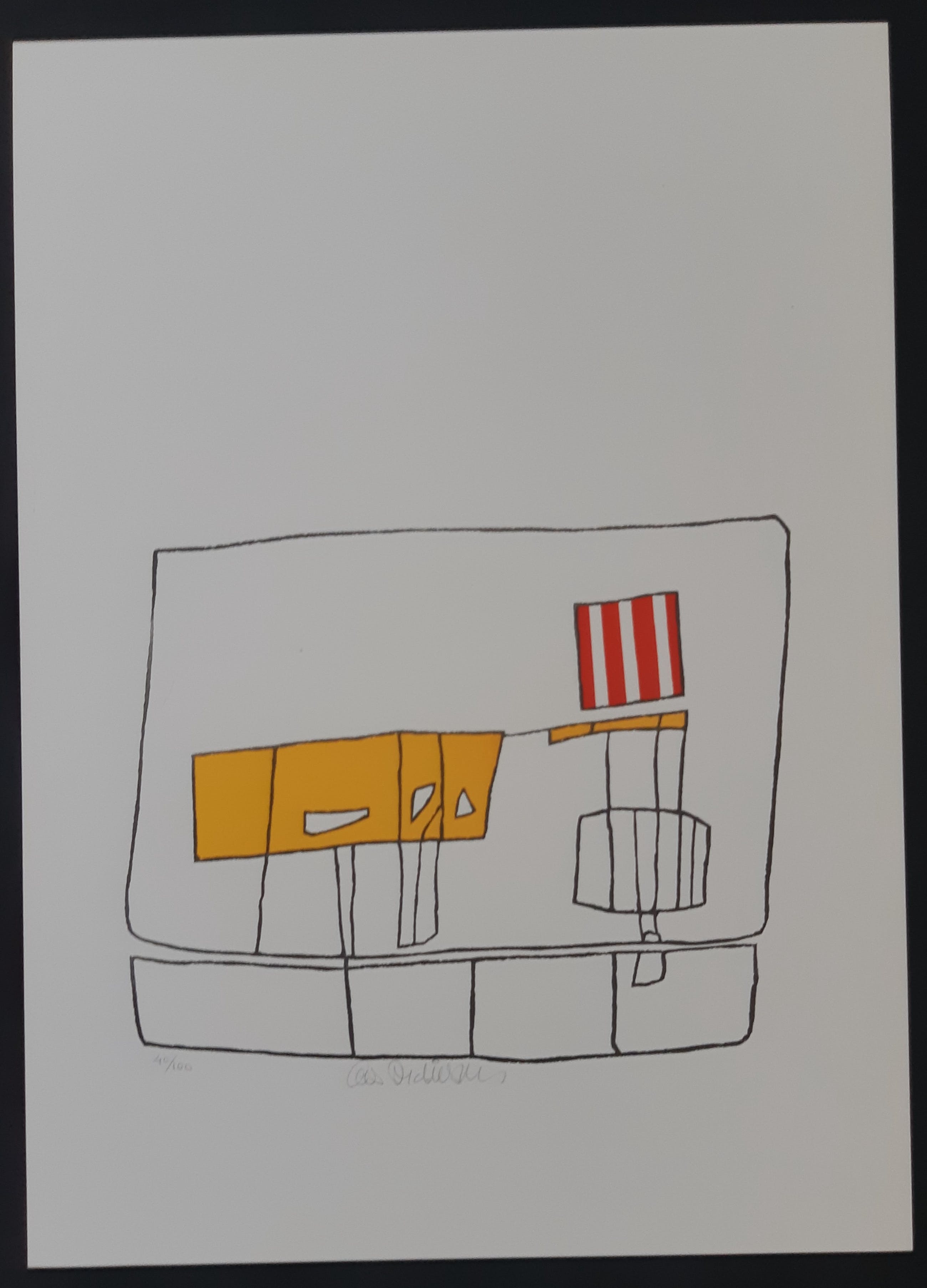 Portfolio met 6 linosnedes van Cees Andriessen. De bladen meten 42 x 30 cm, de afbeeldingen zijn ongeveer 19 x 23 cm. Alle bladen zijn gesigneerd en genummerd 40 / 100. Met titelblad en colofon. De conditie van het geheel is uitstekend.