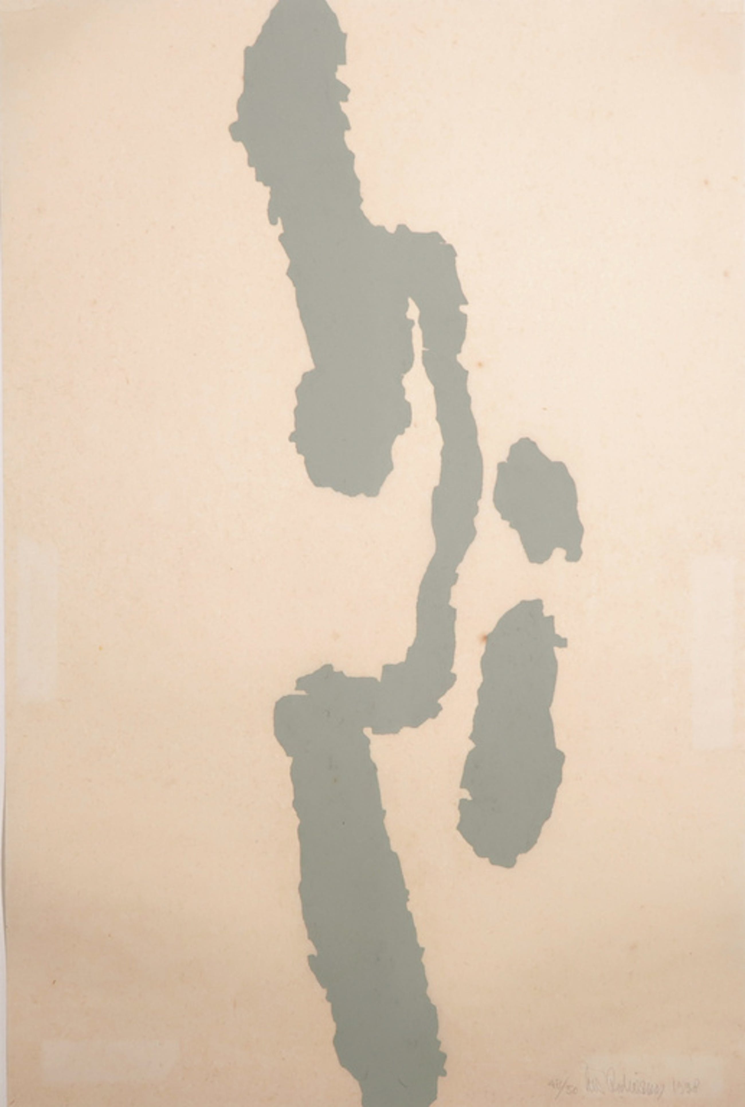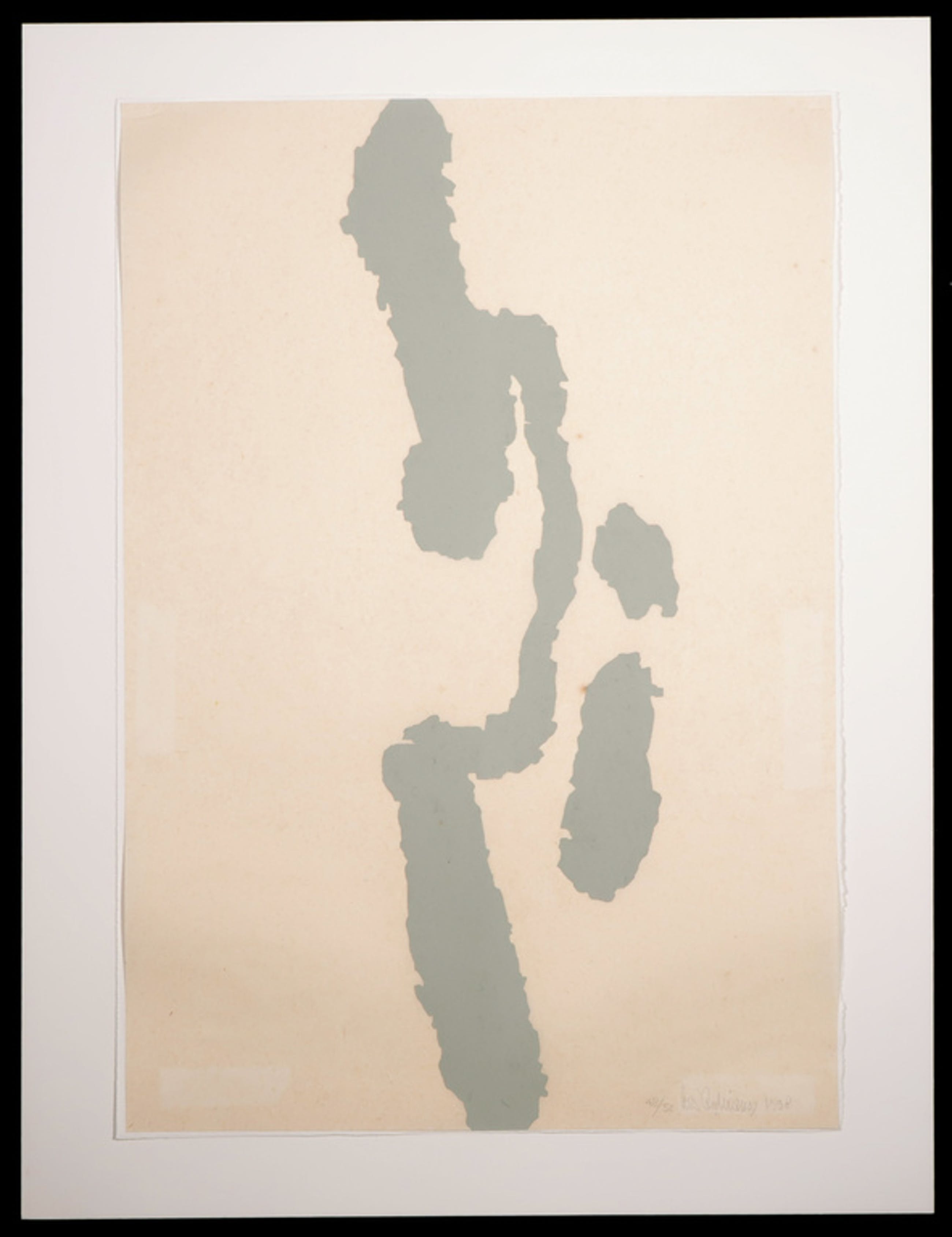 Materiaal: Zeefdruk op zeer dungeschept papier, geplakt op stevig onderblad