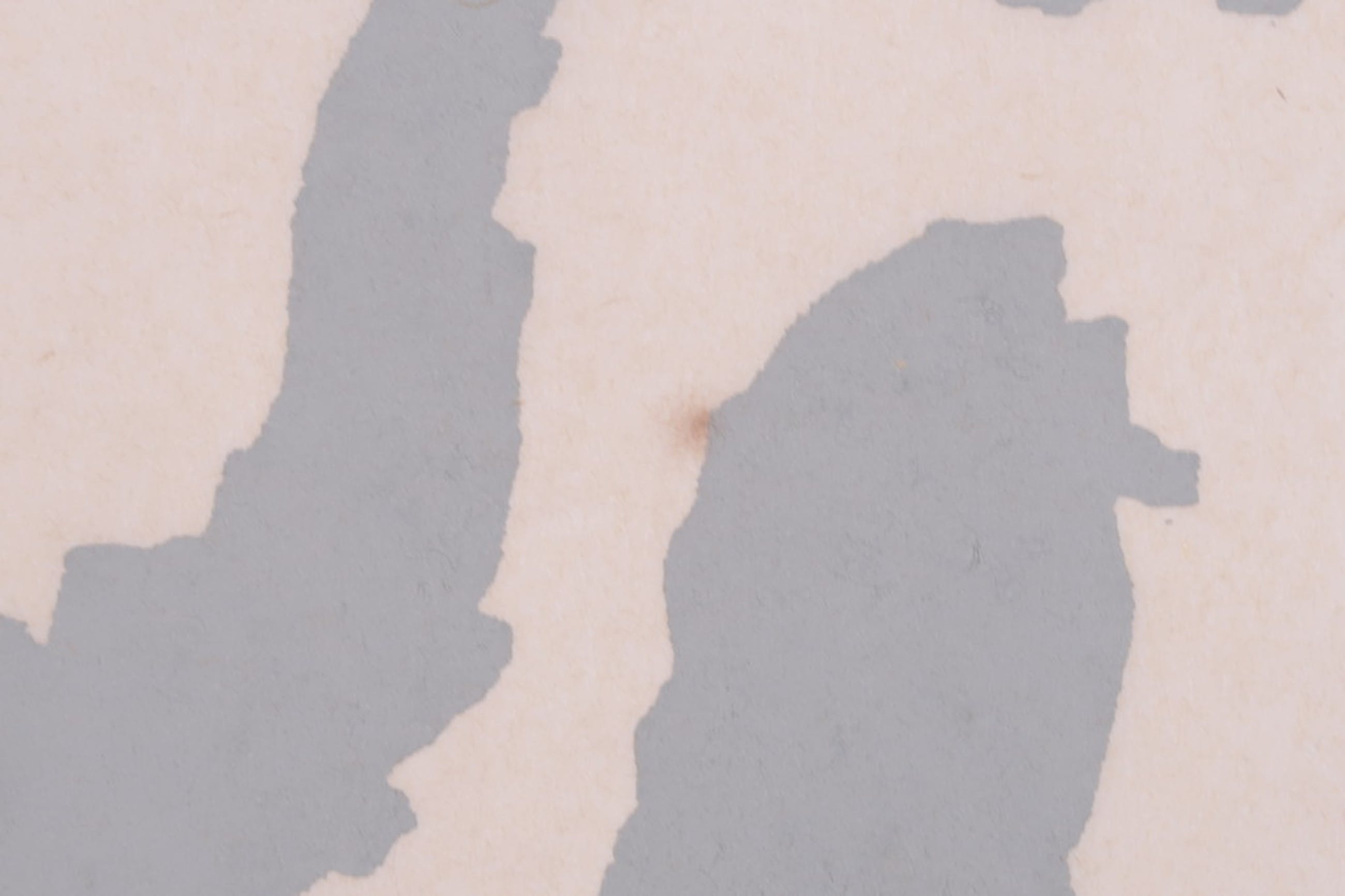 Conditie: In redelijke staat. Het beeld bevat enkele verkleuringen door tape aan de achterzijde en bevat een paar oxidatievlekjes. Het onderblad is licht beschadigd in de linkeronderhoek. Het blad met gedicht is vervaagd, waardoor deze moeilijk leesbaar is geworden.
