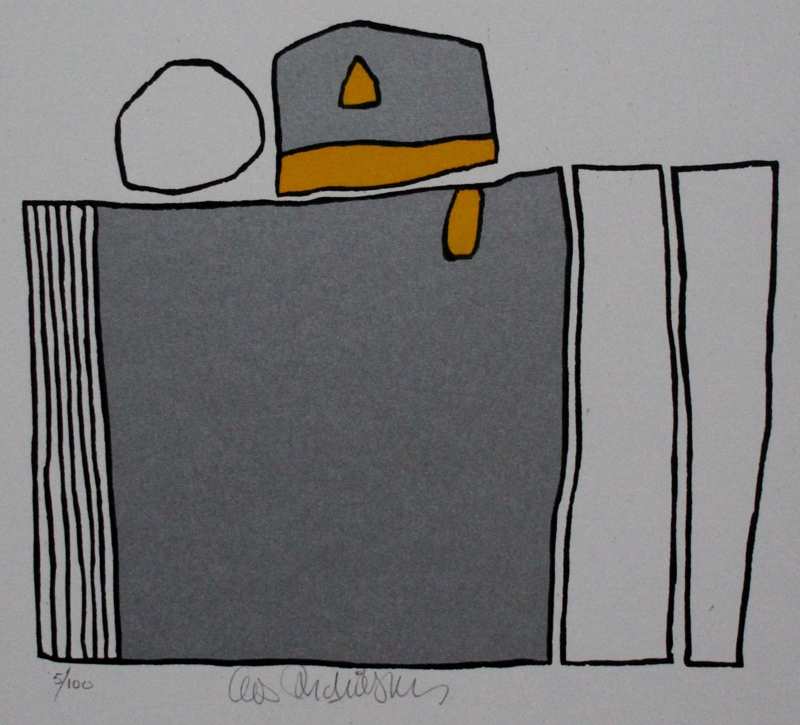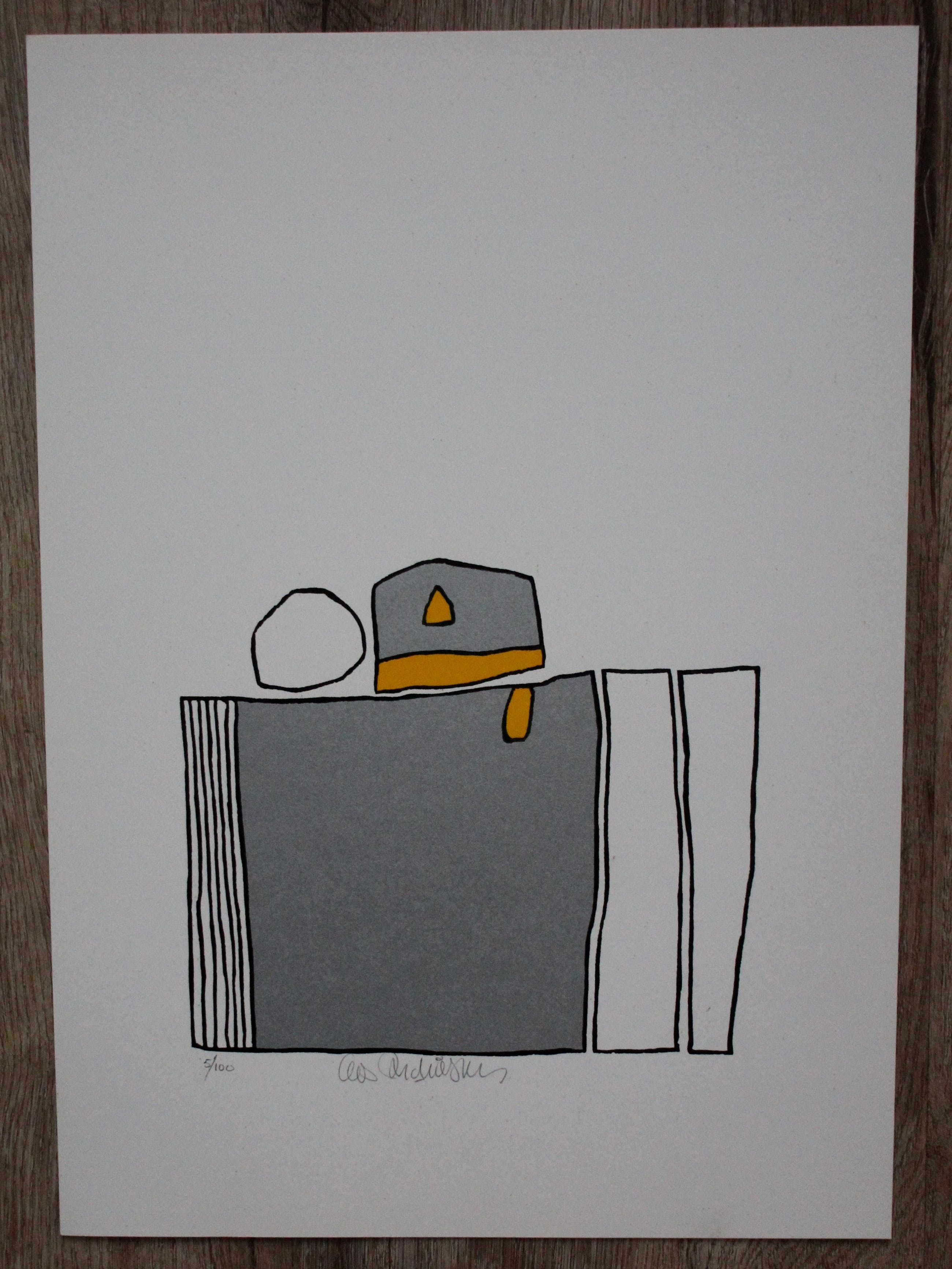 Linosnede van Cees Andriessen uit 1974. Titel: Bollewop . Nummer: 5/100. Midden onder met potlood gesigneerd door de kunstenaar. Afmetingen blad: H42 x b 30 cm. Afmetingen voorstelling: H18 x b20cm. De authenticiteit van dit werk wordt volledig gegarandeerd. Een certificaat van echtheid kan, op verzoek, worden gemaild.