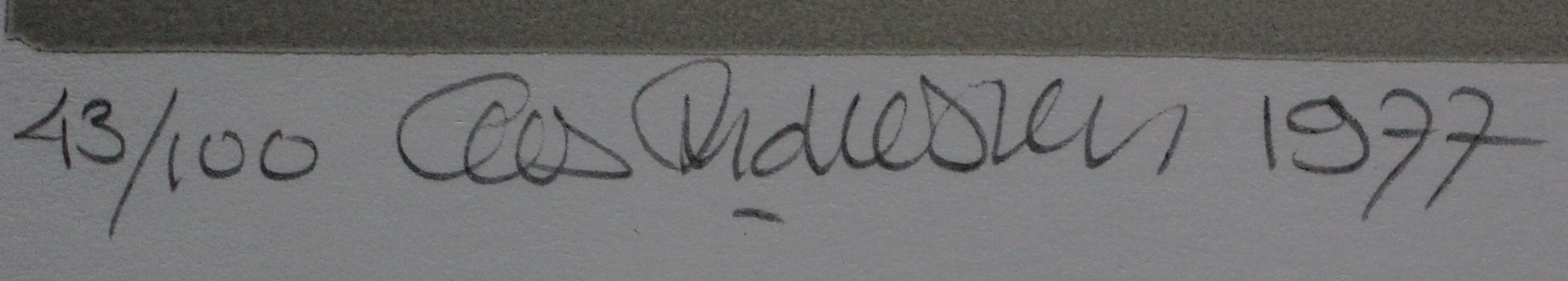 Linosnede/prägedruk van Cees Andriessen uit 1977. Oplage: 43/100. Afmetingen blad: H40 x b53.5cm. Afmetingen voorstelling: H30 x b43.5cm. Het werk is links onderaan, met potlood, gesigneerd door de kunstenaar. De authenticiteit van dit werk wordt volledig gegarandeerd. Een certificaat van echtheid kan, op verzoek, worden gemaild.