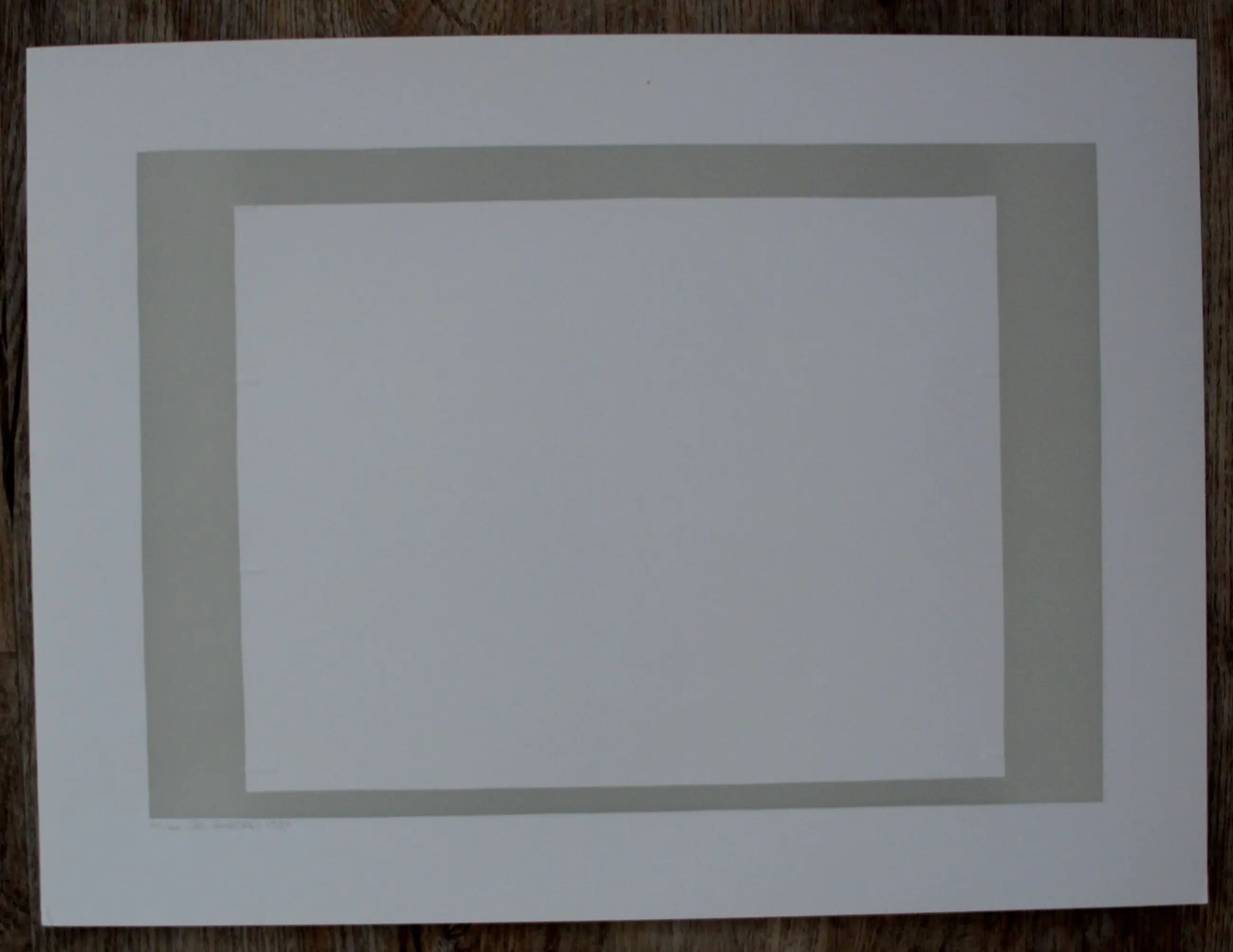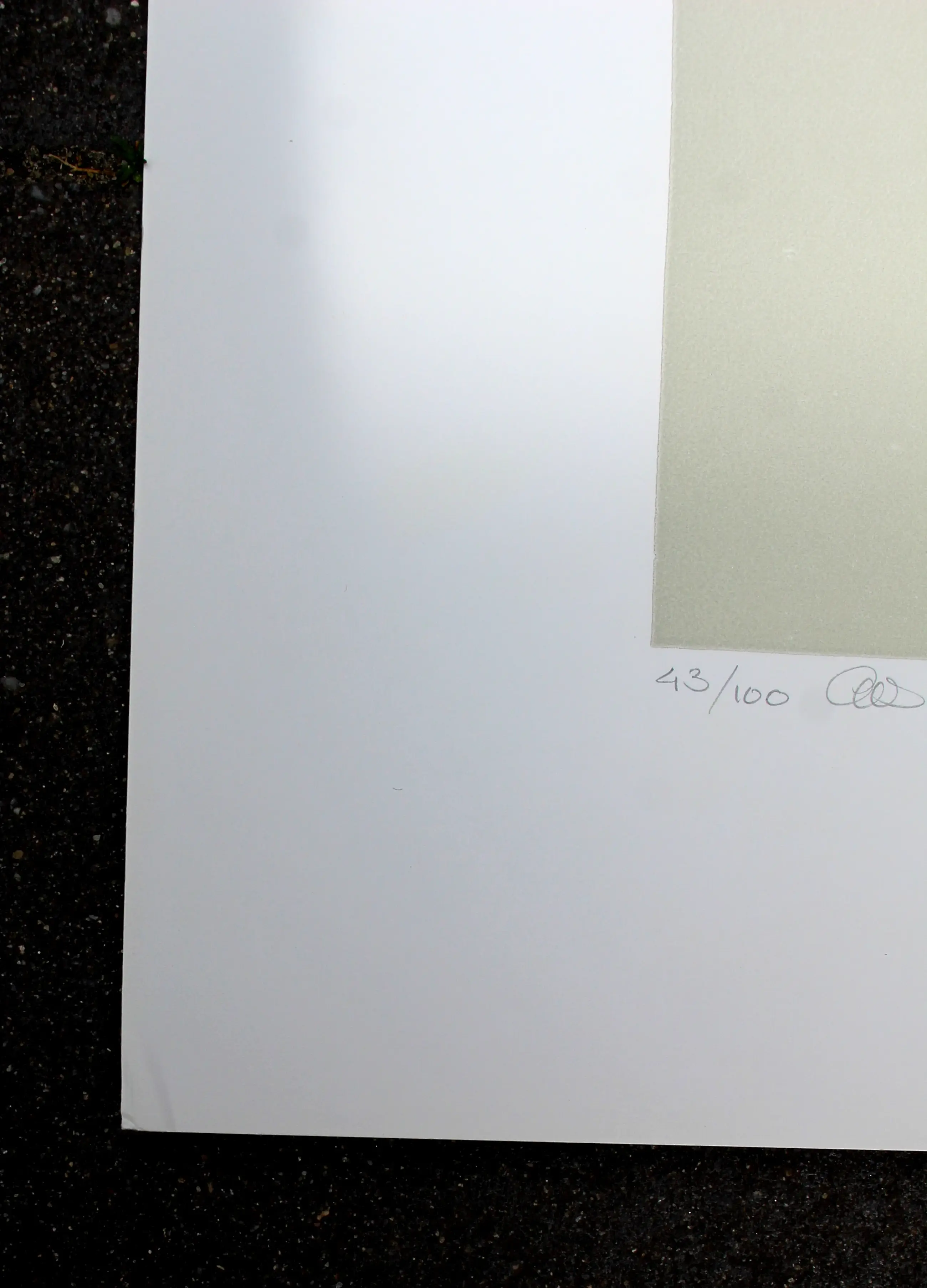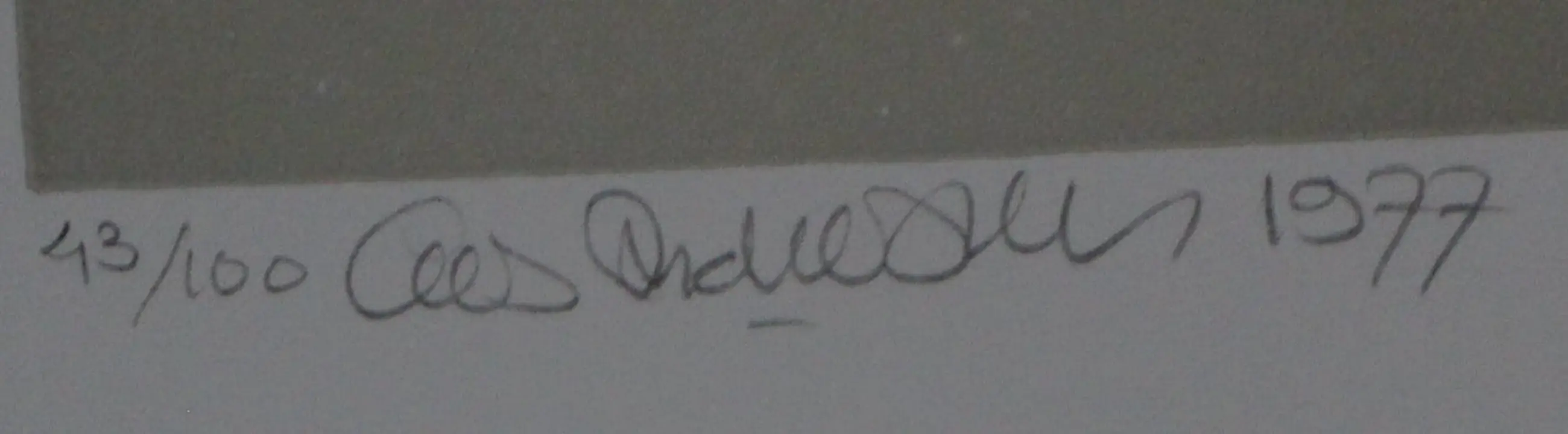 Linosnede/prägedruk van Cees Andriessen uit 1977. Aan beide zijde in het witte vlak zitten 4 "opgehoogde" witte streepjes van 1cm. Deze 4 streepjes zijn dus aan zowel de linker als rechterzijde verdeeld over de linker en rechter zijkant. Deze zijn op de foto lastig waar te nemen. Op het andere werk wat ik aanbied zijn de streepjes weer anders. Dit maakt het onderscheid tussen de werken uit deze serie. Afmetingen blad: H40 x b53.5cm. Afmetingen voorstelling: H30 x b43.5cm. Het werk is links onderaan, met potlood, gesigneerd door de kunstenaar. De authenticiteit van dit werk wordt volledig gegarandeerd. Een certificaat van echtheid kan, op verzoek, worden gemaild.