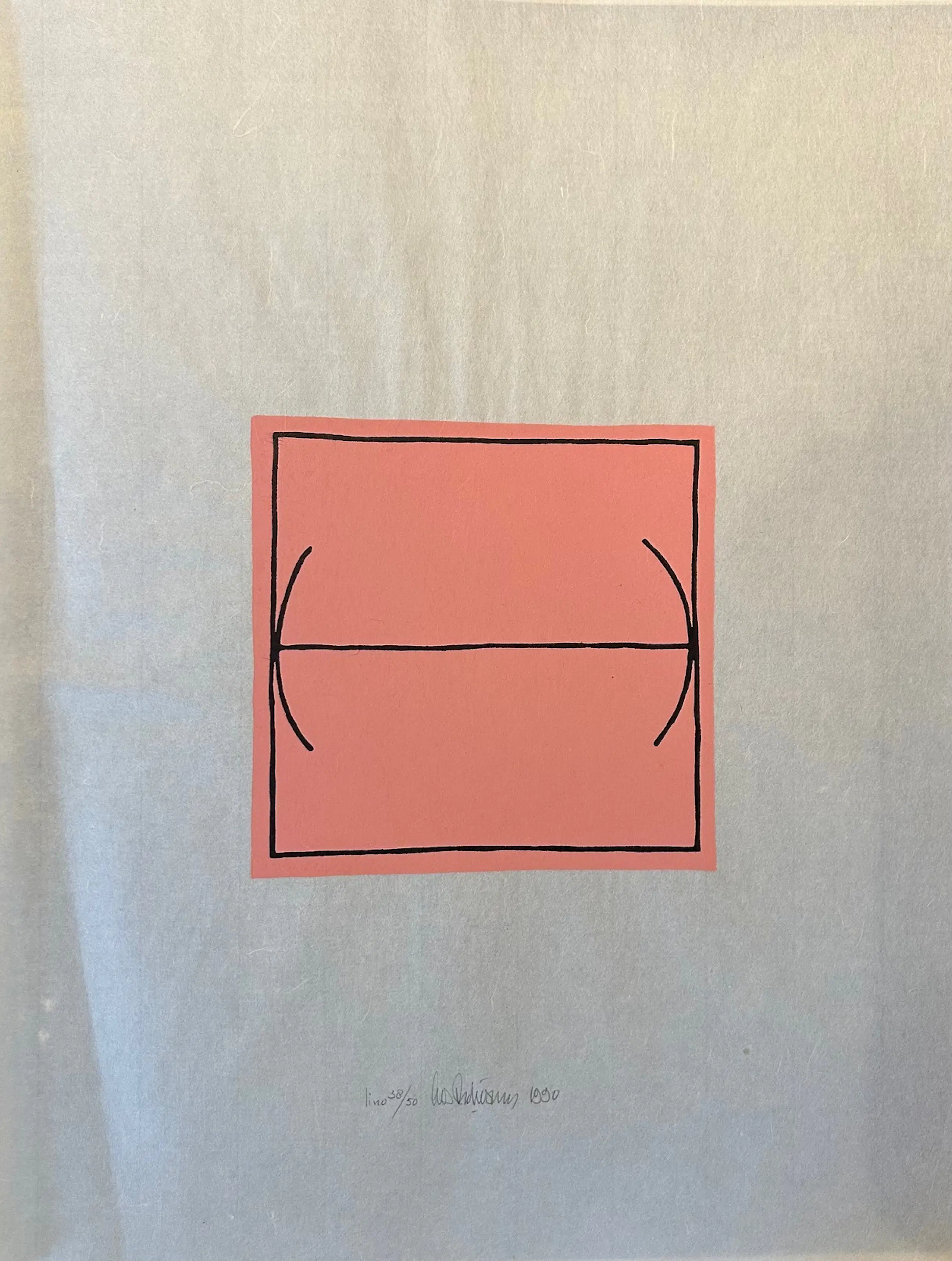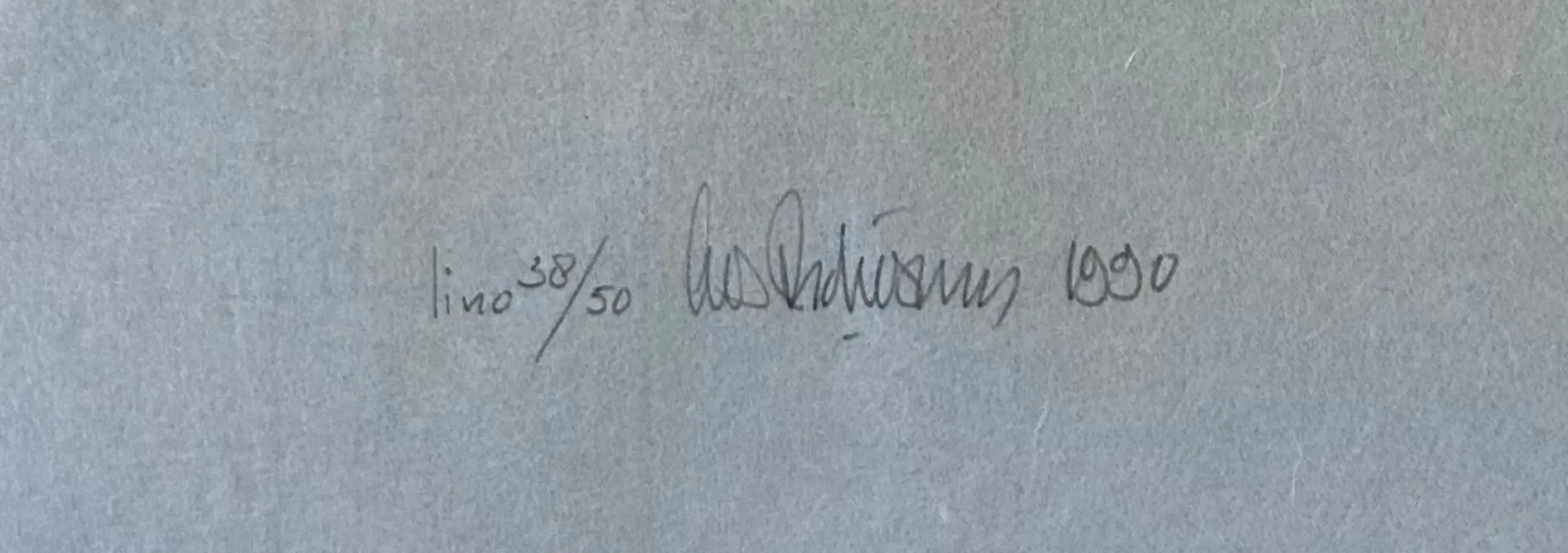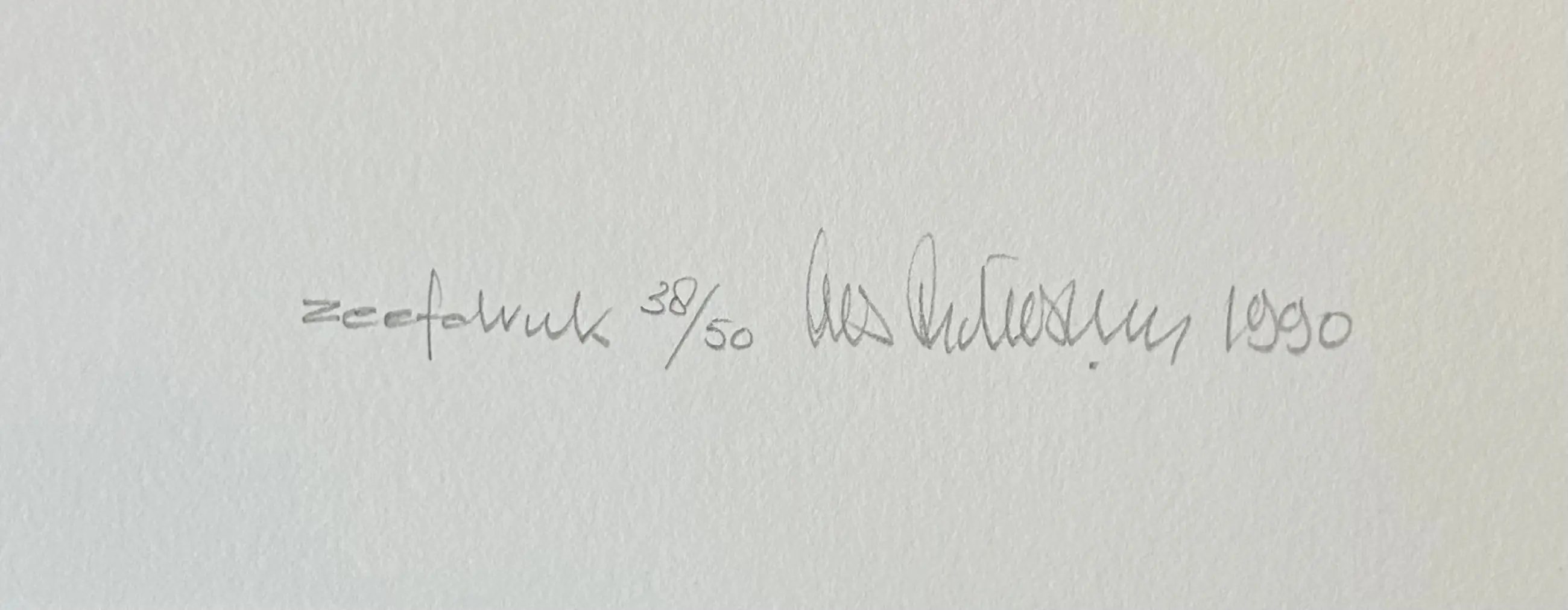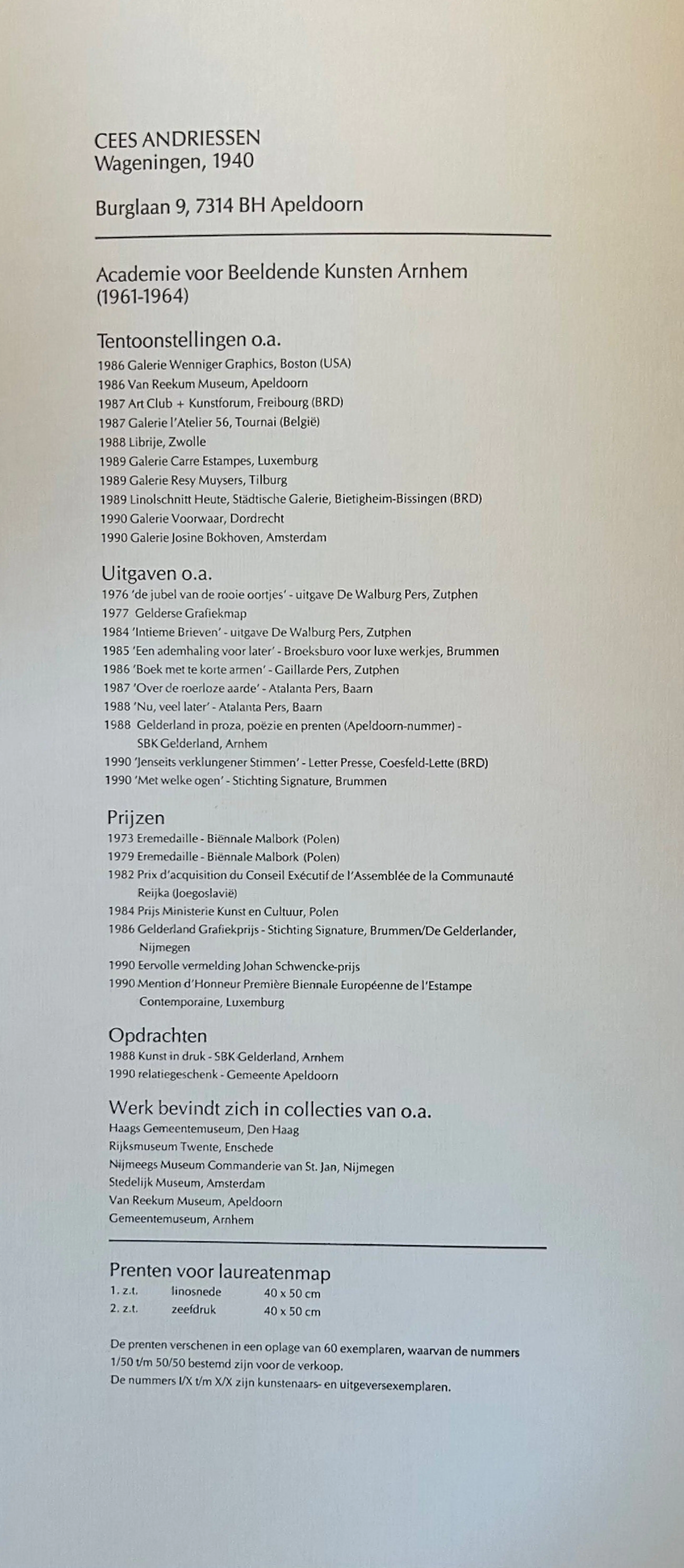 De lino en de zeefdruk in het zwarte omslag uit de Map De Laureaten met de eerste vijf winnaars van de Gelderse Grafiekprijs, uitgegeven door Stichting Signature in 1991. Gesigneerd en genummerd door Cees Andriessen: respectievelijk "lino 38/50 Cees Andriessen 1990" en "zeefdruk 38/50 Cees Andriessen 1990". De lino is gedrukt op heel dun rijstpapier.