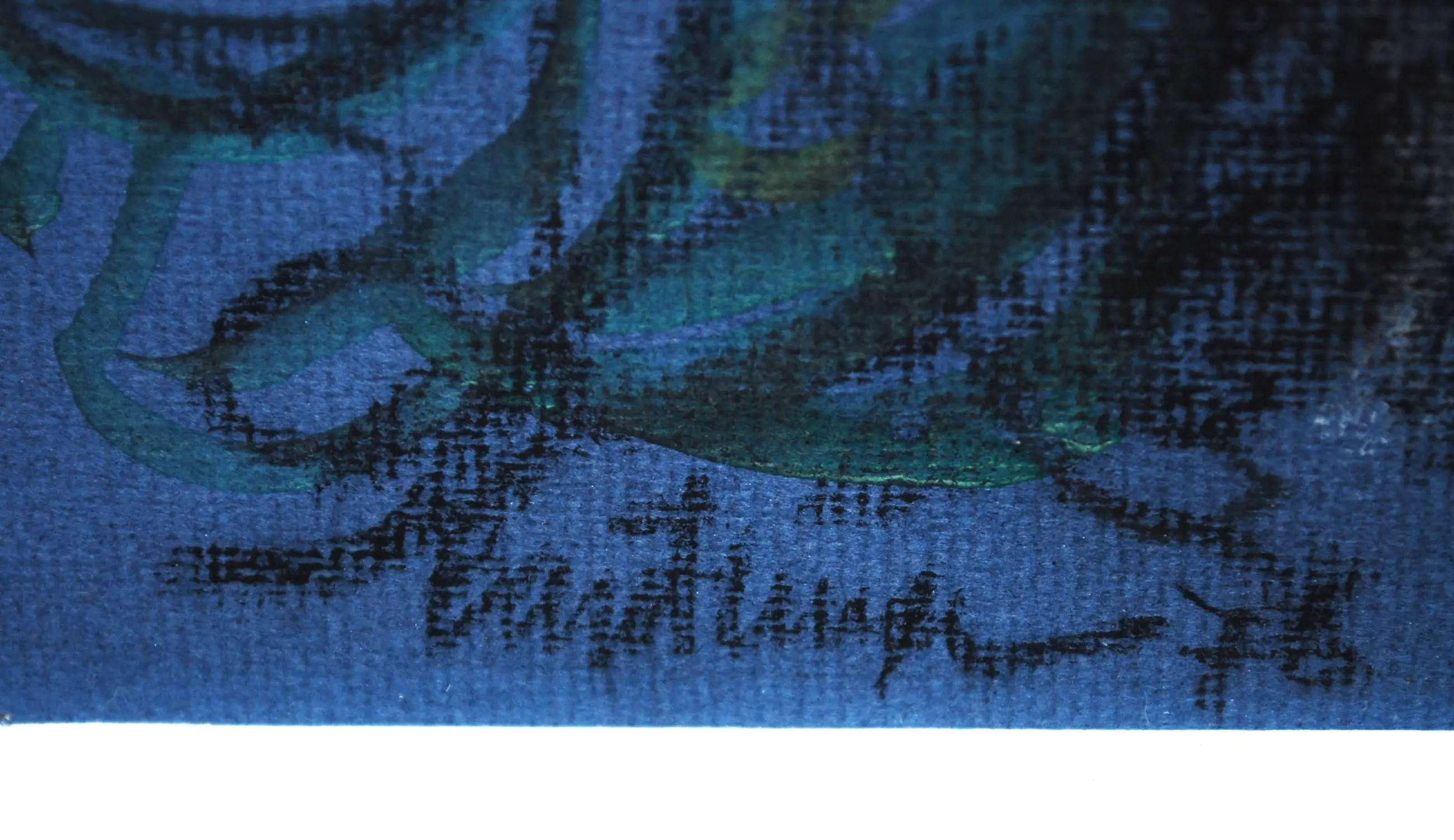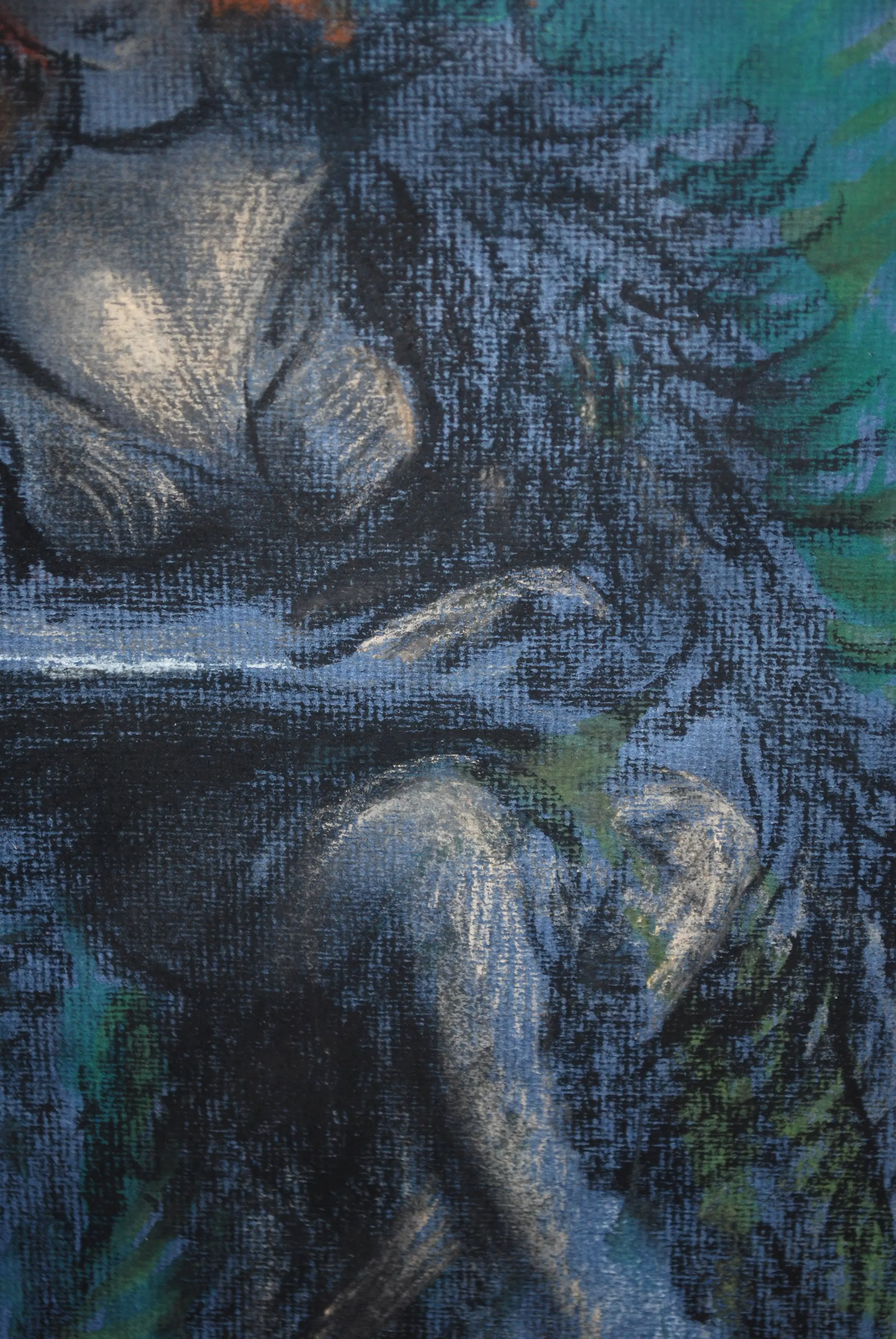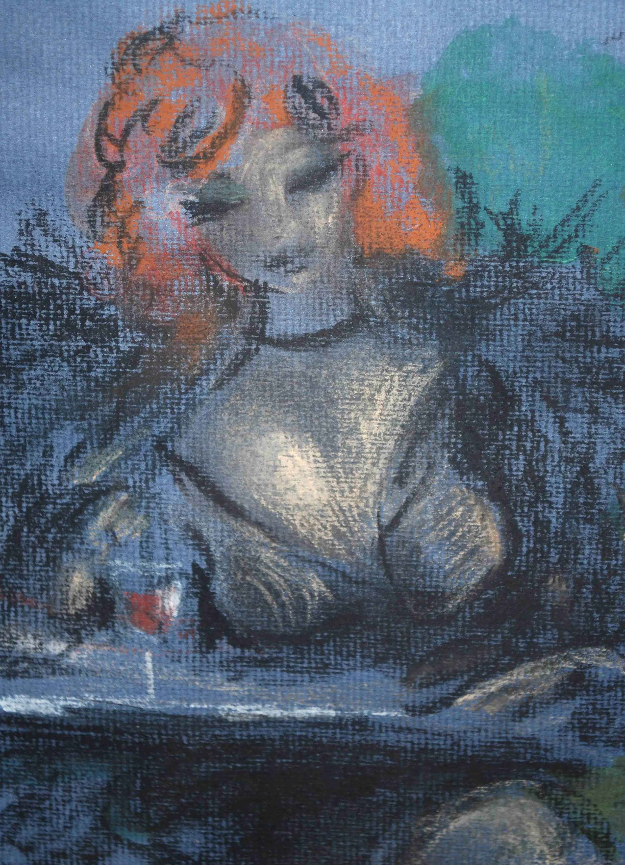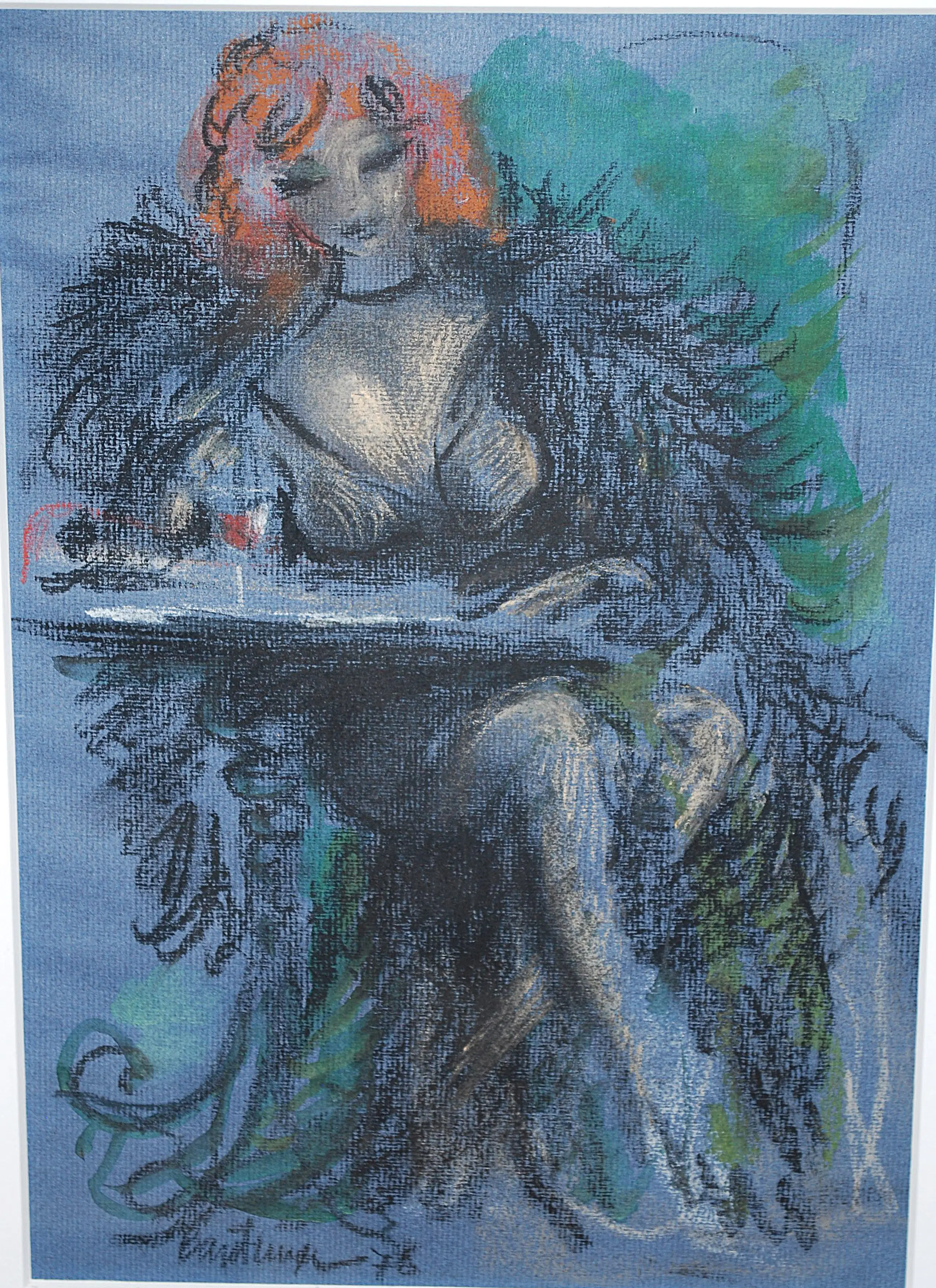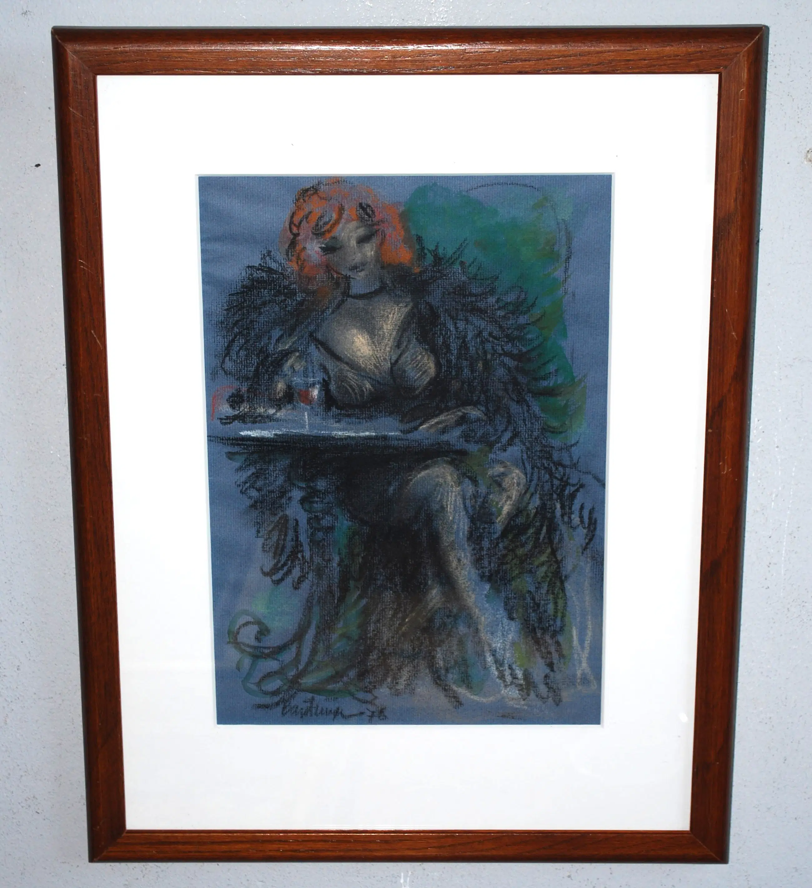 Gemengde techniek (krijt/gouache) op blauw papier. Maat binnen passepartout 27x19 cm. Gesigneerd l.o. en 76. Achter passepartout, in een fraaie (afgeronde) hardhouten lijst. Het geheel verkeert in uitstekende conditie.