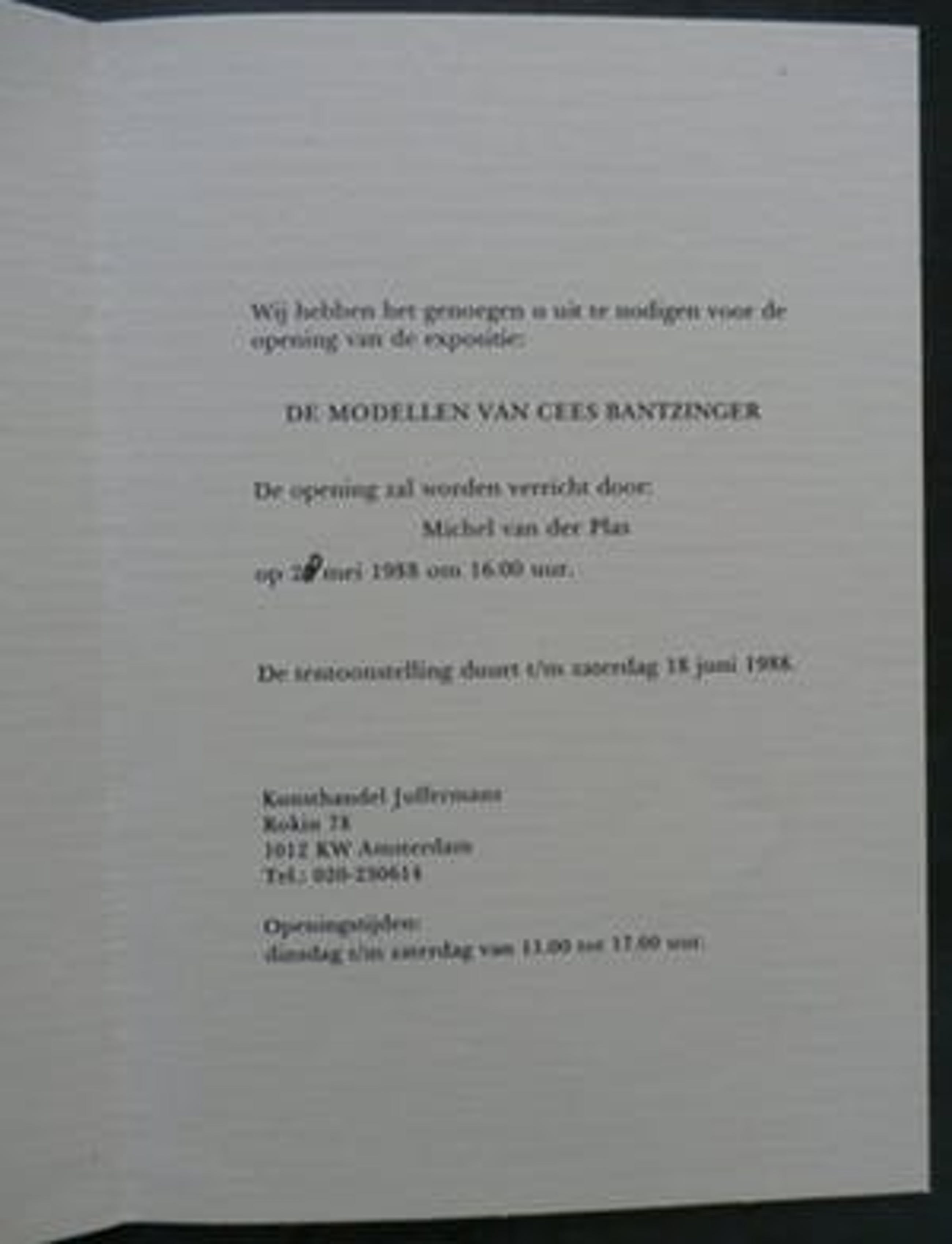 Uitnodiging voor een tentoonstelling bij Galerie Juffermans te Utrecht: De modellen van Cees Bantzinger. De tentoonstelling was van 28 mei 1988 t/m 18 juni 1988.