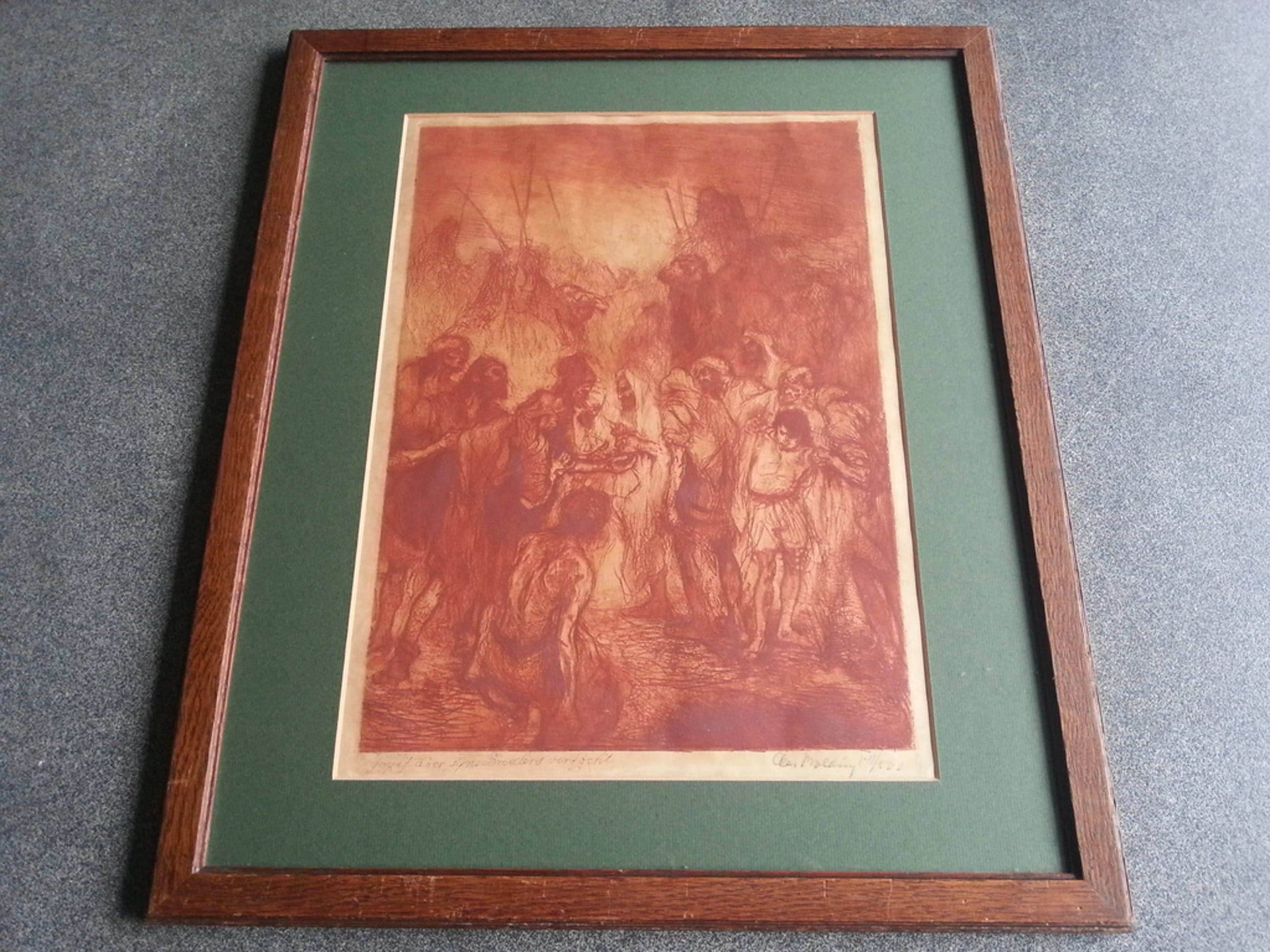 Cees Bolding. (1897-1979) ets. voorstelling met tekst: Josef door zijne broeders verkocht. oplage: 171/500. deze ets verkeert in perfecte staat gesigneerd in potlood. afm totaal: 40.5 cm bij 48 cm. beeldformaat inclusief witte randje: 26 cm bij 36 cm. verzendkostem binnen nederland: 6.75 euro.
