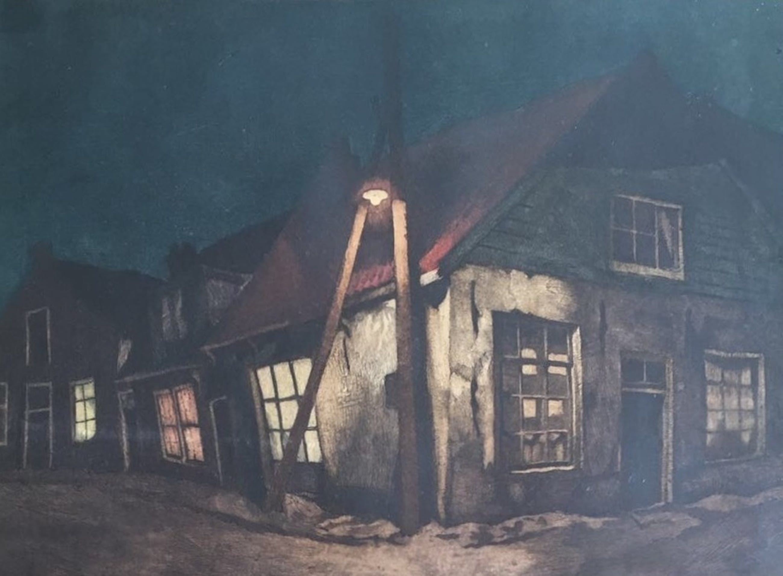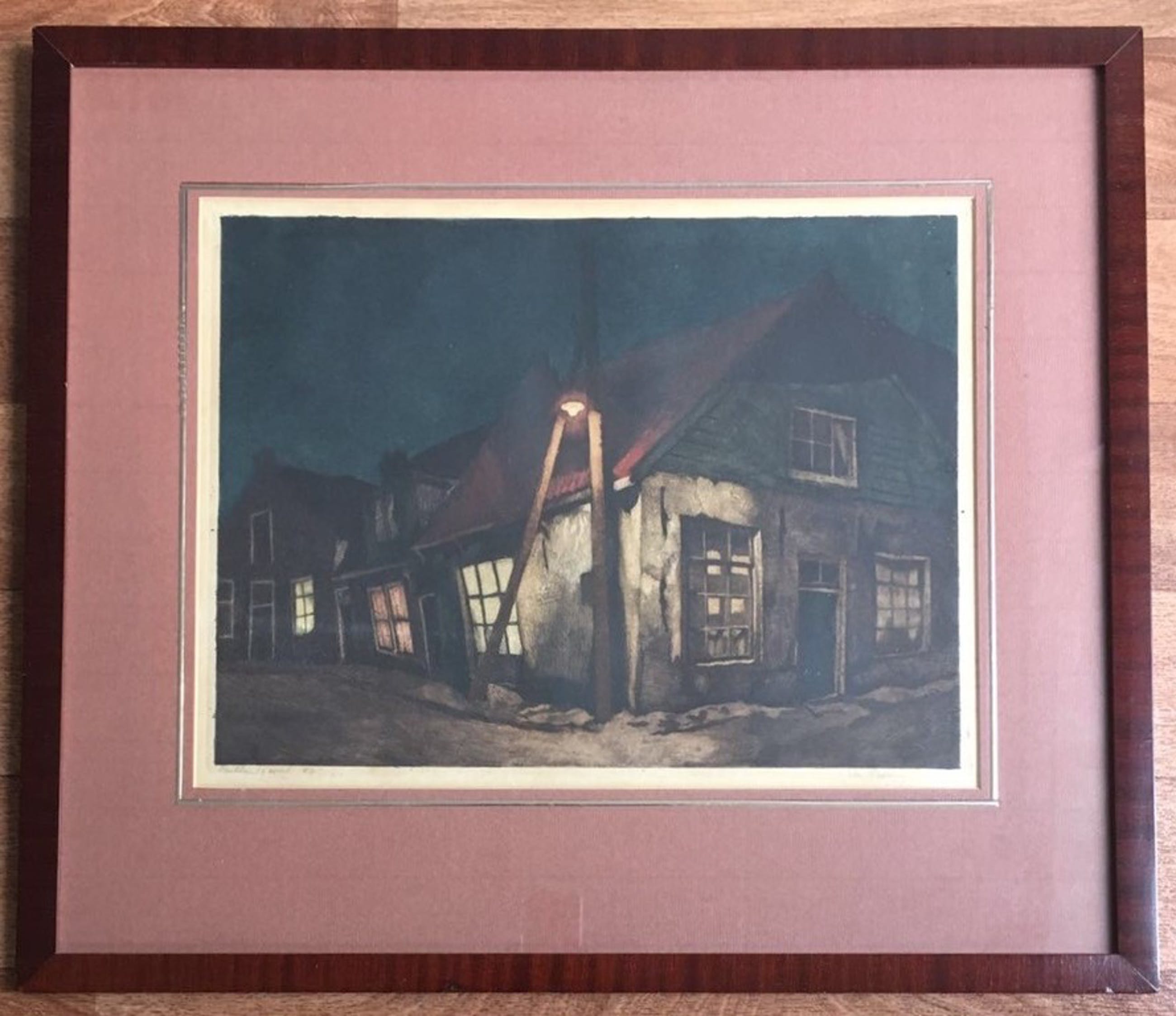 Leuke kleurets “Hoekhuis bij avond” in een oplage van 4/10. Ik vermoed een voorstelling ergens in de Zaanstreek. Oud gelijst. Beeldmaat 40 cm x 30,5 cm. Met potlood gesigneerd en betiteld.