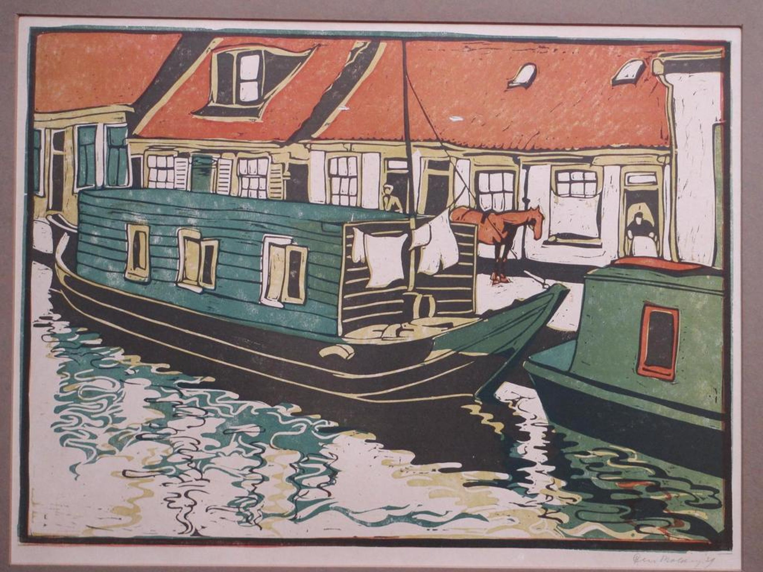 Voorstelling van een woonboot aan de kade met paard en figuren