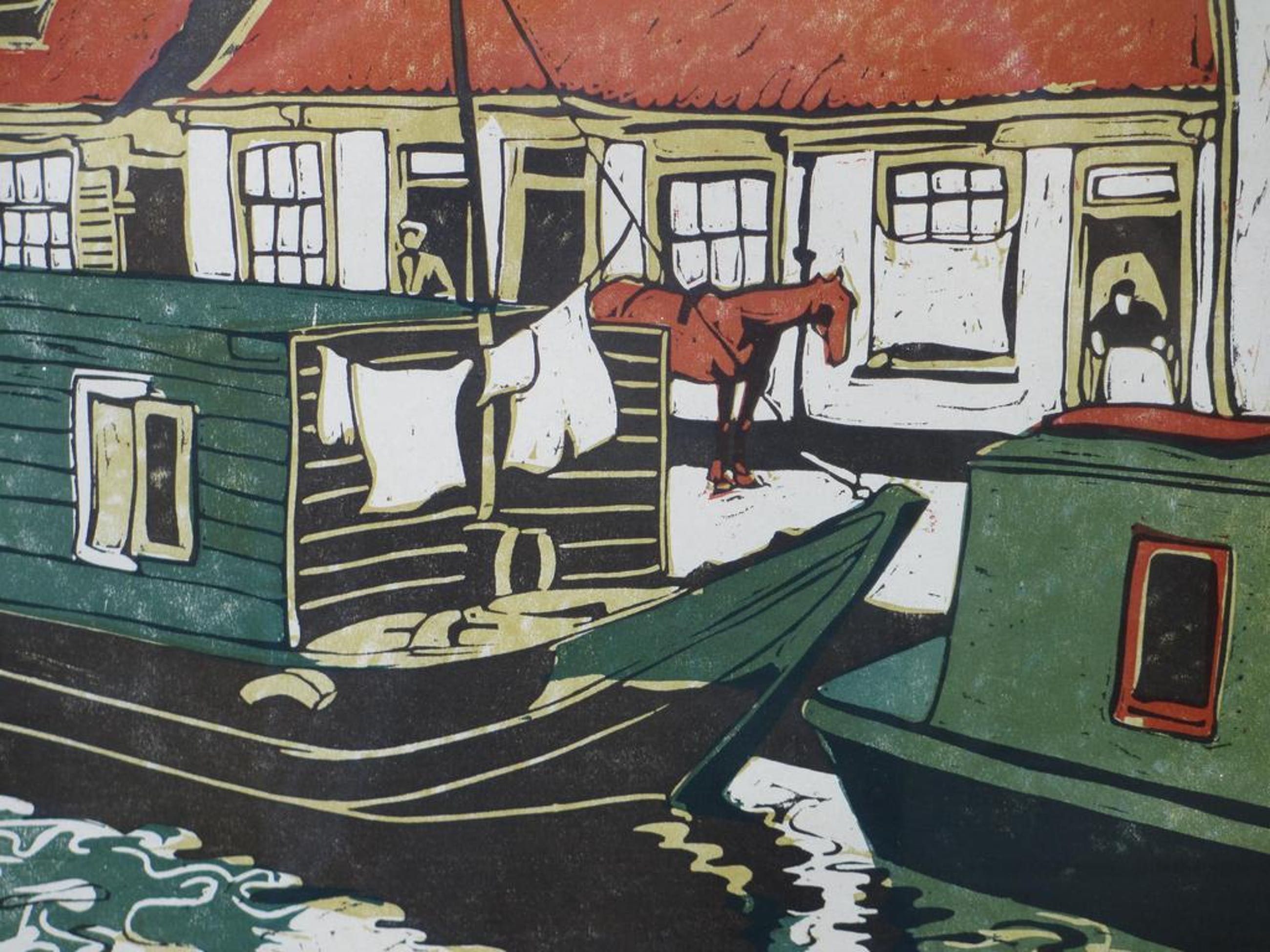 Voorstelling van een woonschuit aan de kade met figuren en paard.