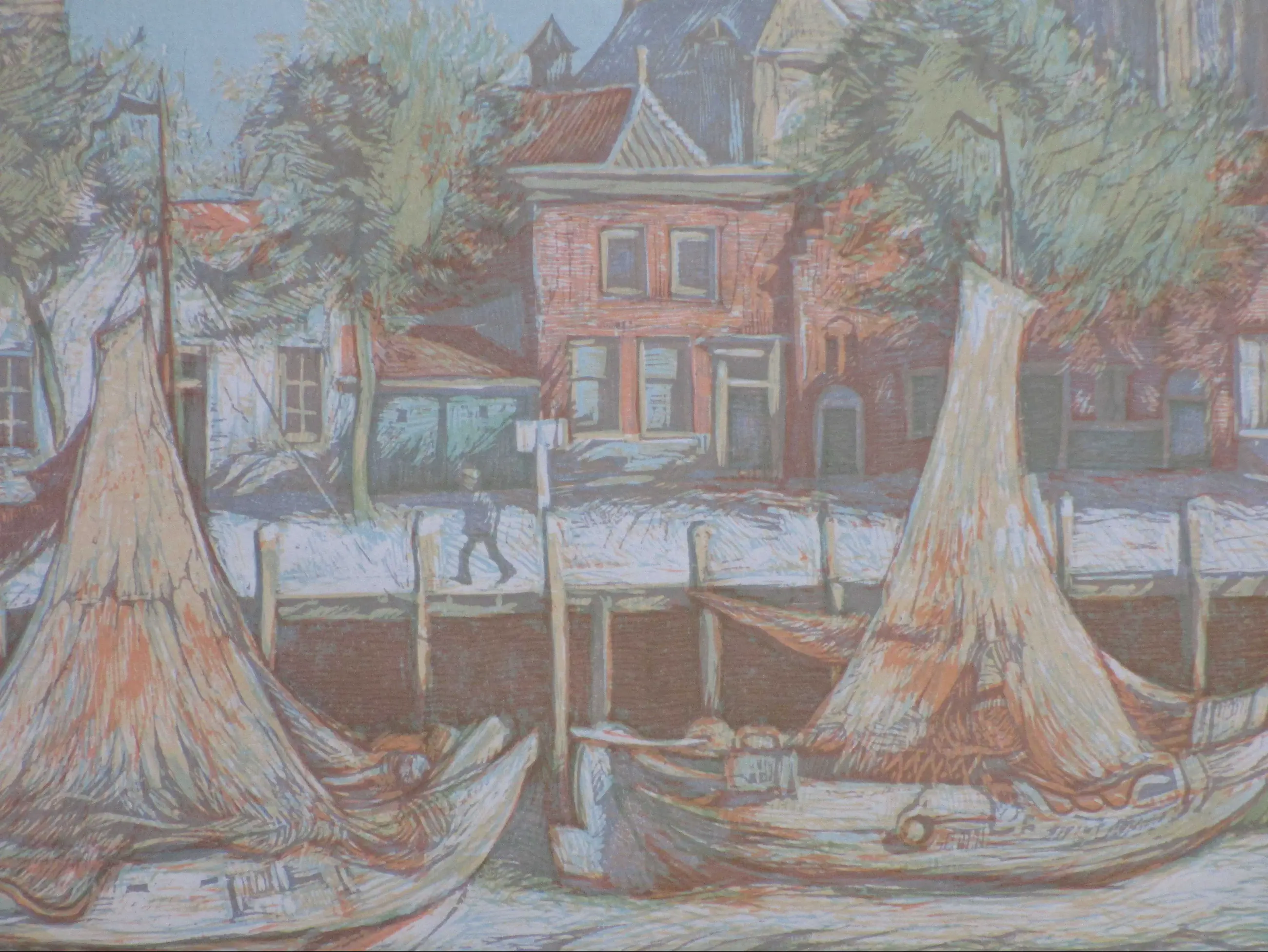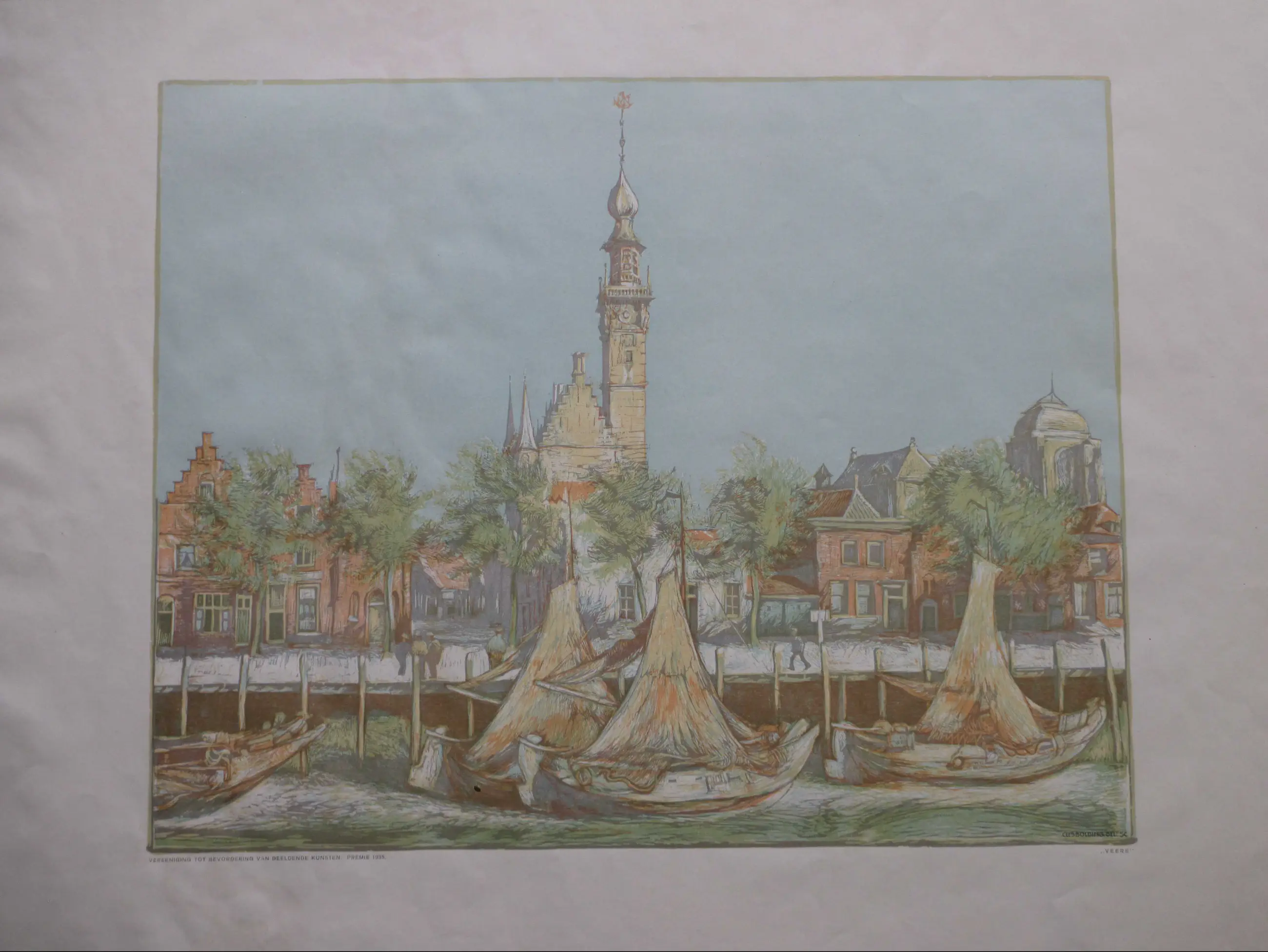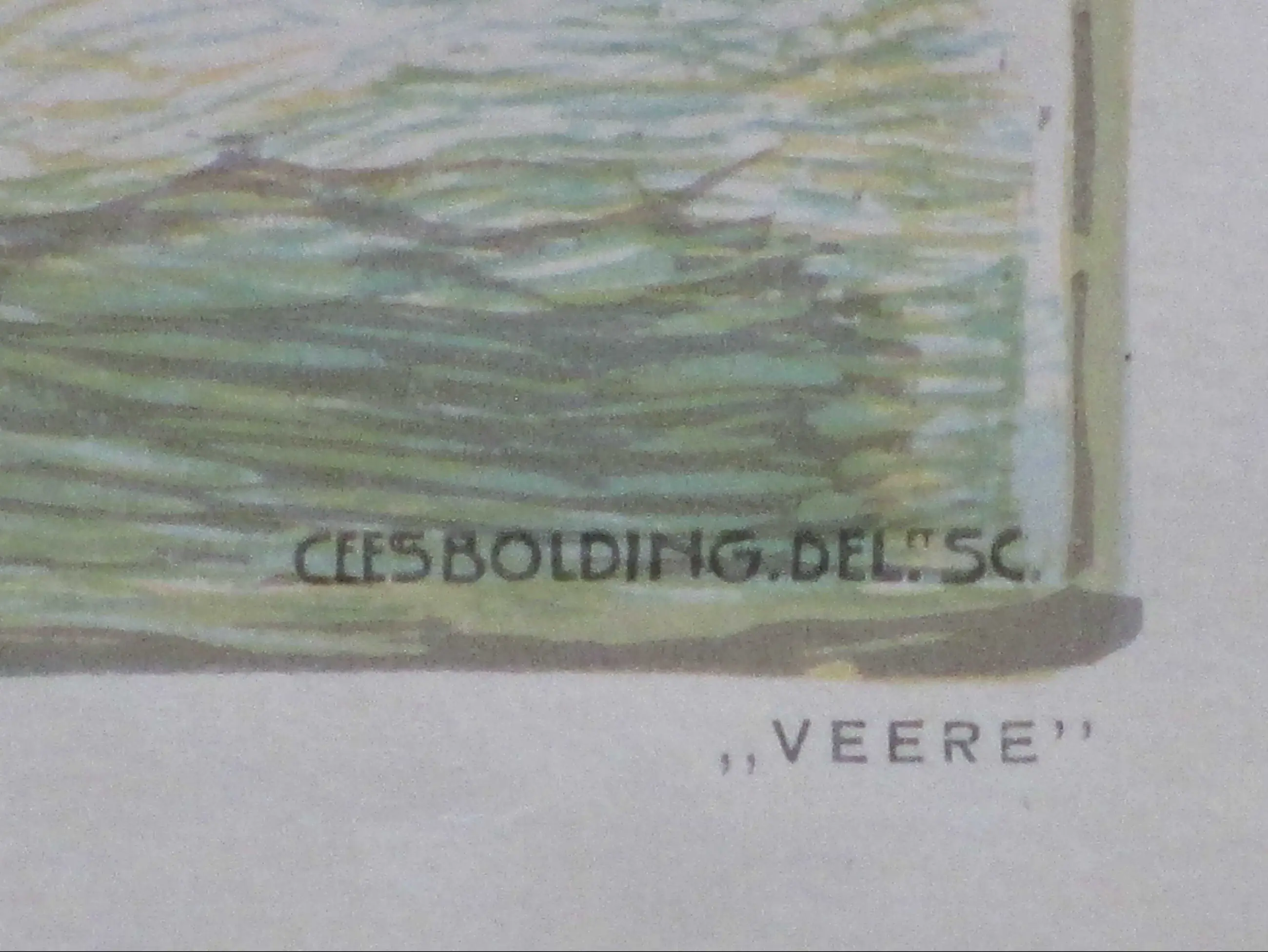 Kleurenlitho door Cees Bolding. Voorstelling van een gezicht op de haven, stadhuistoren en Grote Kerk van Veere. Losbladig, beeldmaat 35x43, bladmaat 48x63. Gesigneerd in de druk rechtsonder: 'Cees Bolding' Getiteld in de druk r.o.: Veere' Uitgave: Vereeniging tot Bevordering van Beeldende Kunsten 1935