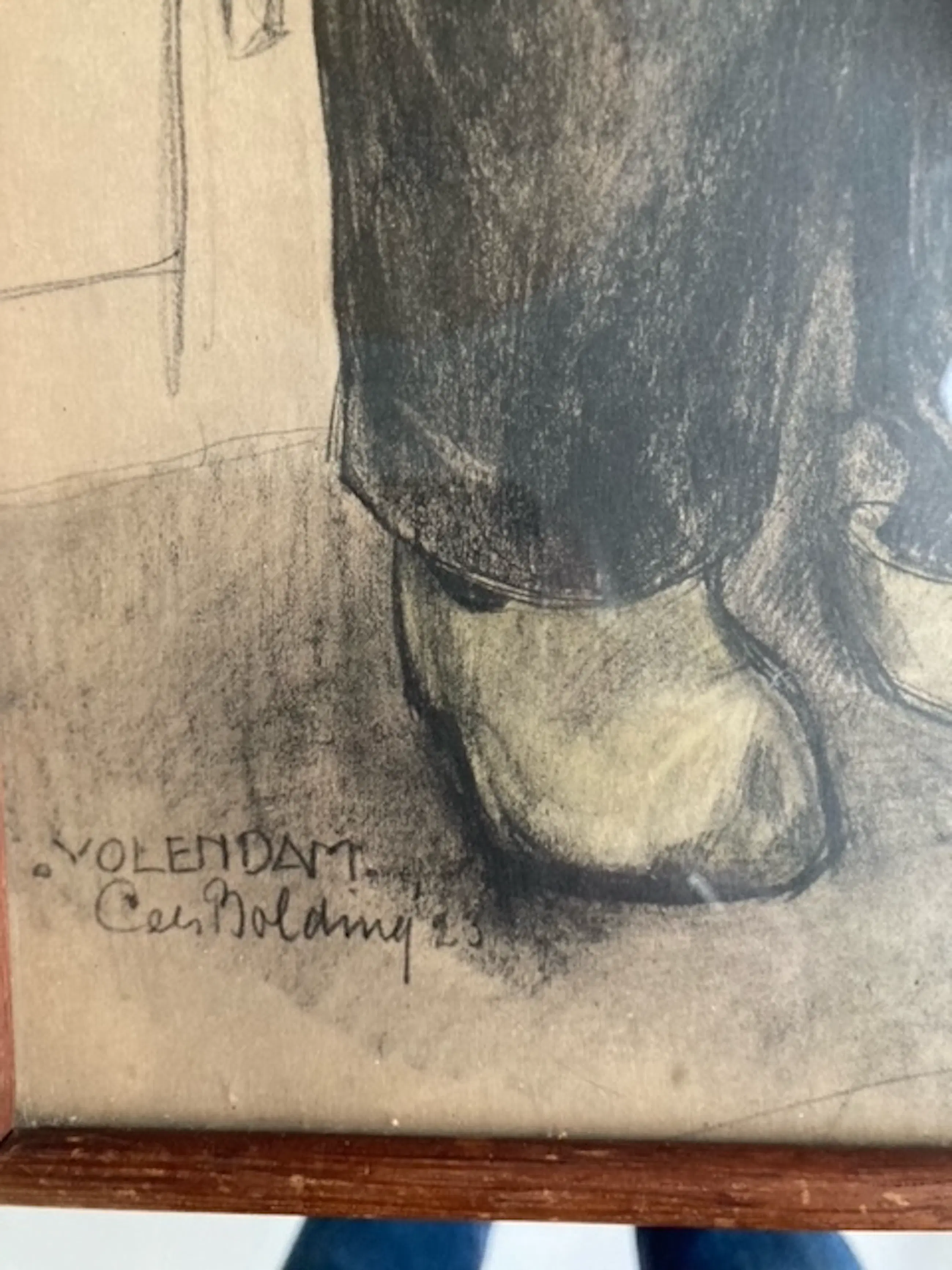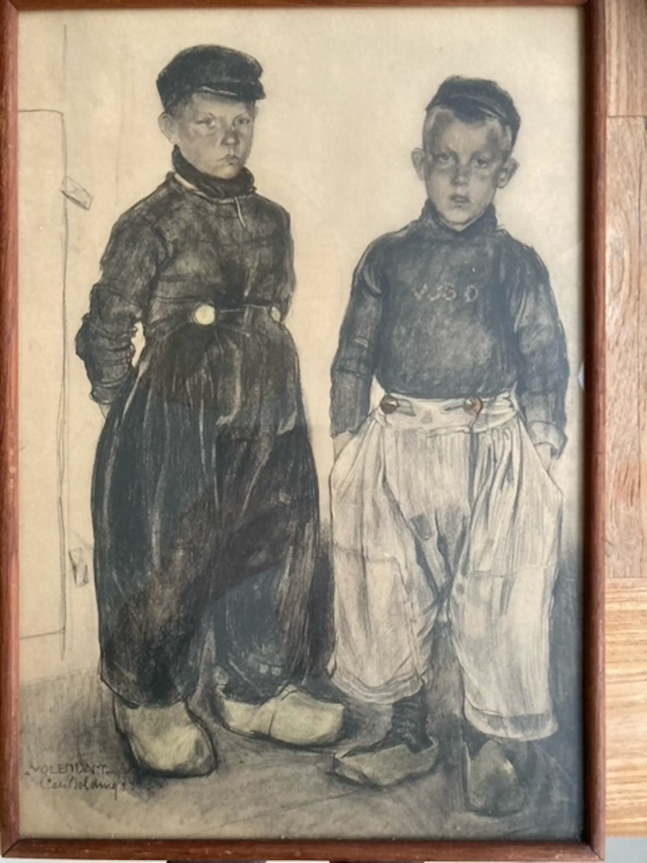 Gemengde technieken op papier, jongetjes in Volendamse klederdracht, is gesigneerd,