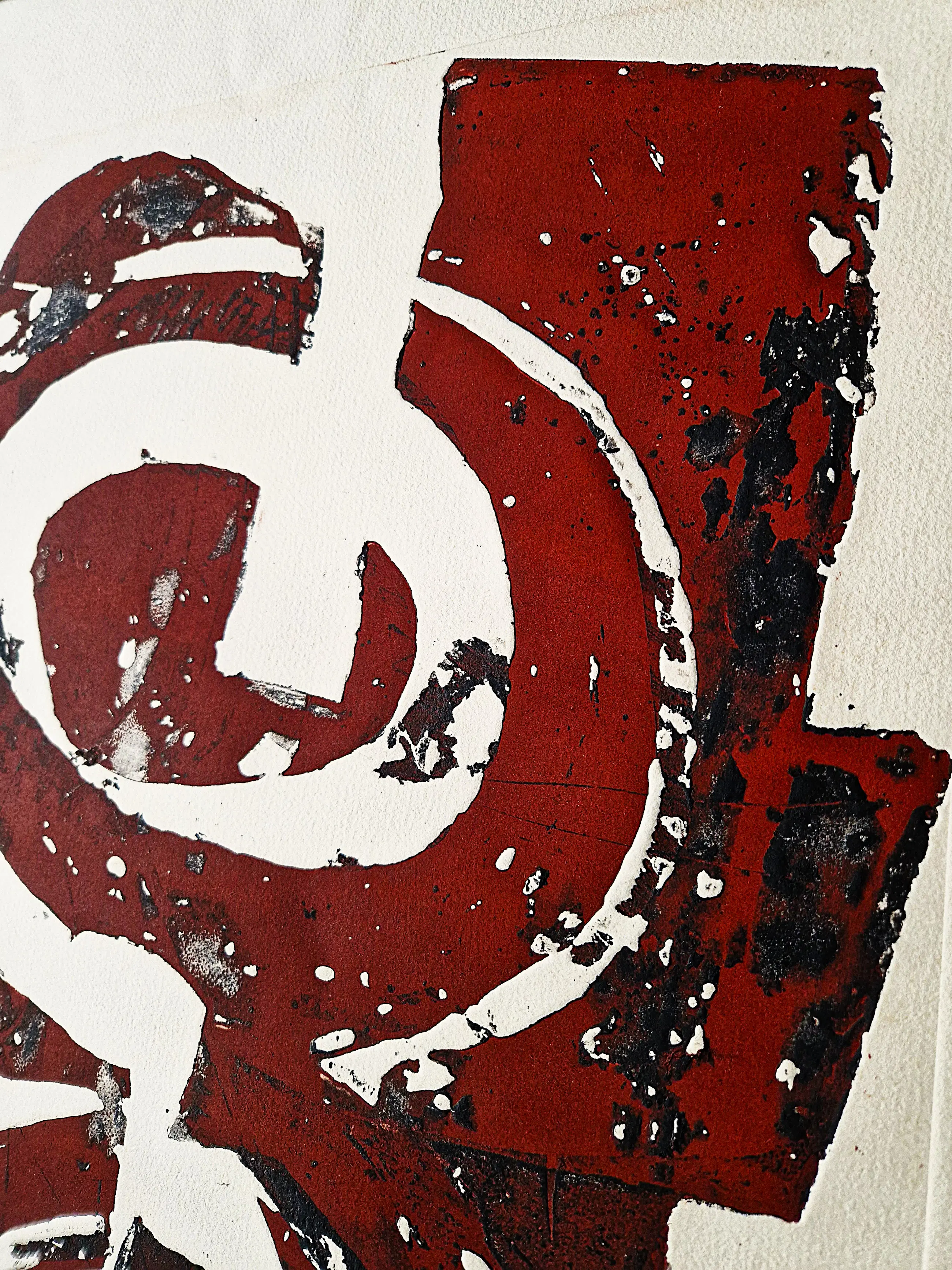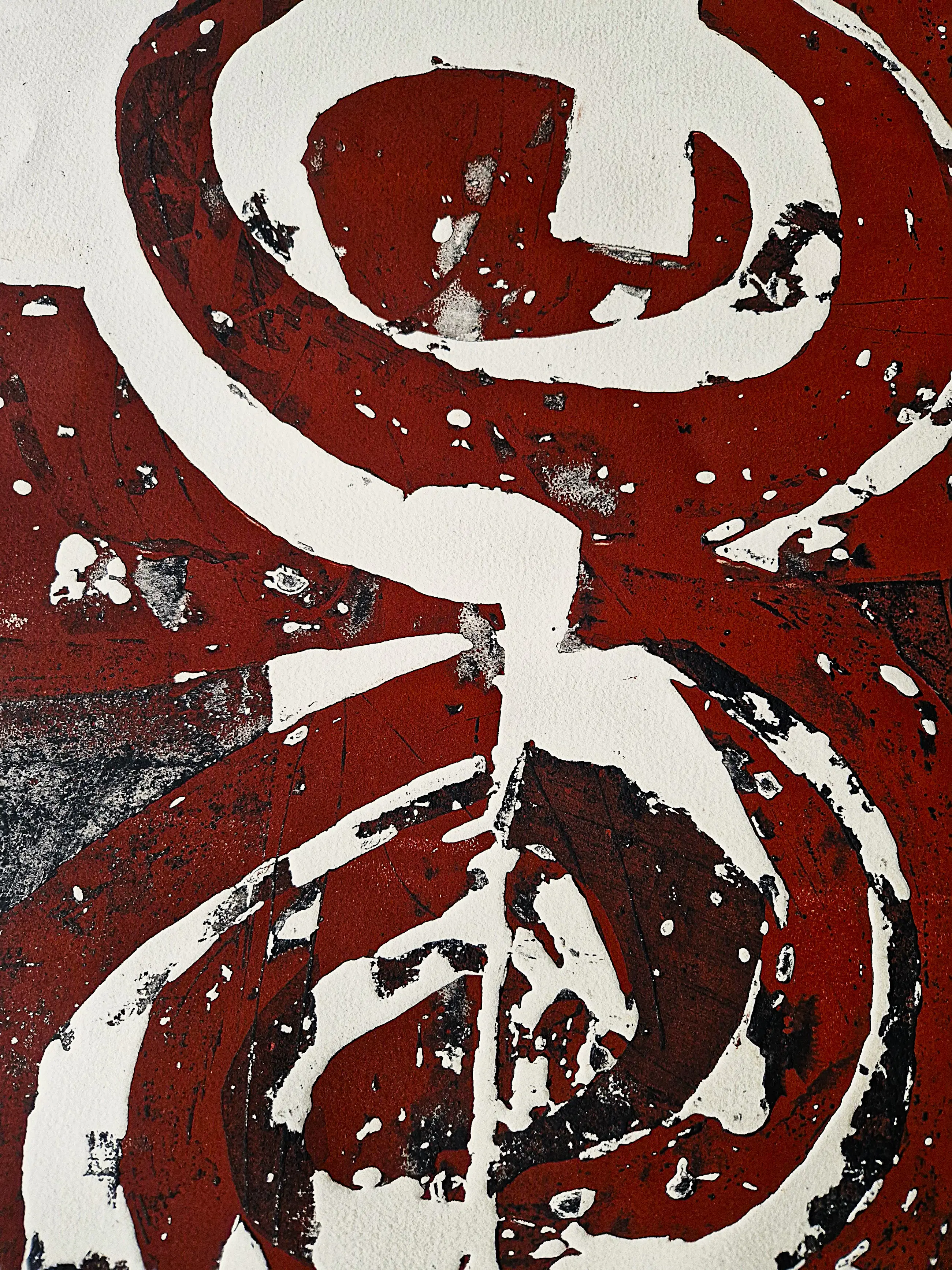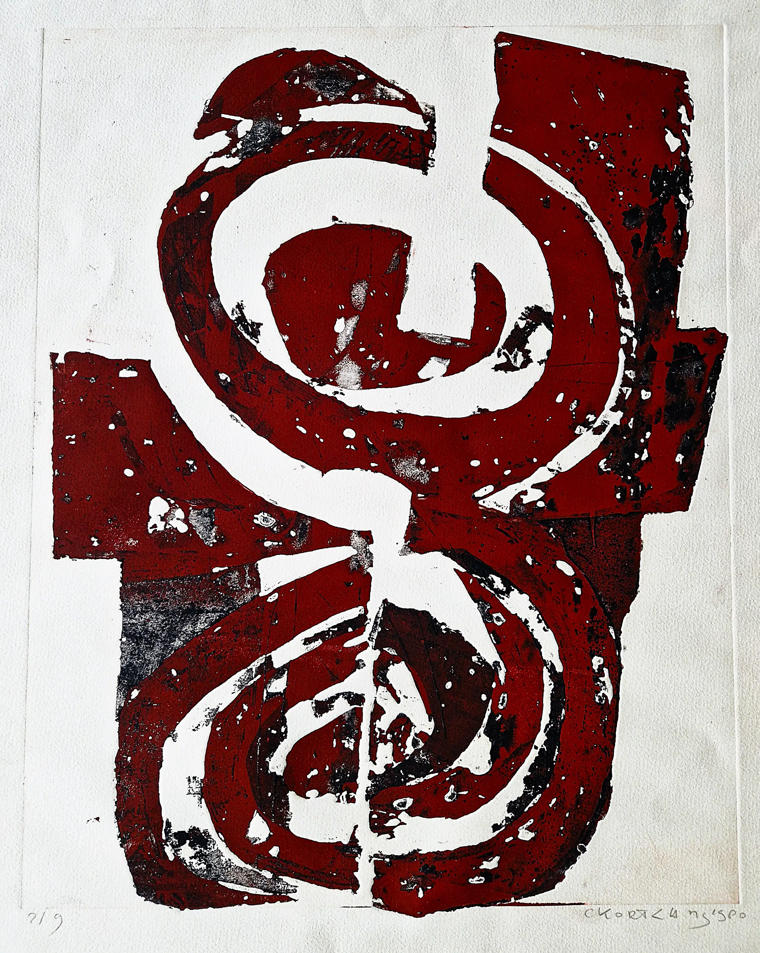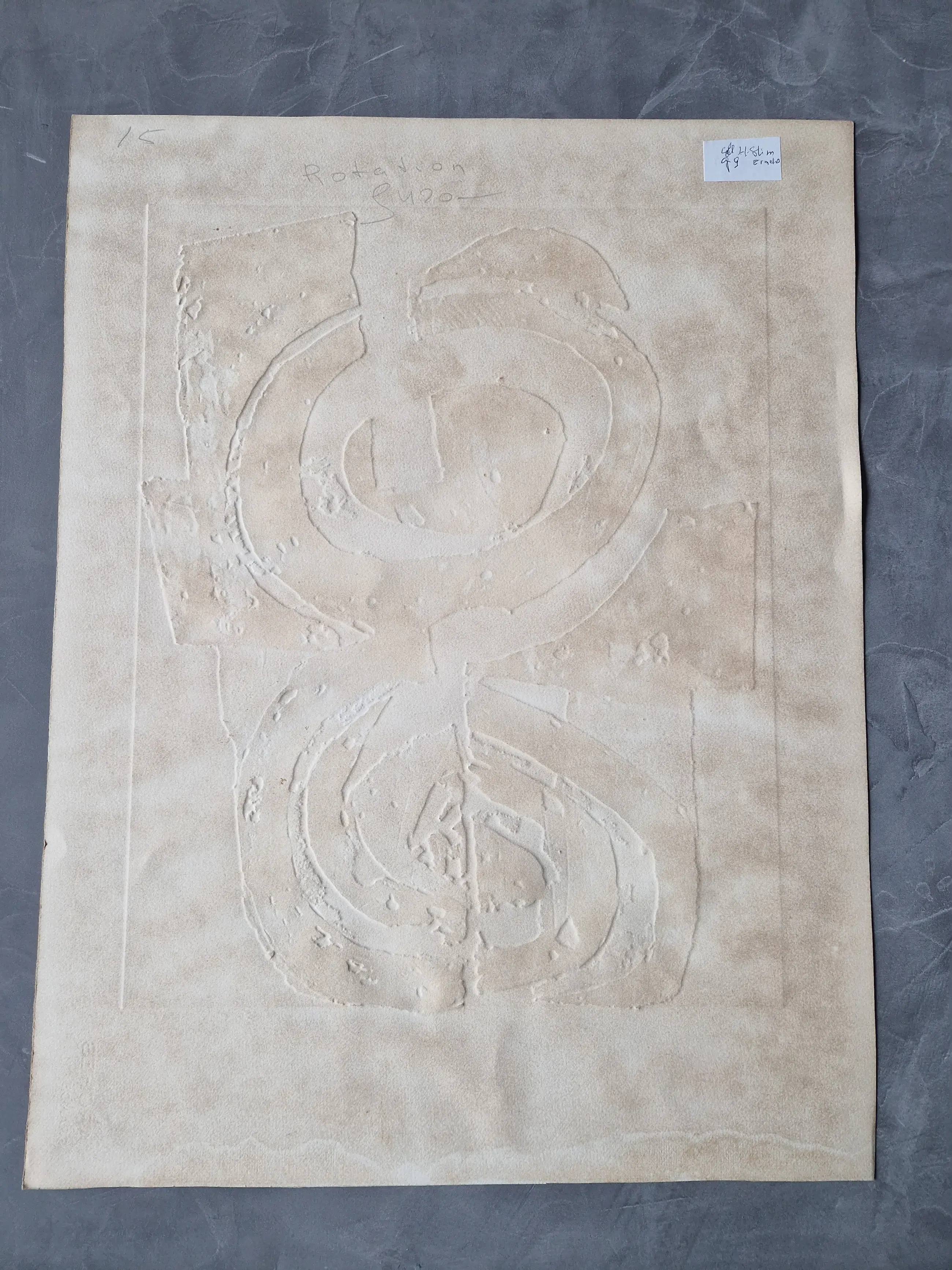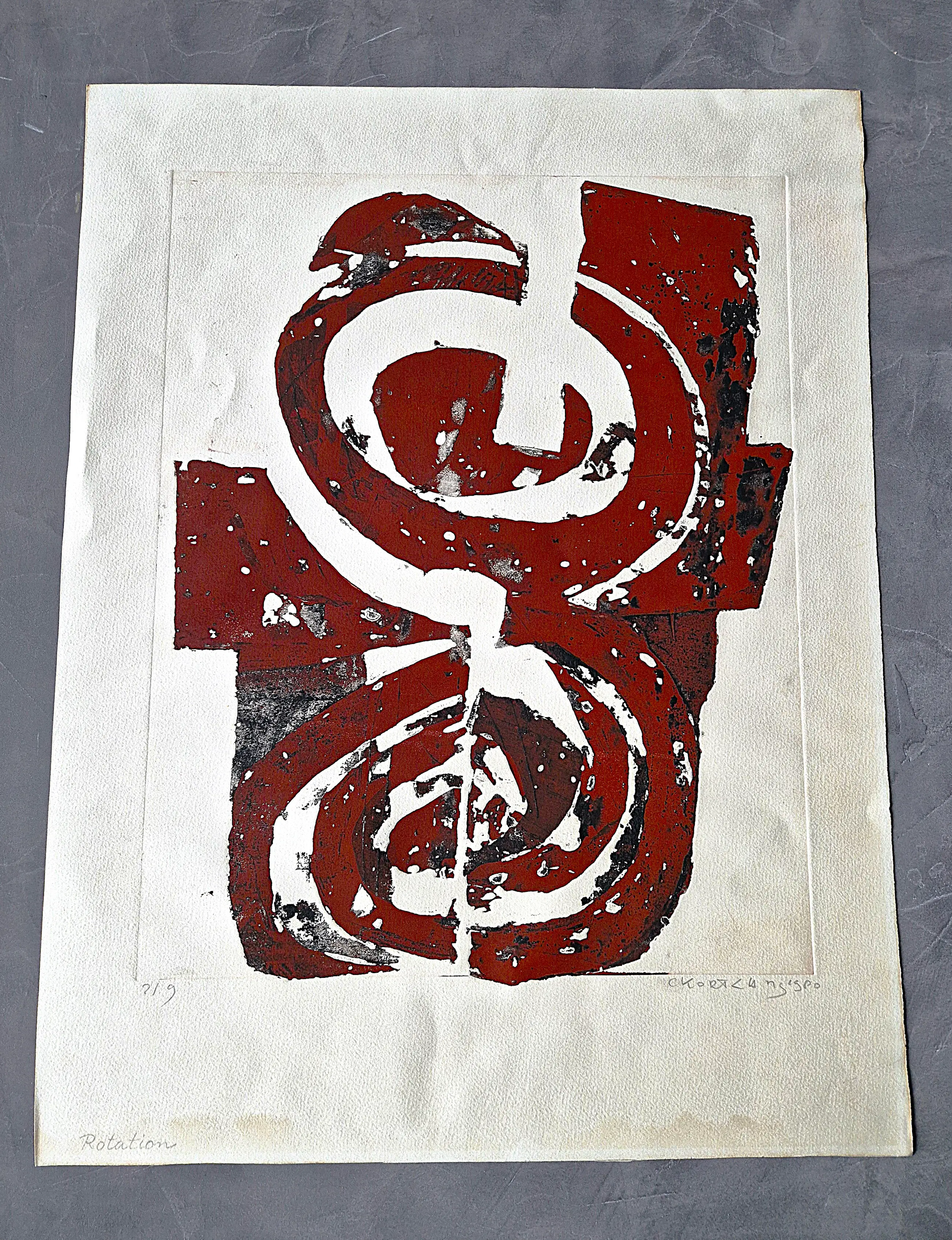 Intrigerende, grote handgekleurde reliëf Ets/aquatint "Rotation", in 1980 in zeer kleine oplage (slechts 9 exemplaren) gemaakt door de veelzijdige beeldend kunstenaar cees Kortlang (1926-2008). Deze ets is onderdeel van een grotere serie grafiek afkomstig uit de nalatenschap van de familie Slim te Ermelo, die zeer goed bevriend waren met cees Kortlang. De ets verkeert in zeer goede conditie en is met potlood gesigneerd en genummerd.