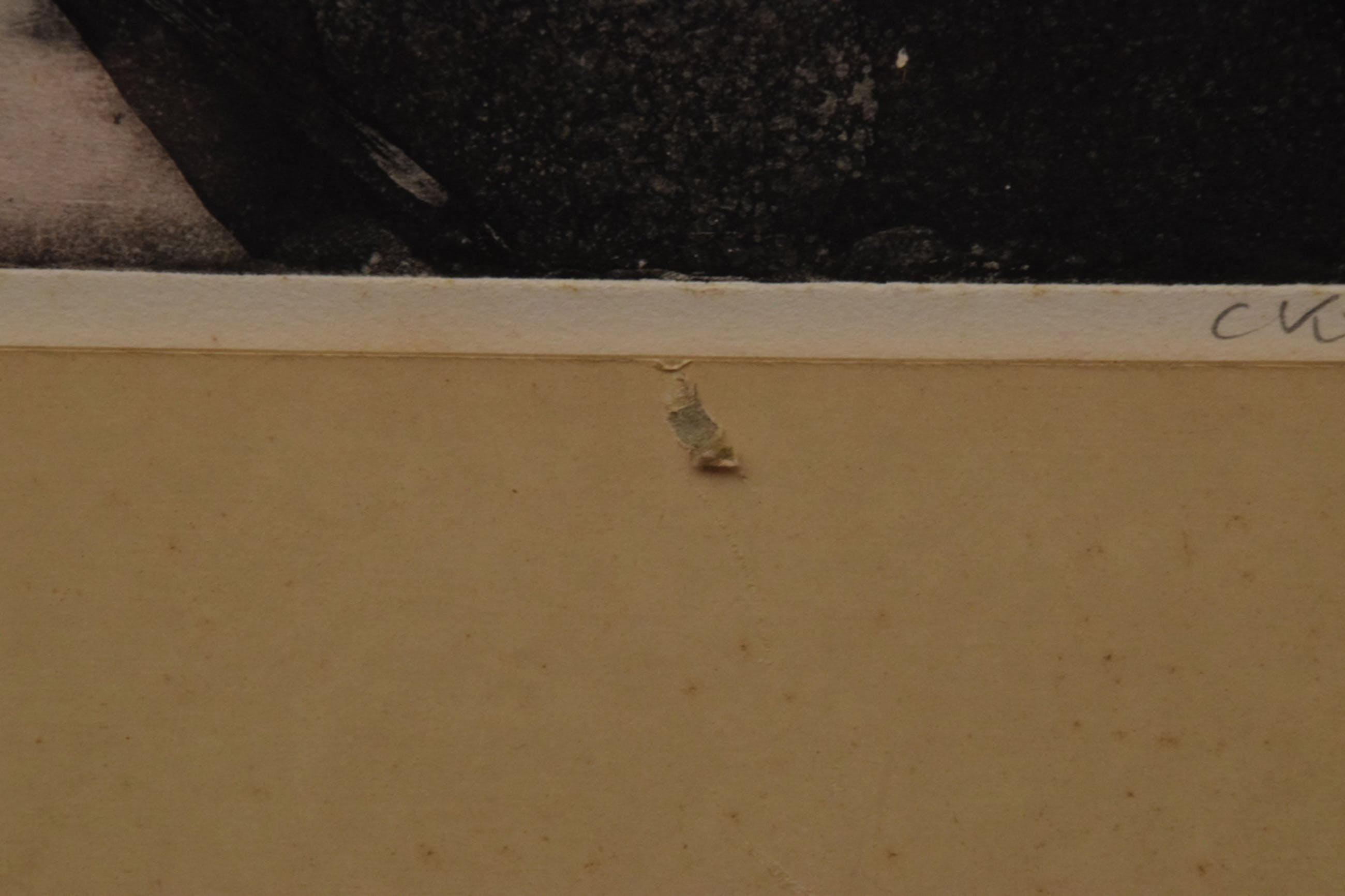 | Het papier is licht gekreukt en het passe-partout is op een enkele plek beschadigd. | |