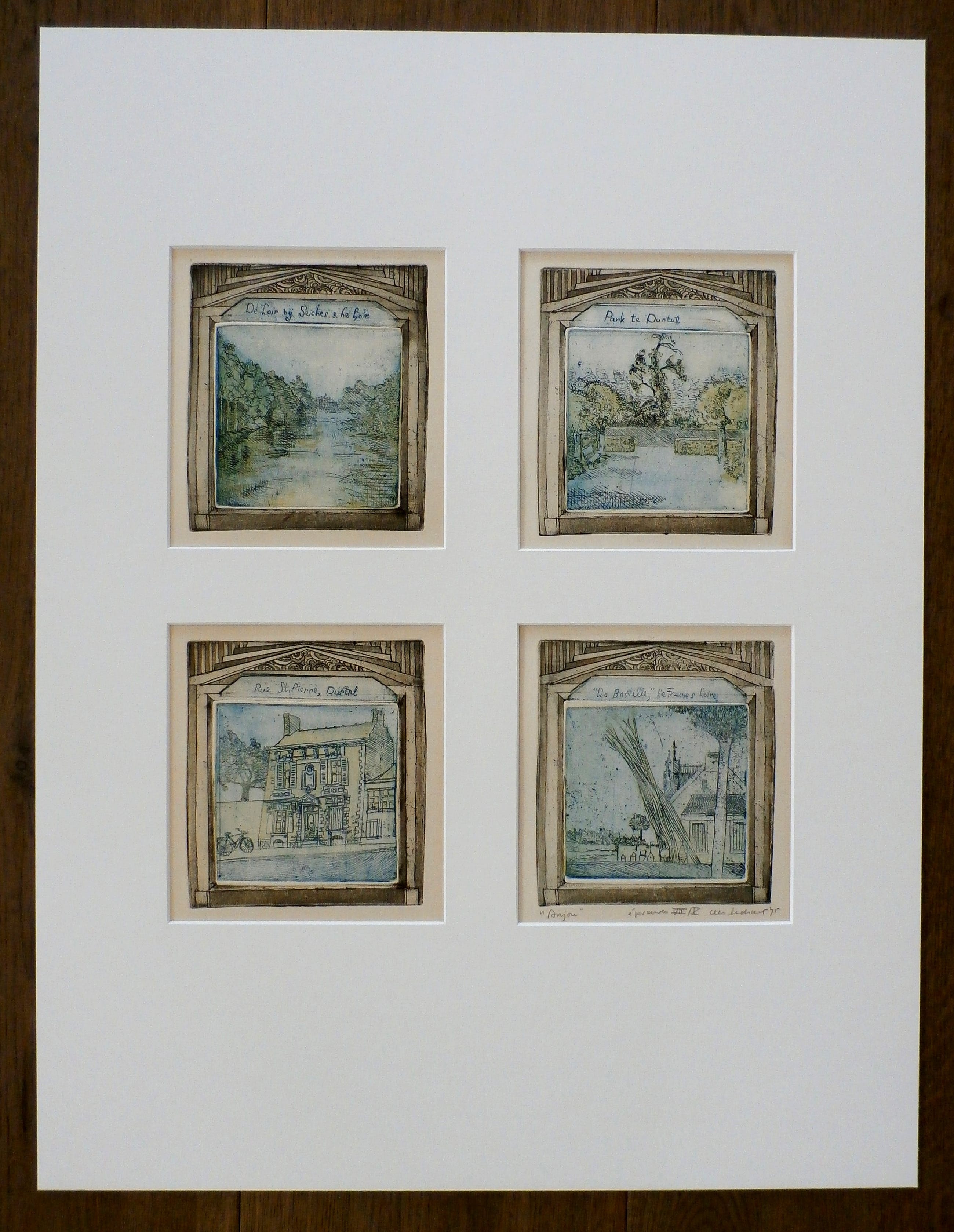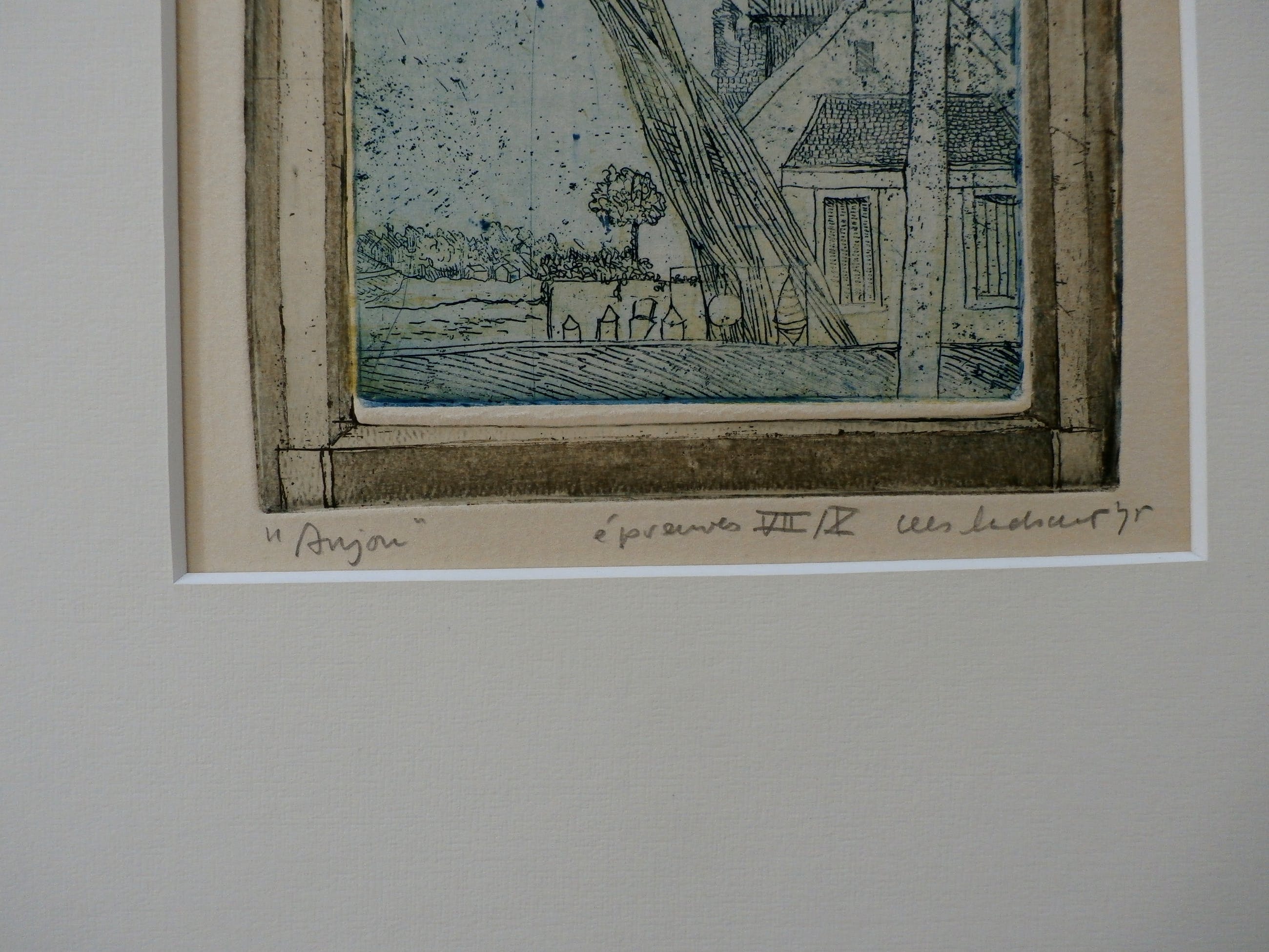 4 etsen onder 1 passe-partout van Cees Landsaat uit 1975. Nummer: VII/X. Het werk is rechtsonder, met potlood, gesigneerd . Titel: Anjon. Titel afzonderlijke etsen: De Loir bij Seiches, Le Loir Park te Duntul Rue St Pierre, Duntul La Bastille, "Le Fresnes Loire. Herkomst: collectie ABN AMRO.