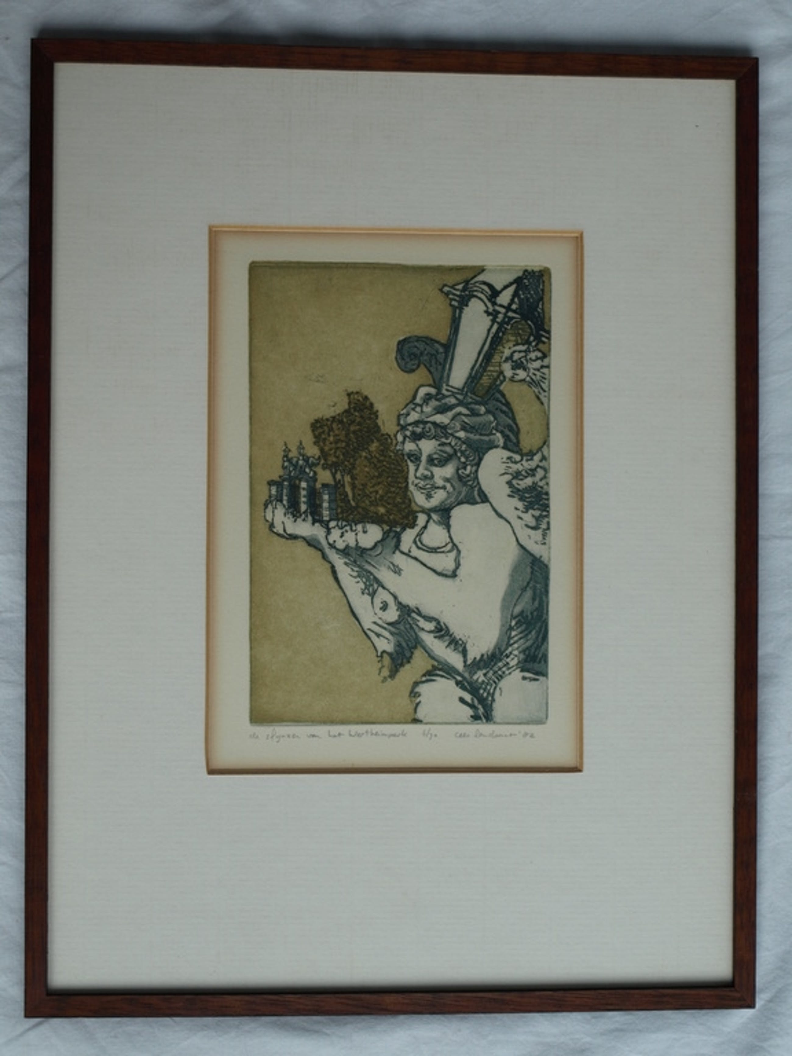 Een kleurenets uit 1982 van de Nederlandse kunstenaar Cees Landsaat (1948-2007), getiteld “De Sfinxen van het Wertheimpark” (Amsterdam).