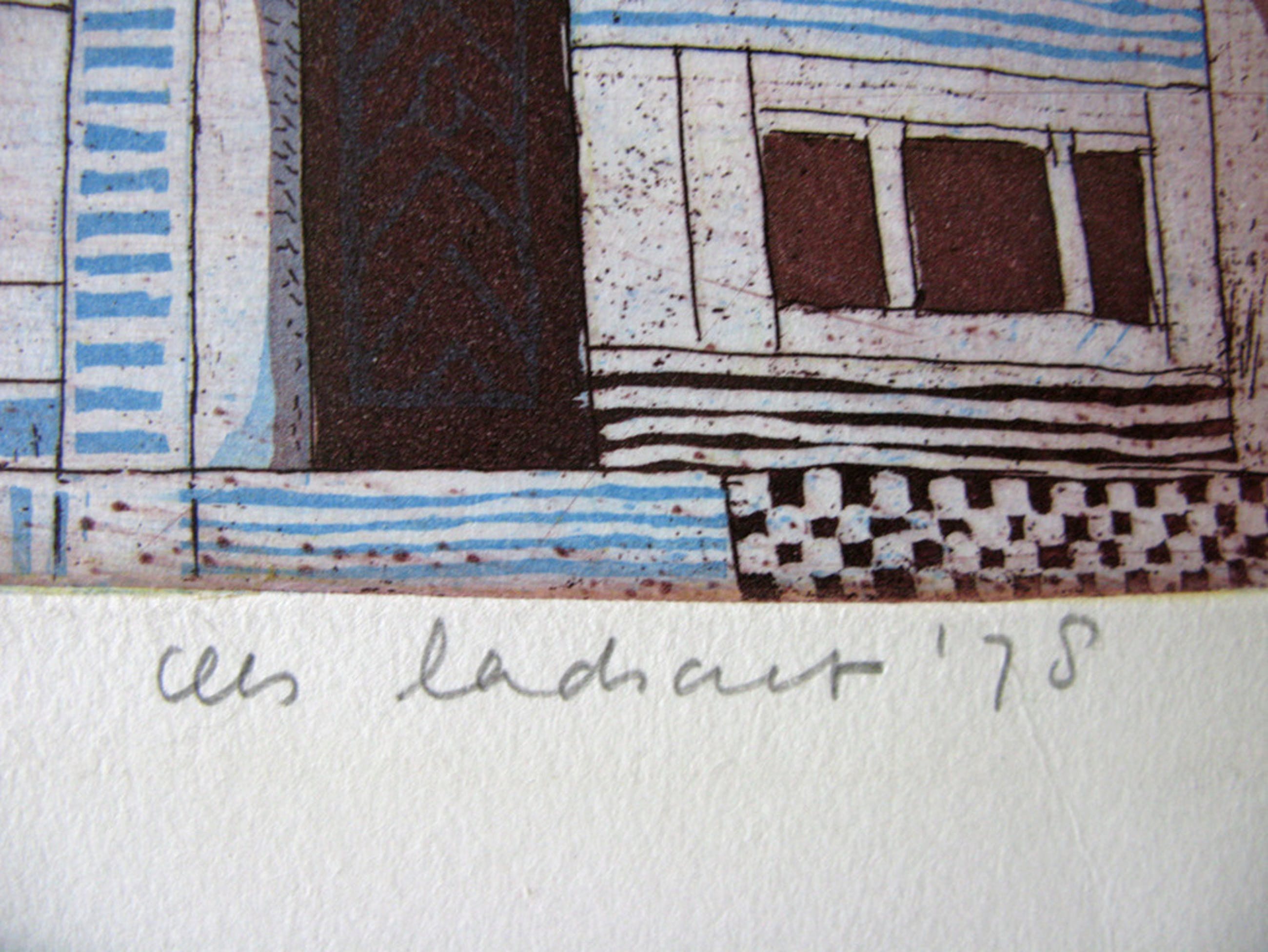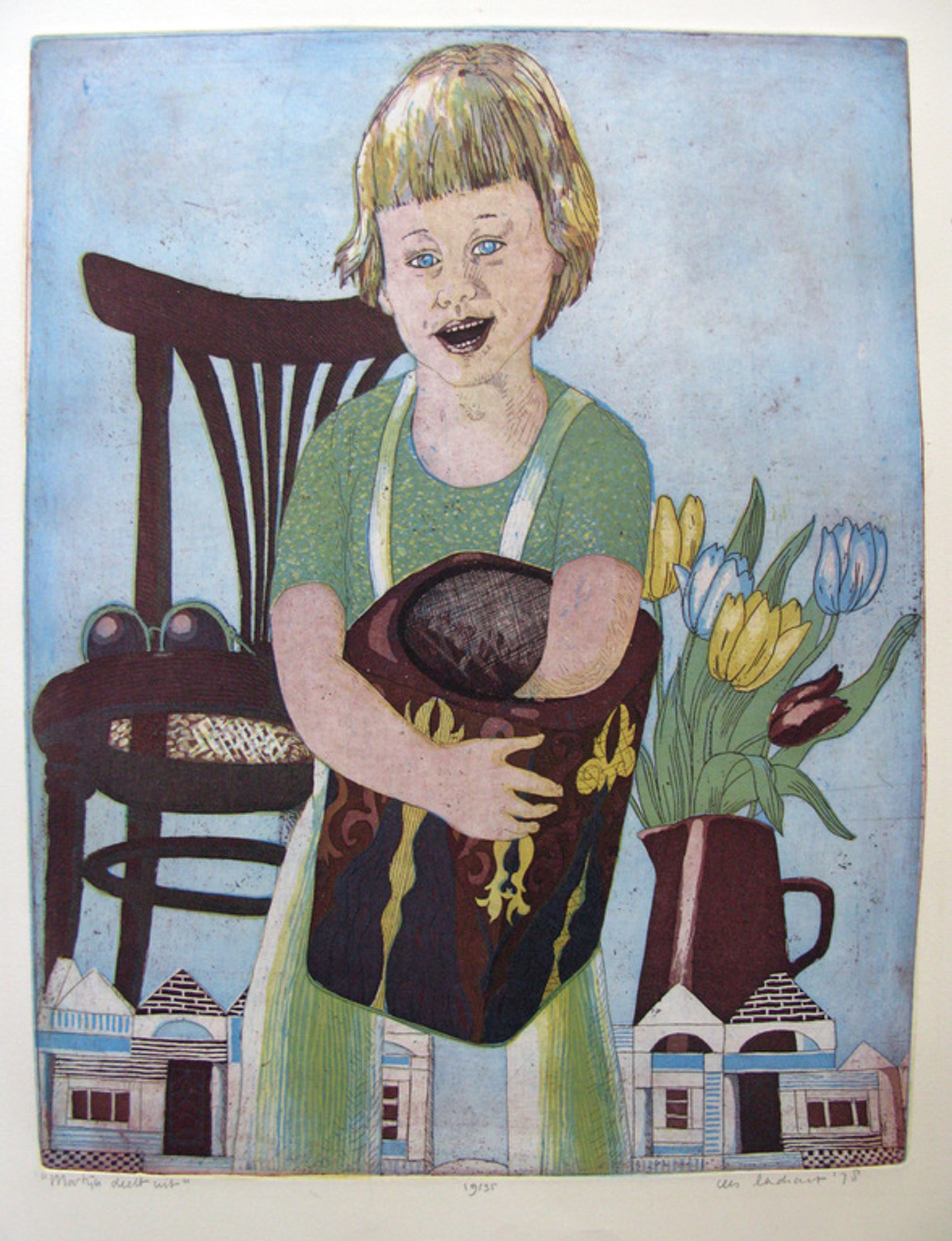 Een vriendelijke kleurets uit het grote oeuvre van deze kunstenaar. De afbeelding is 49 cm hoog en 39 cm breed. De afmeting van het blad is 60 x 50. De oplage is 19/35 en het jaartal is 1978. Het werk kan goed verpakt in een ruime koker verstuurd worden voor € 10 binnen Nederland. Deze kosten zijn voor rekening van de koper.