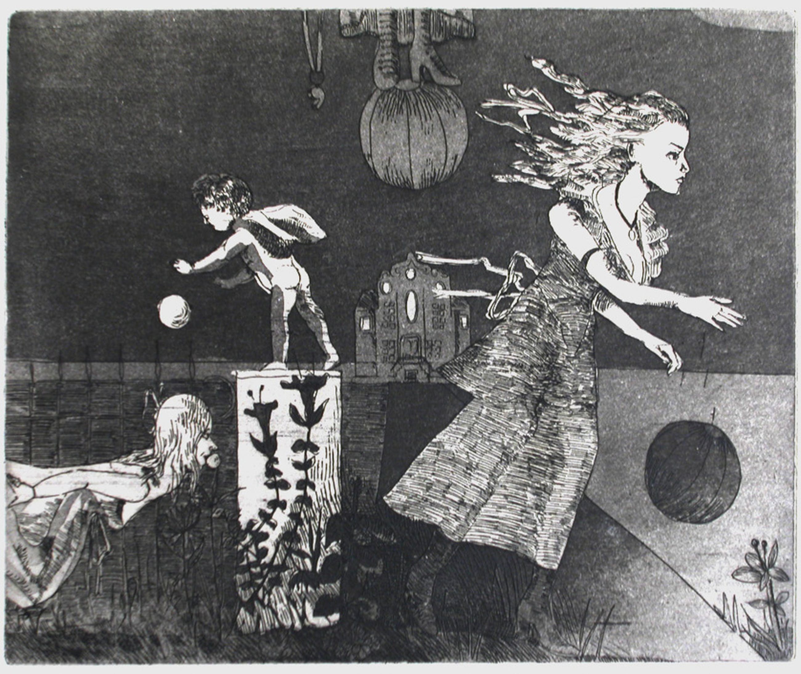 Een afbeelding vol fantasie, er gebeurt van alles zonder duidelijk verband. Vandaar de titel van deze ets VREEMD SPEL. De afmeting is 30x25, de oplage ontbreekt en het jaartal is 1971. Het werk is door de kunstenaar gesigneerd.