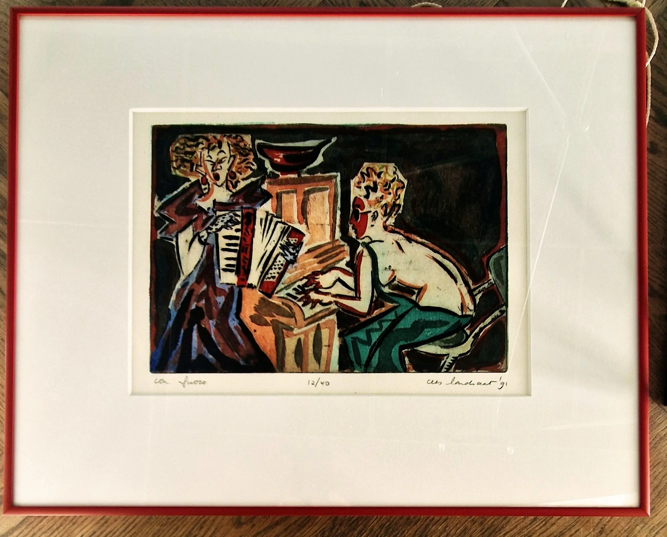 Vrolijke, vurige ets/aquatint in passe partout met passende kleur aluminium lijst