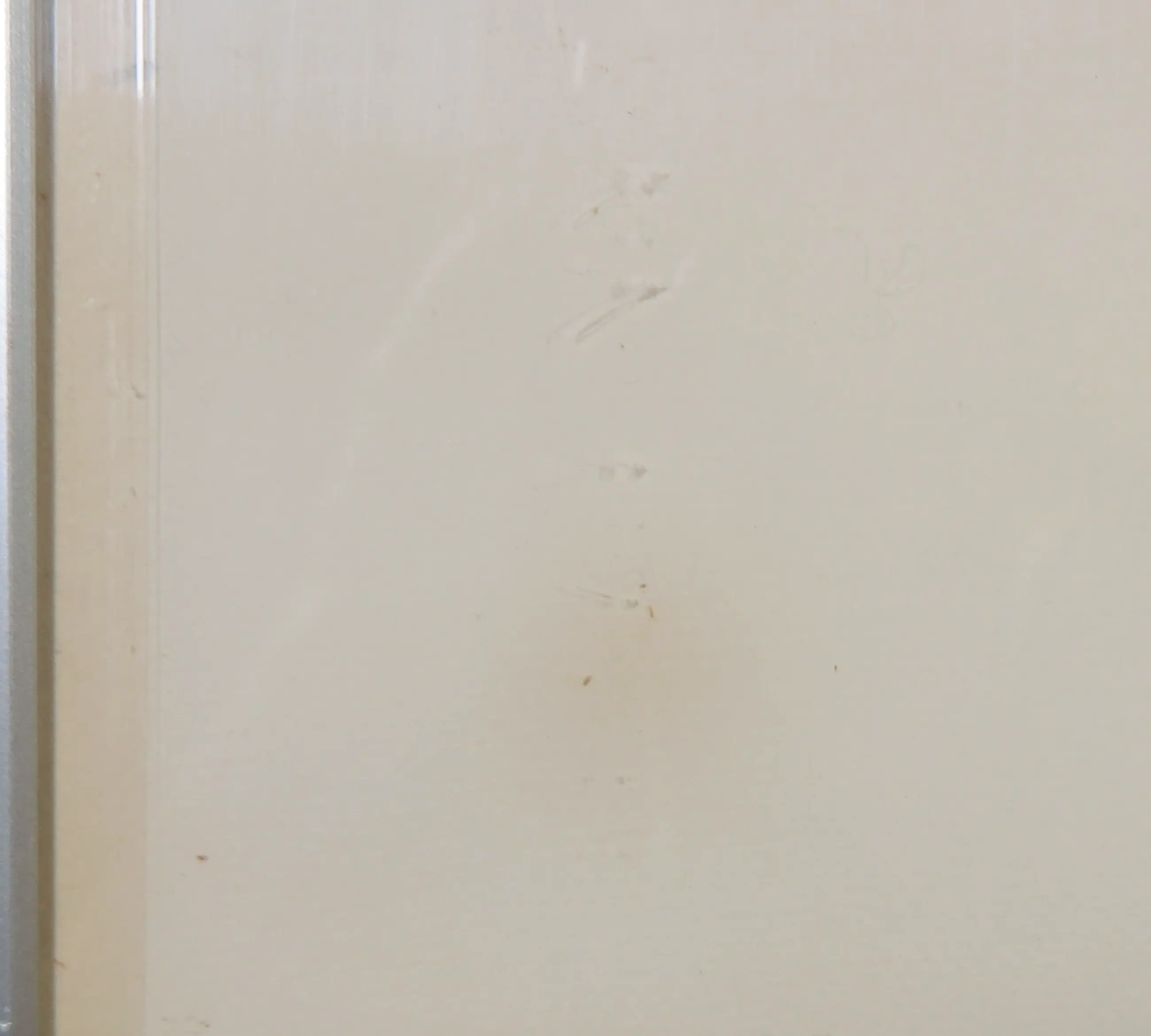 | Het werk is vergeeld en heeft wat kleine plekjes hier en daar. Het glas is bekrast. | |