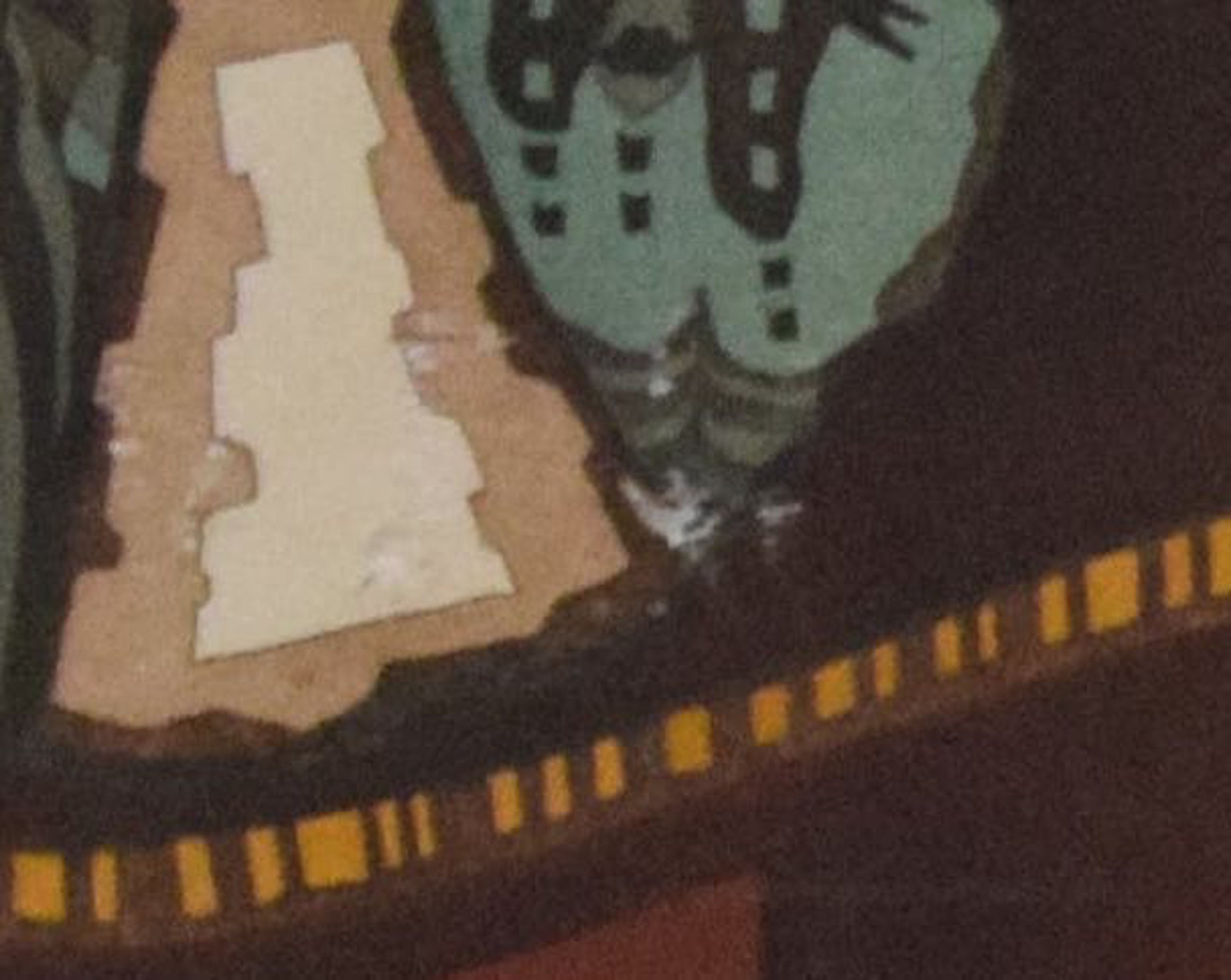 Glasplaat ontbreekt uit lijst, daardoor is er bij een horizontale beweging een beschadiging ontstaan ter hoogte van het midden, zowel links op het blad als rechts bij de rand van de passe-partout. Het papier is oppervlakkig opengeschuurd, waarbij de inktlaag gedeeltelijk is meegetrokken. | |