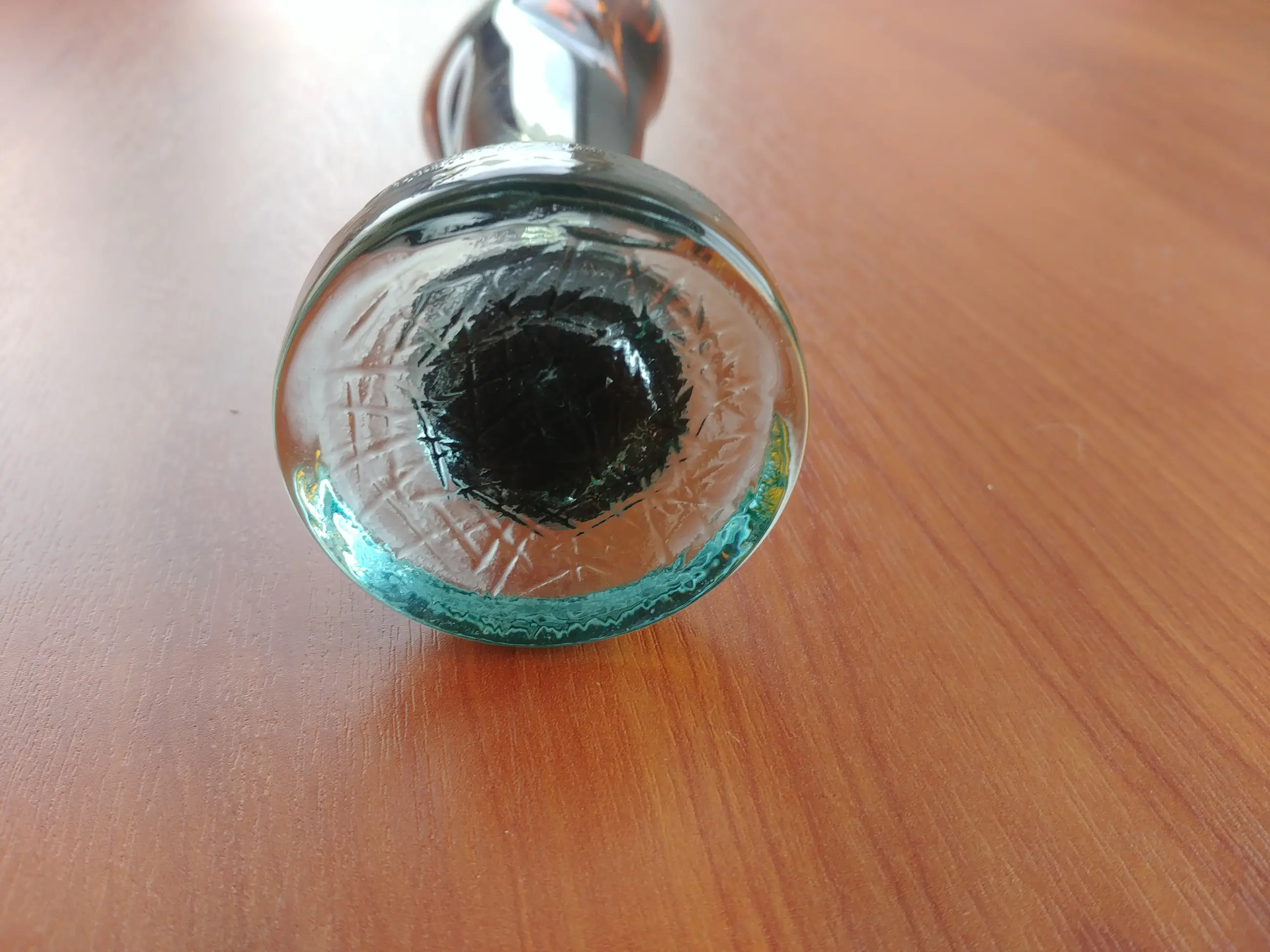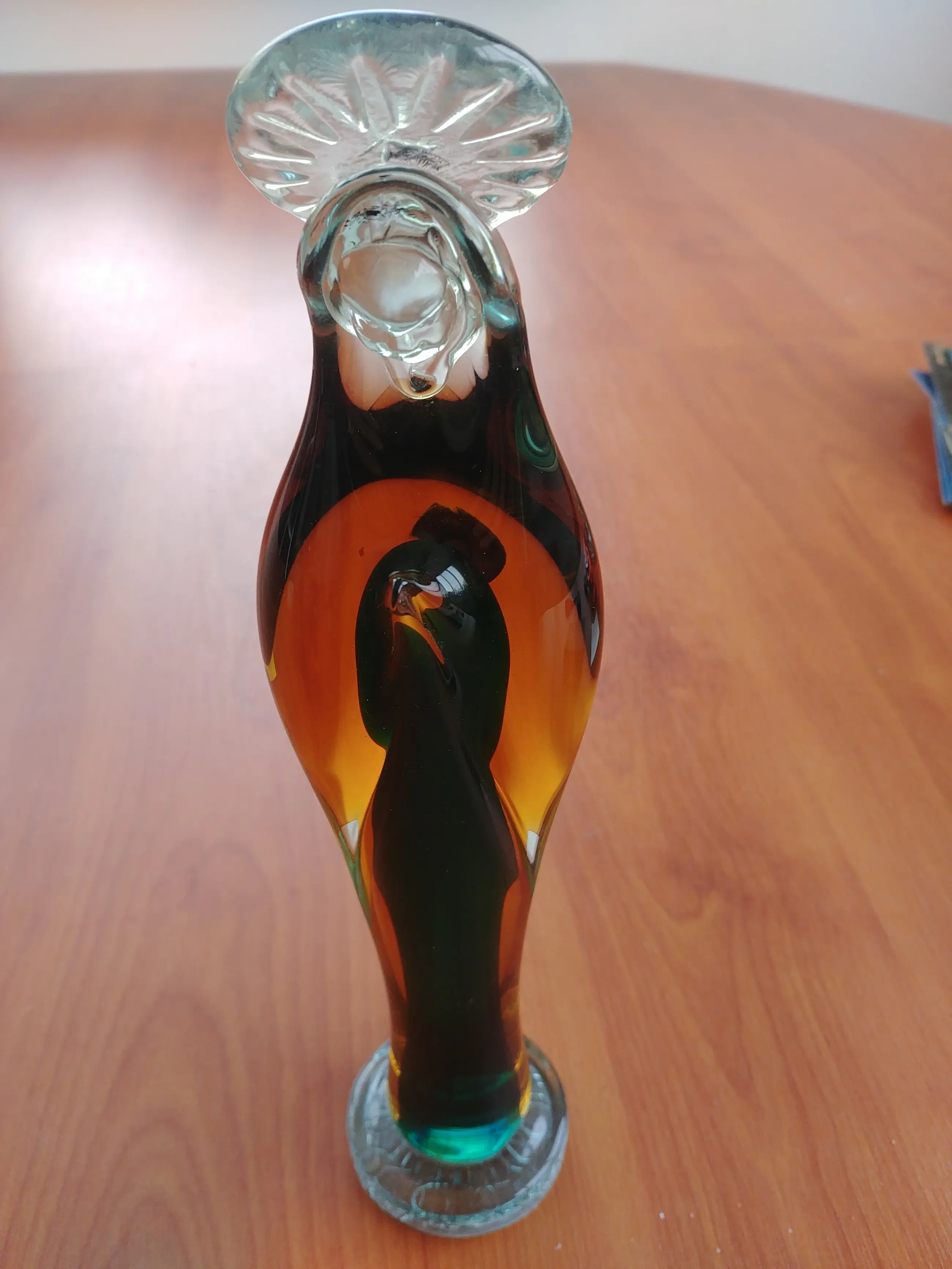 Gemaakt van volledig helder glas met iriserende tinten van groen-bruin. Hoogte 28 cm.