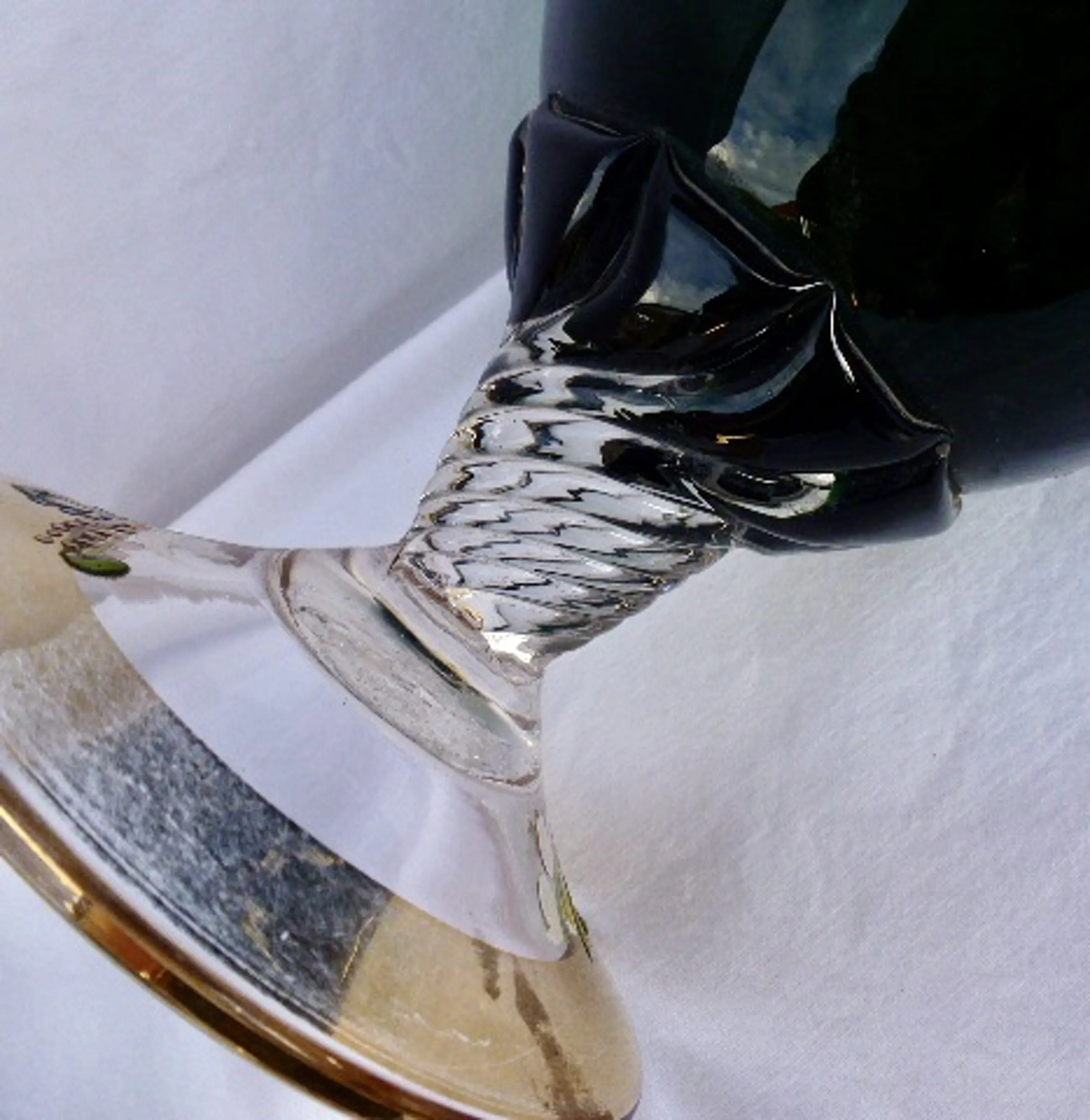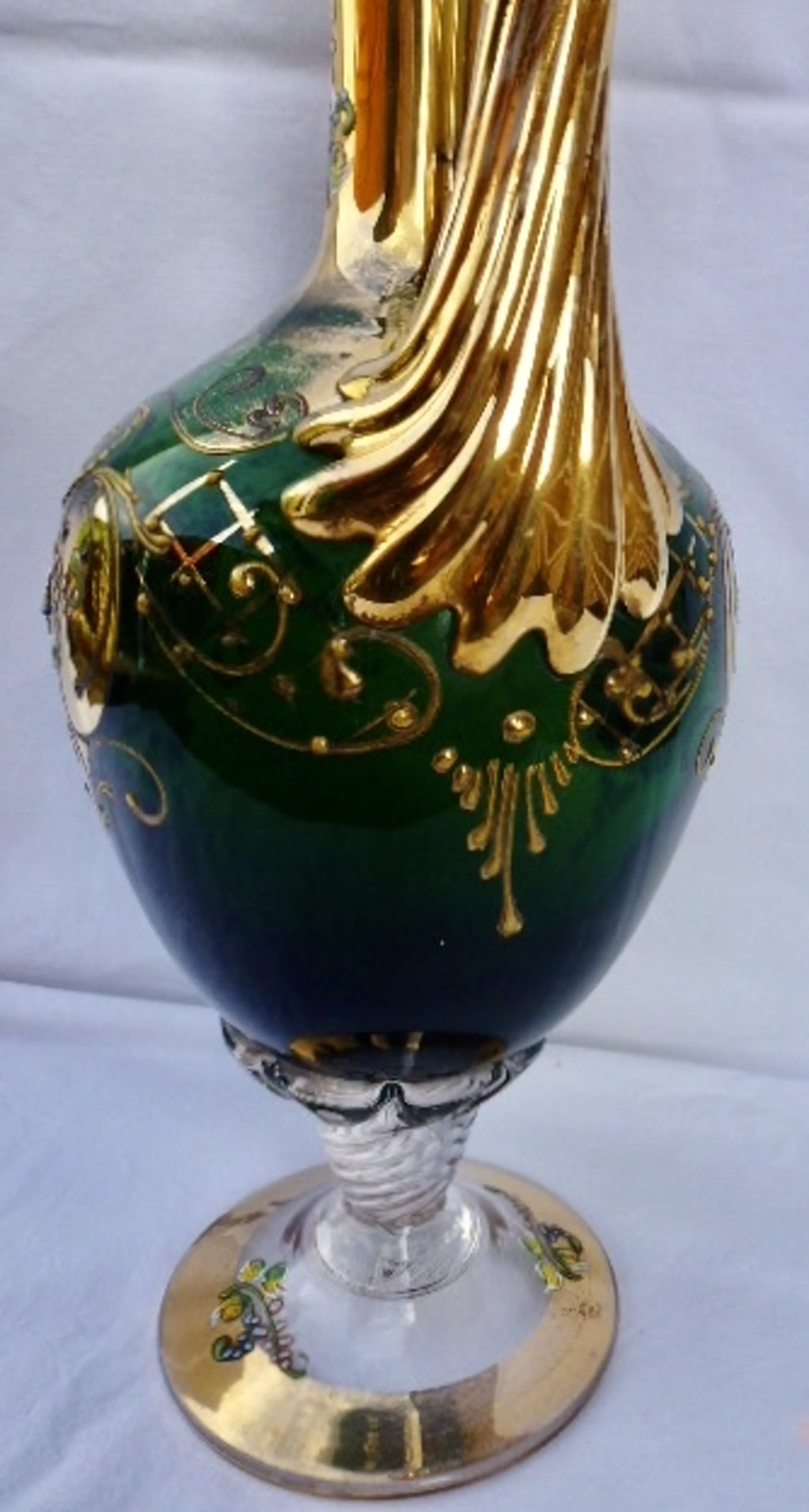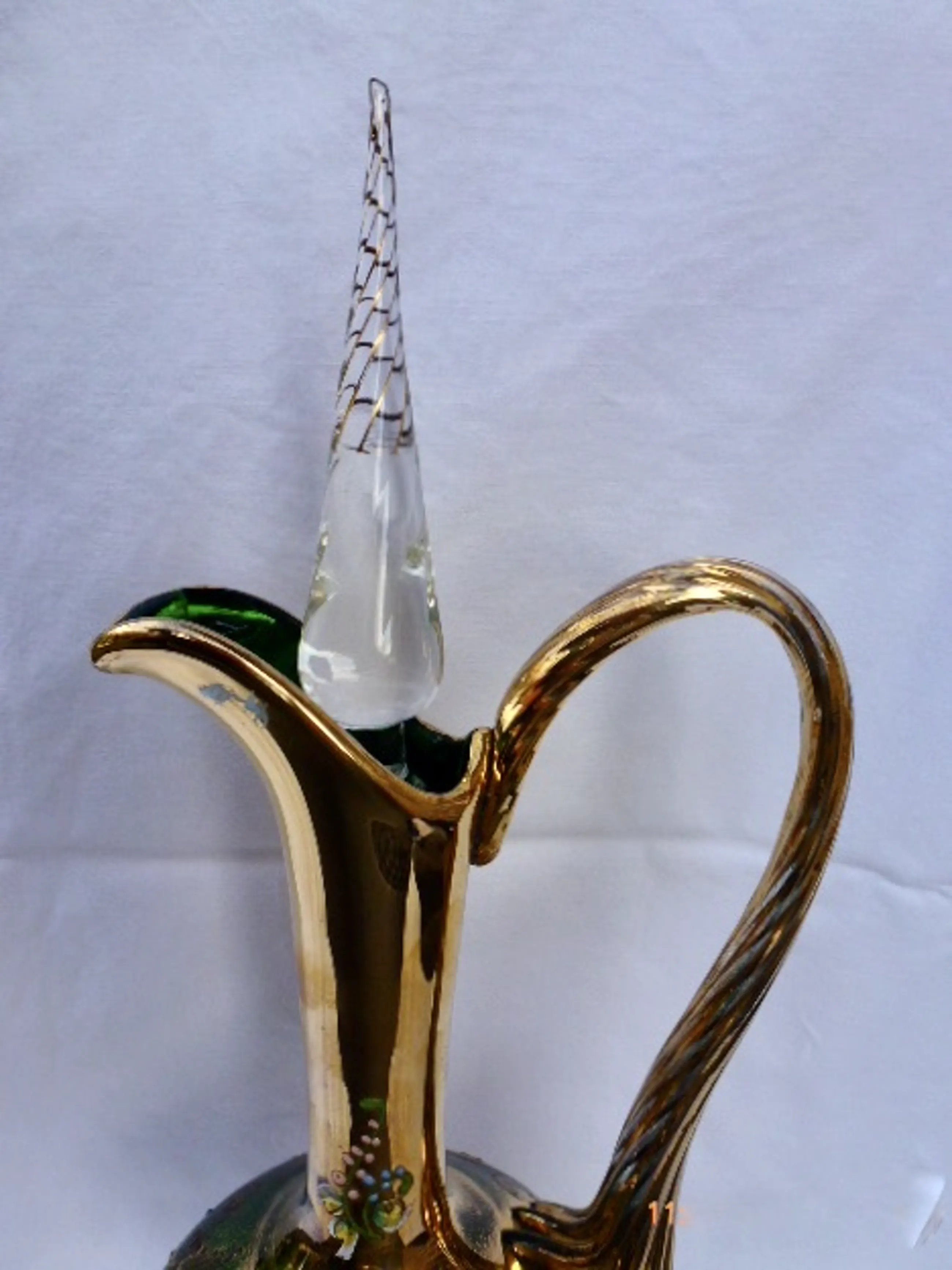 Deze karaf is de beroemde Tre Fuochi-karaf van de oude Venetiaanse traditie. Dit glaswerk van hoge kwaliteit wordt stuk voor stuk met de hand gemaakt, uit de vrije hand geblazen en beschilderd door de Italiaanse ambachtslieden met goud en email.