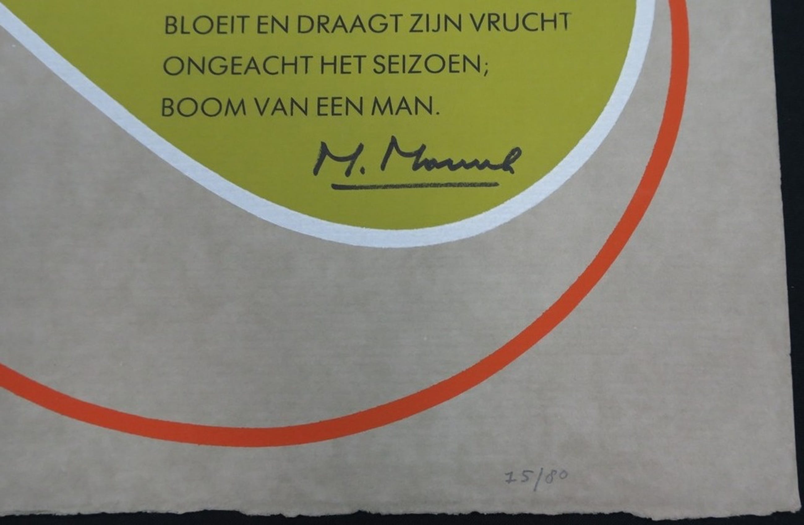 Zeefdruk op Japans lompenpapier met de kenmerkende lijnvoering van 'De Stijl'-kunstenaar César Domela en een gedicht van Maarten Mourik. De zeefdruk is met de hand gesigneerd door beide kunstenaars.