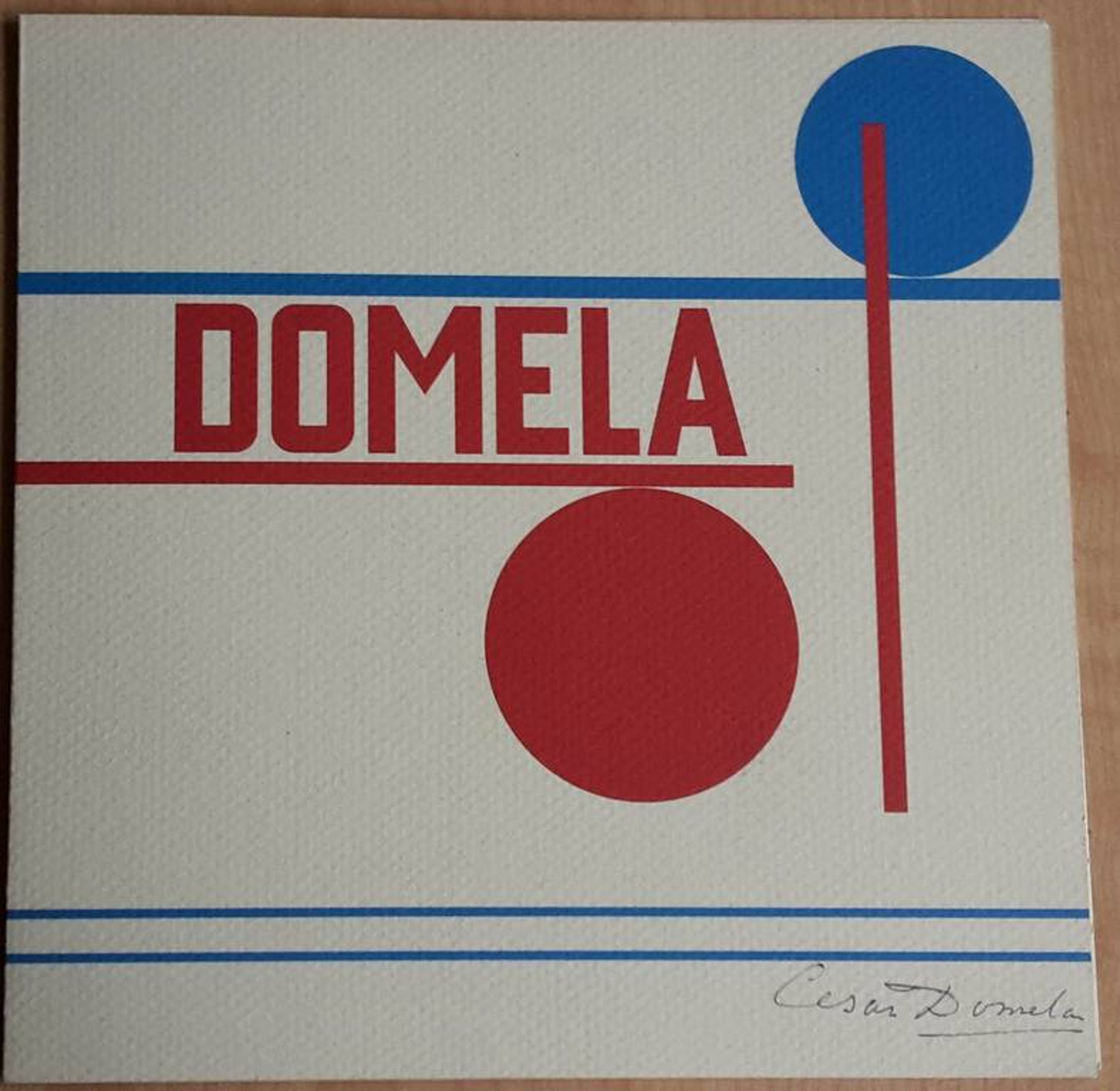 tentoonstellingskaart, 19,5 x 19,5 cm, dubbele kaart, binnenzijde blanco; uitgegeven bij de tentoonstelling "Domela" in het Van Reekum Museum, Apeldoorn, 1990; ontwerp van César Domela, dit ontwerp is ook gebruikt voor het affiche en de catalogus van de tentoonstelling; gesigneerd met pen op de voorzijde