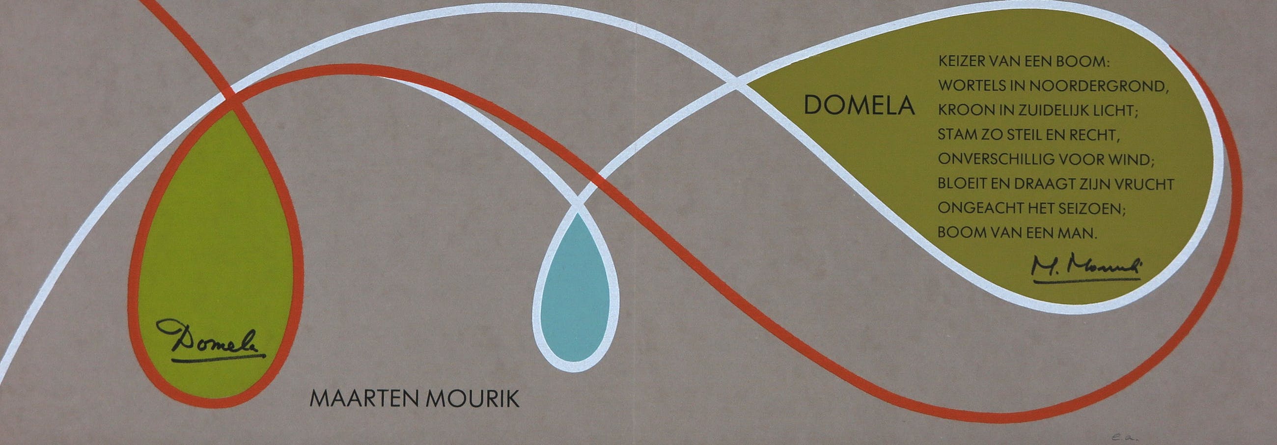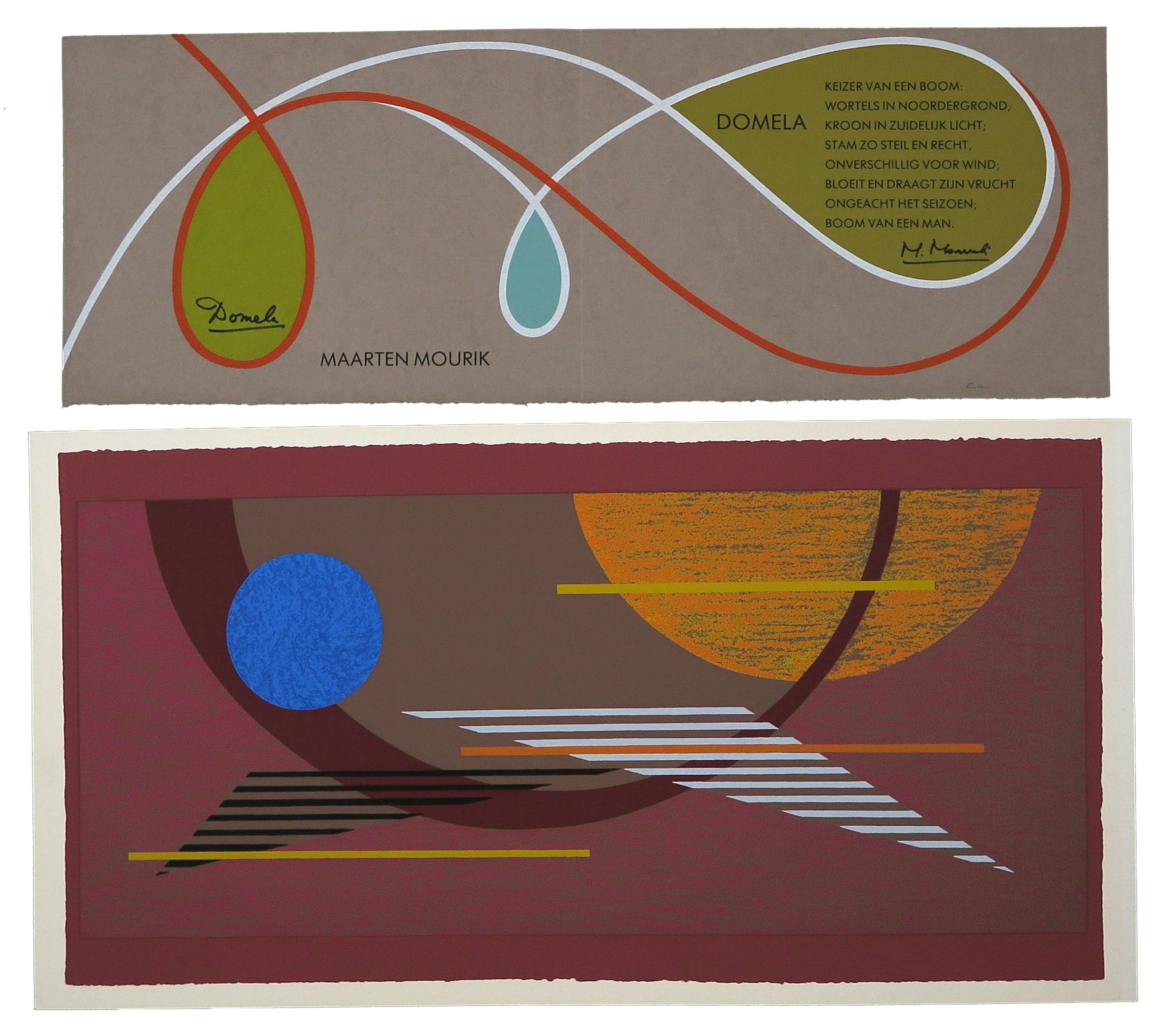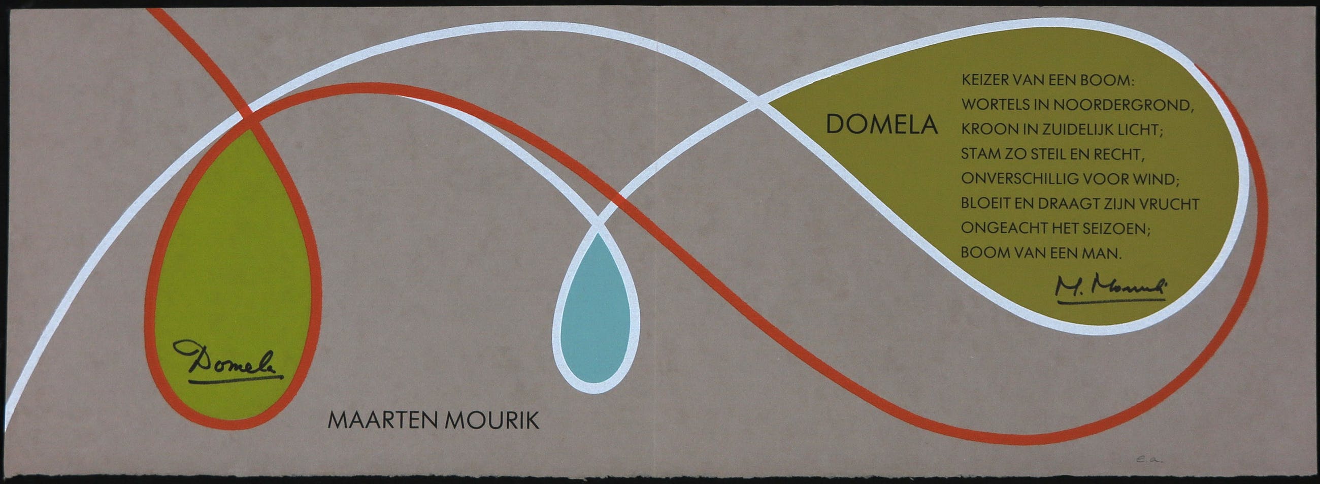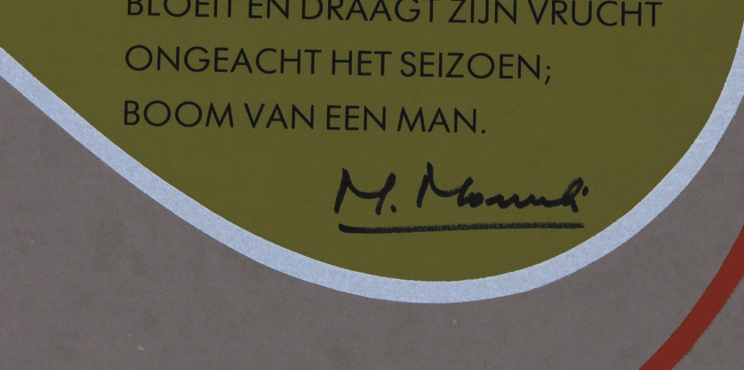 Het werk (met een vouw; hoort erbij) is voorzien van een gedicht en signatuur van beide kunstenaars. Oplage: E.A.