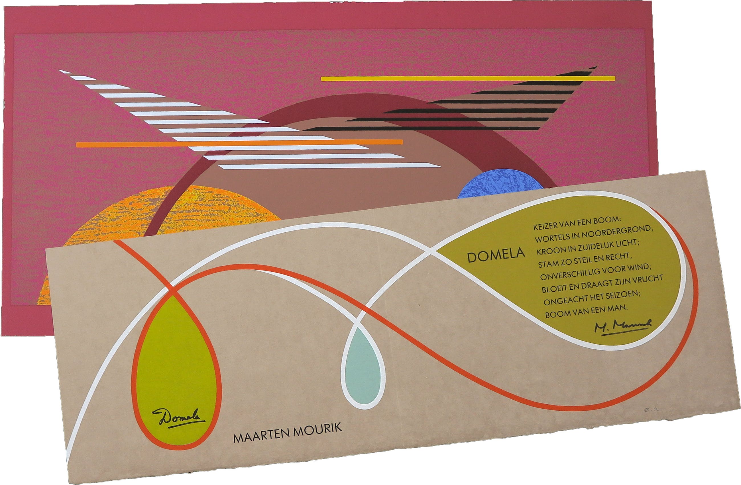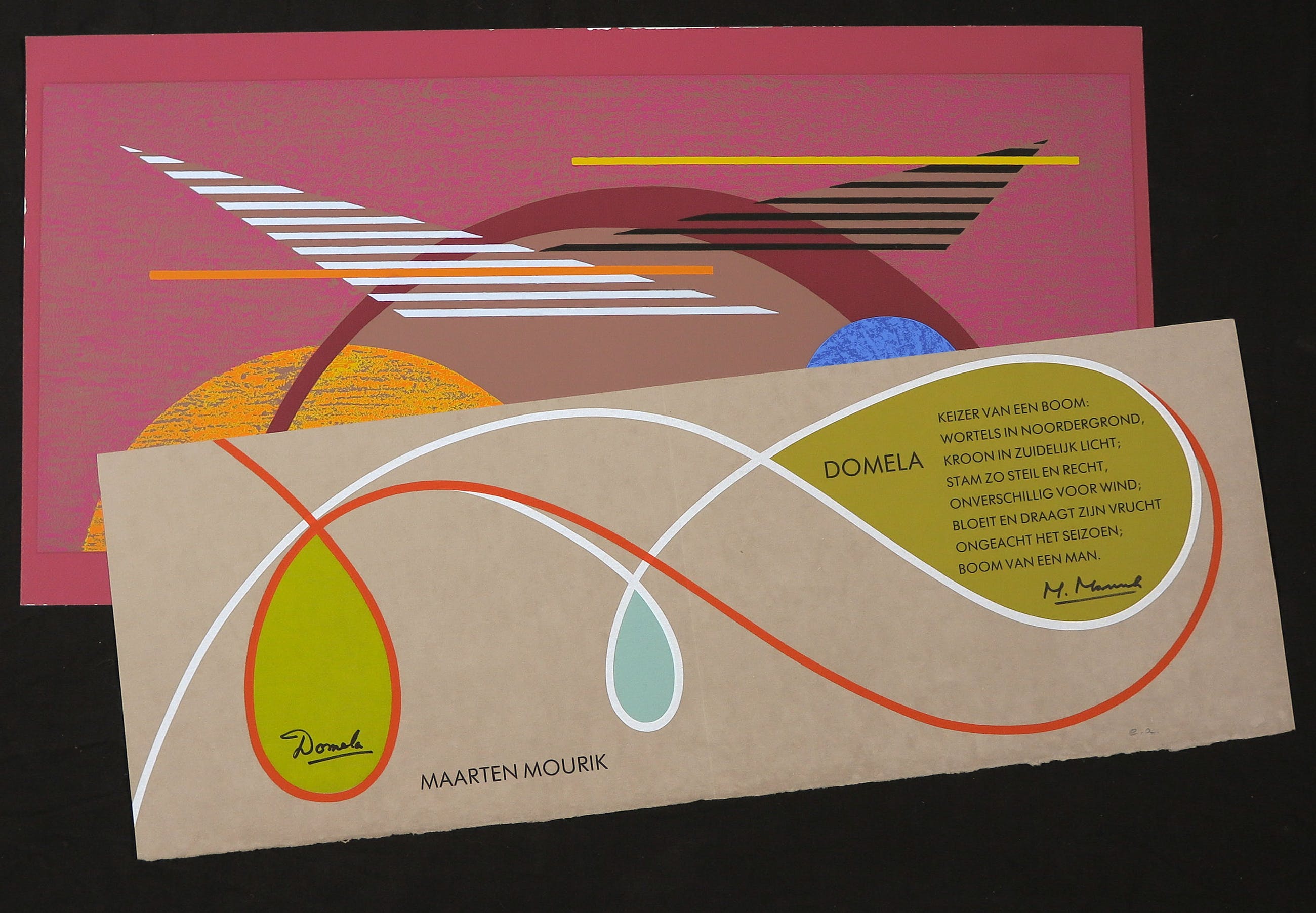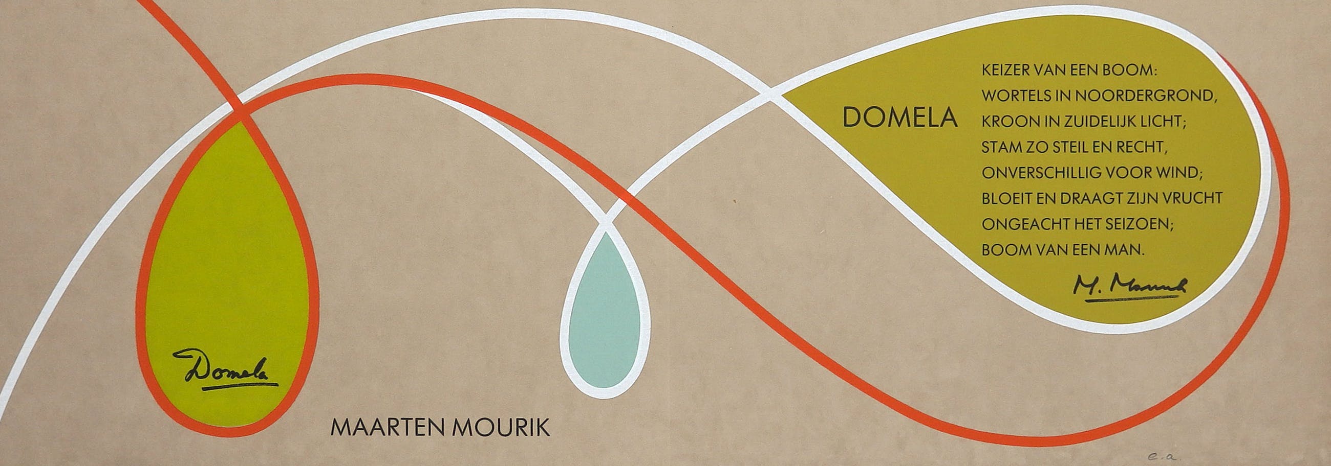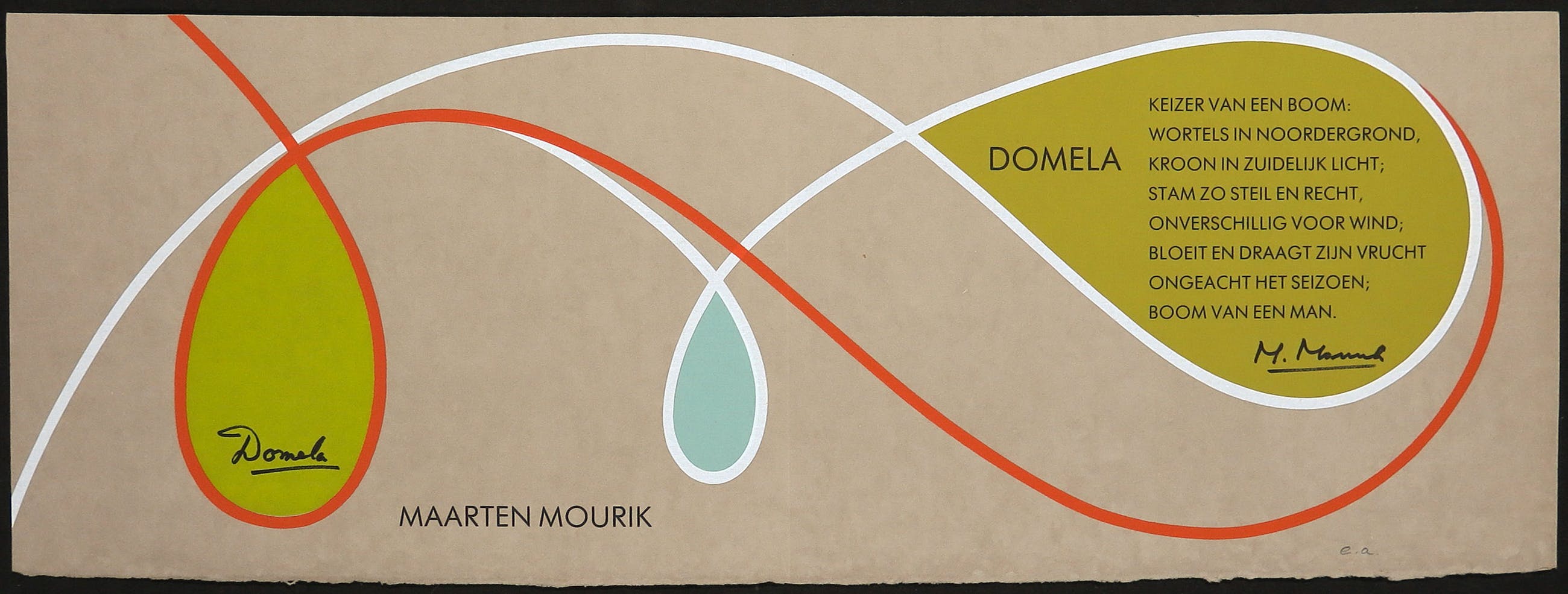 Het werk (met een vouw; hoort erbij) is voorzien van een gedicht en signatuur van beide kunstenaars. Oplage: E.A.