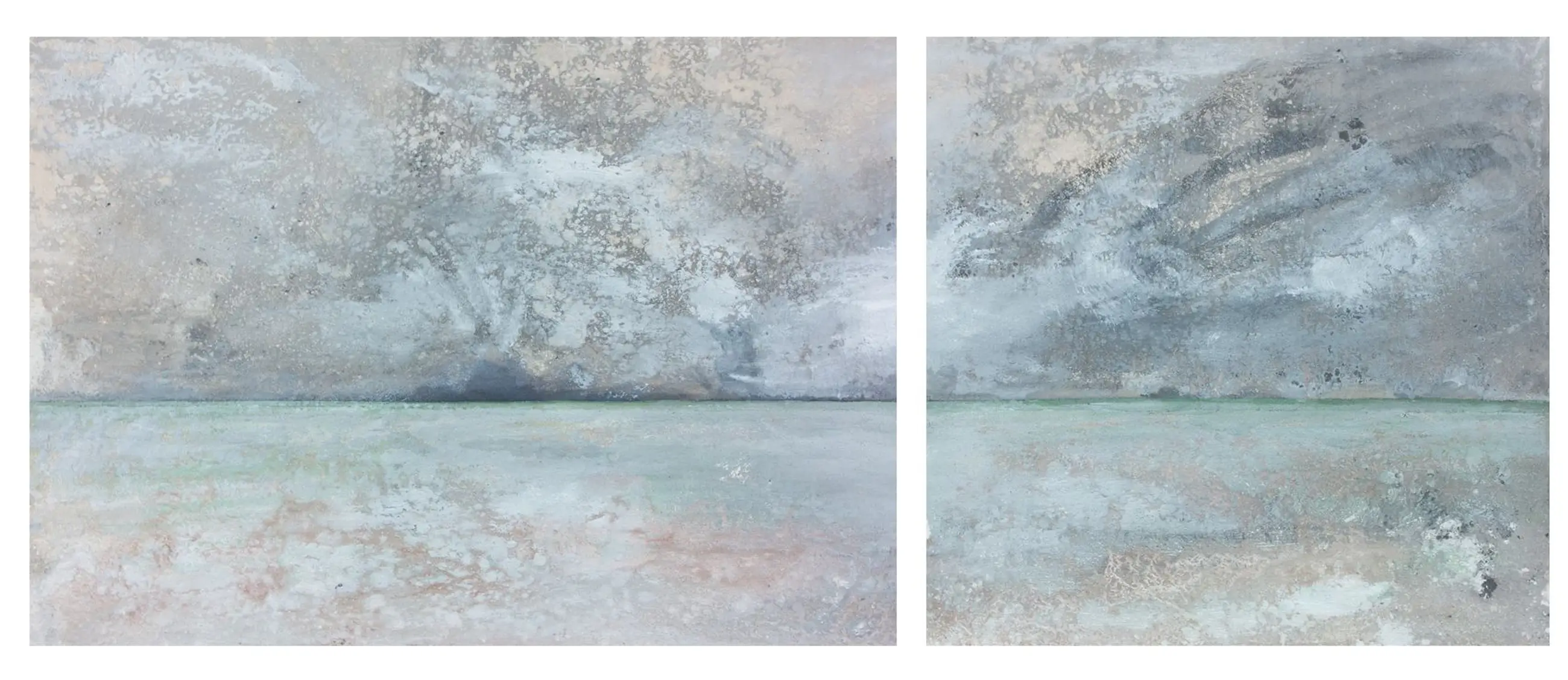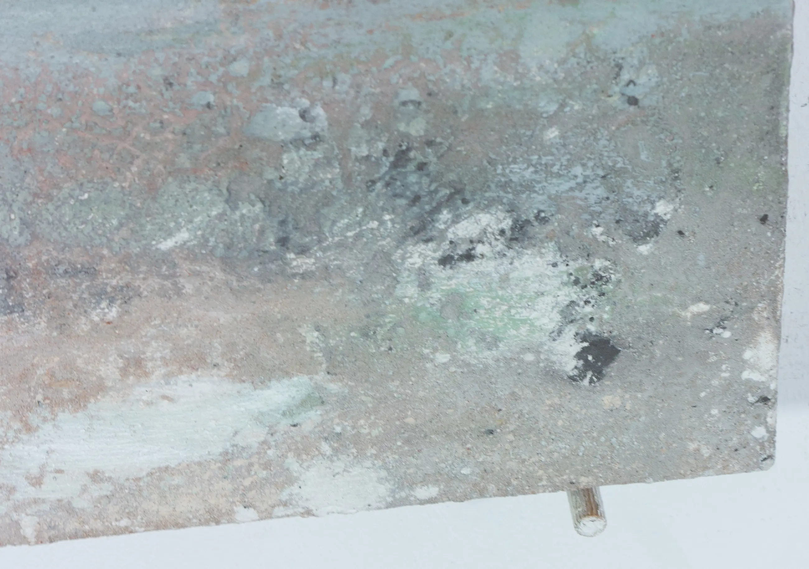 | Enkele lichte beschadigingen van het materiaal, o.a. stukje afgebroken rechtsonder van het kleine doek. | |
