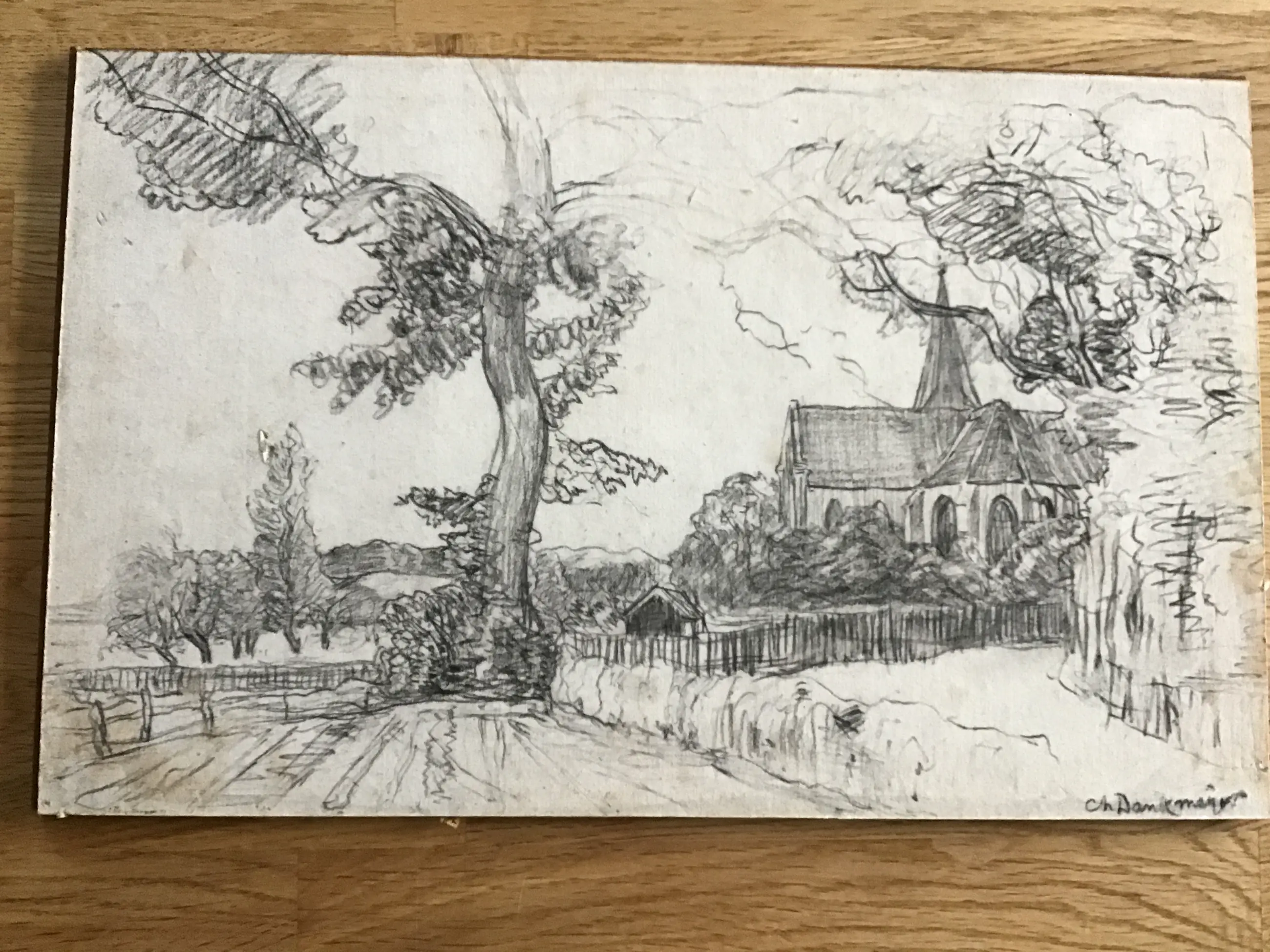 Charles Dankmeijer - Landschap met boerderij /kerk, 2 potlood- en 1 houtskooltekening
