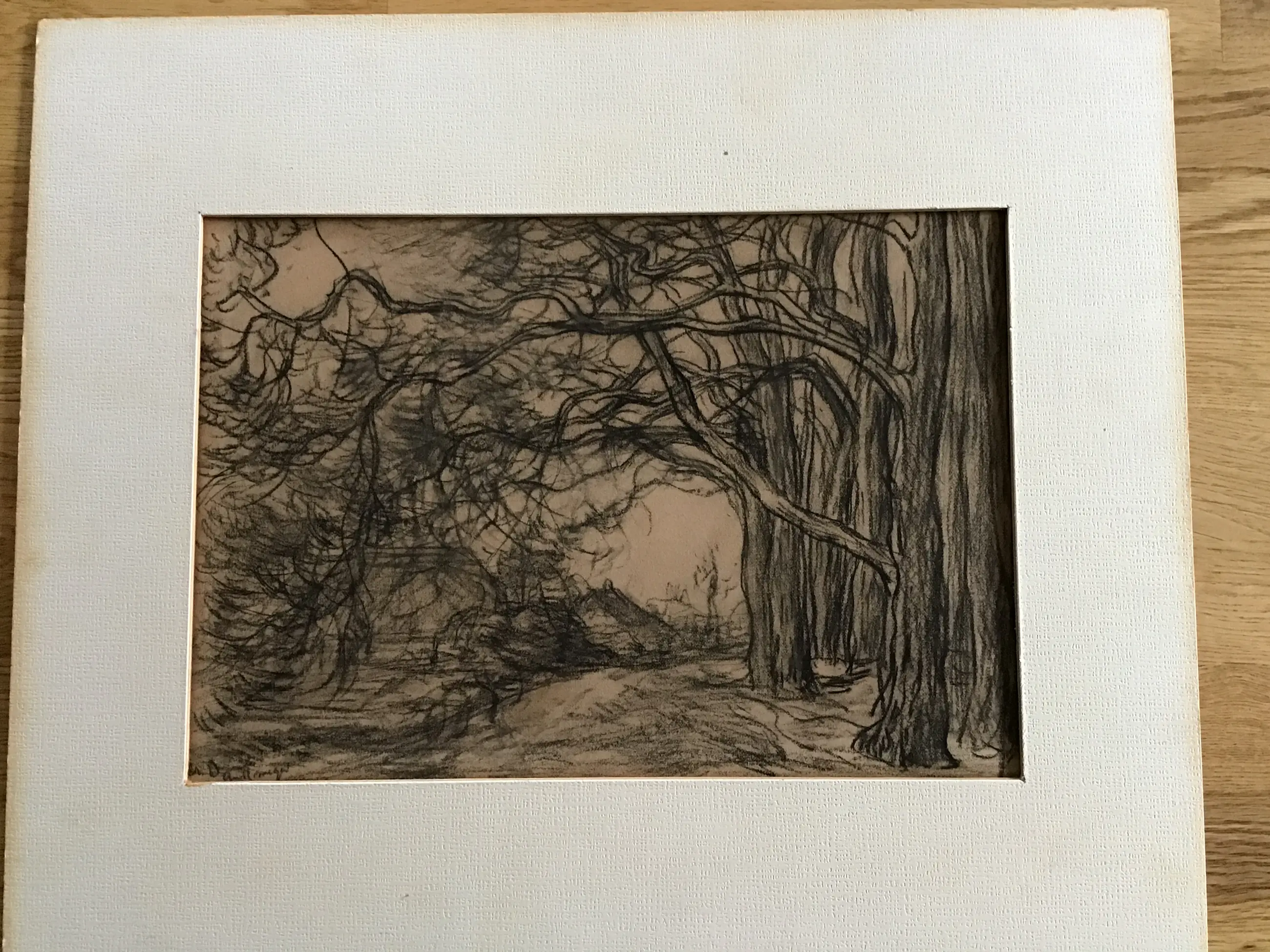 Houtskooltekening: drager is papier, afmeting inclusief passe-partout 32 x 38 cm Potloodtekening met kerk: drager is karton, afmeting 18,5 x 29,5 cm Potloodtekening met boerderij: drager is karton, afmeting inclusief passe-partout 25 x 30 cm