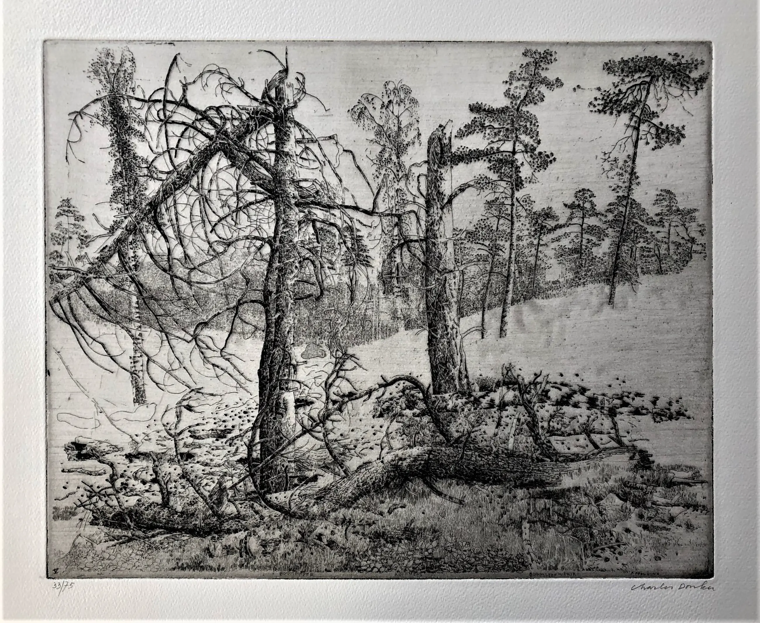 Rechtsonder in de etsplaat: boomleeuwerik en appelvink Rechtsonder met potlood gesigneerd: Charles Donker. Linksonder met potlood oplagenummer 33/75 Grote prent