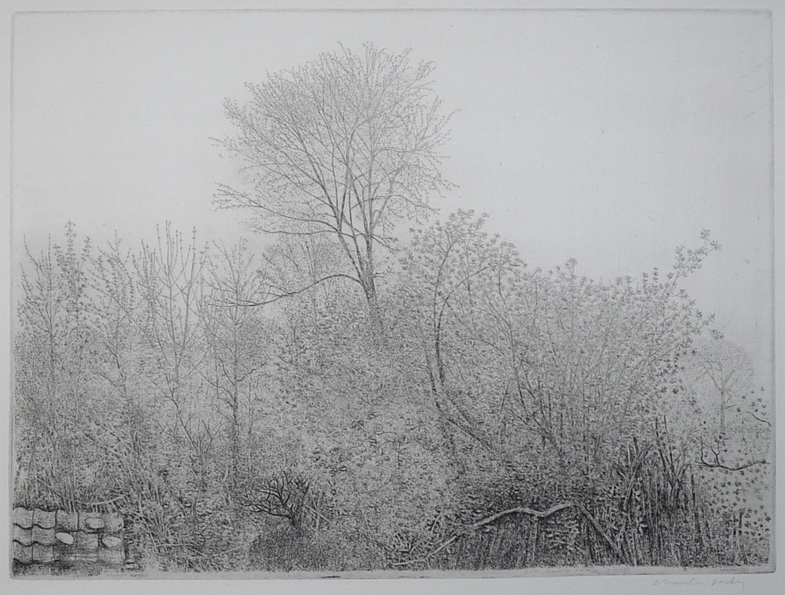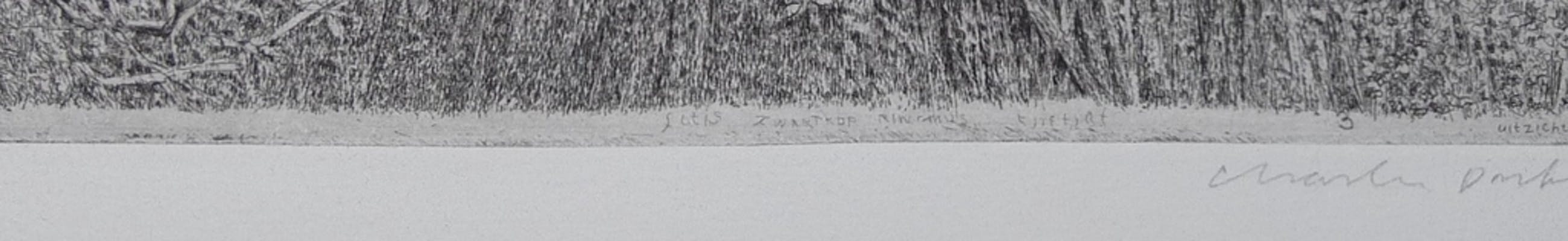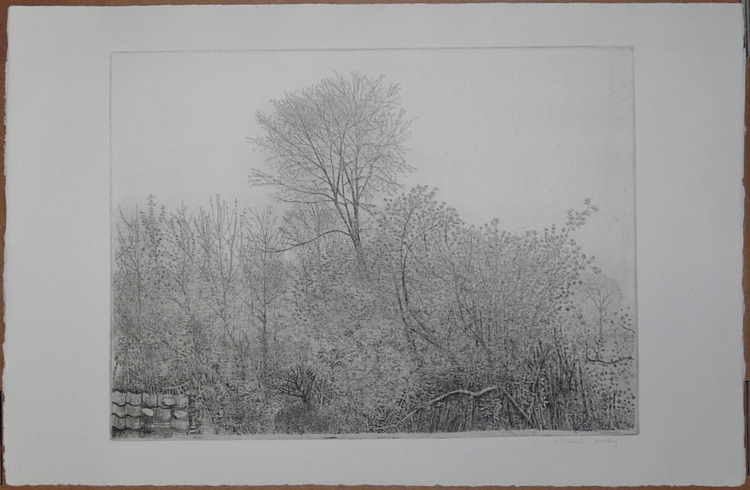 *Mooie ets van de bekende Utrechtse graficus Charles donker. Aanwas in Rhijnauwen met dankpannen, 1980, 3e staat. Met onderschrift in plaat geetst, links: ekster poetst, twijfel - rechts: uitzichtloos, fitis, zwartkop, ringmus, tjiftjaf.