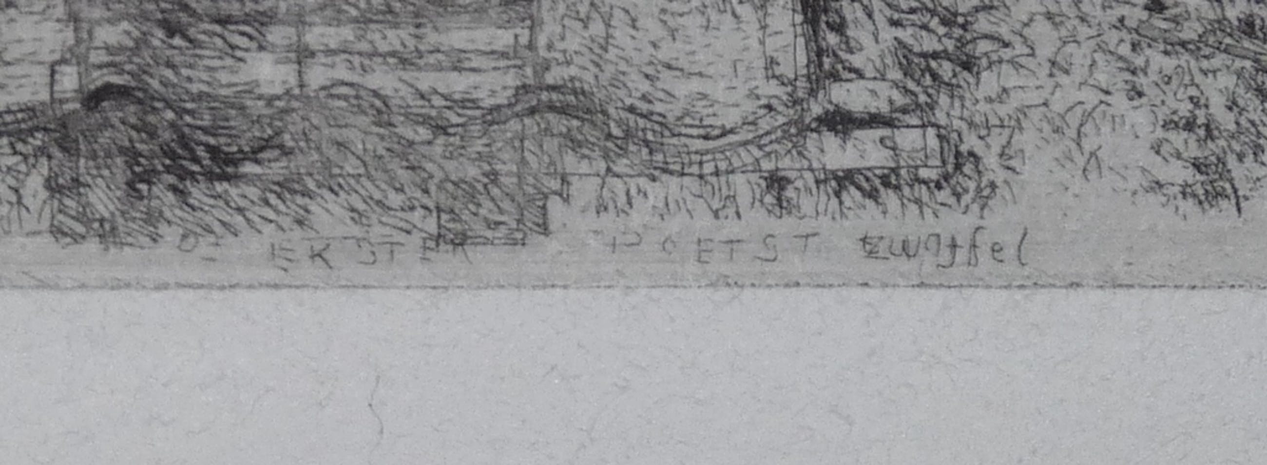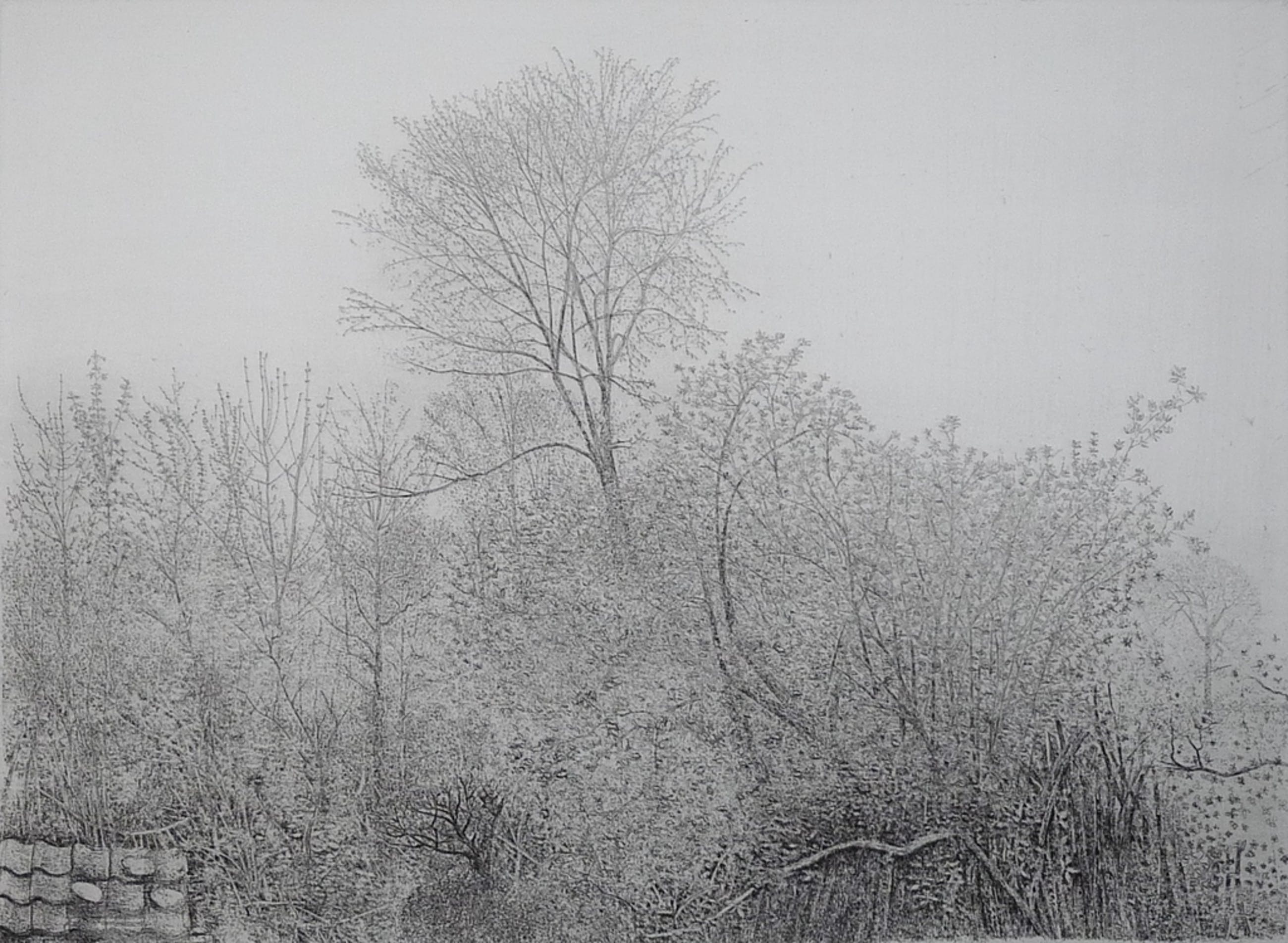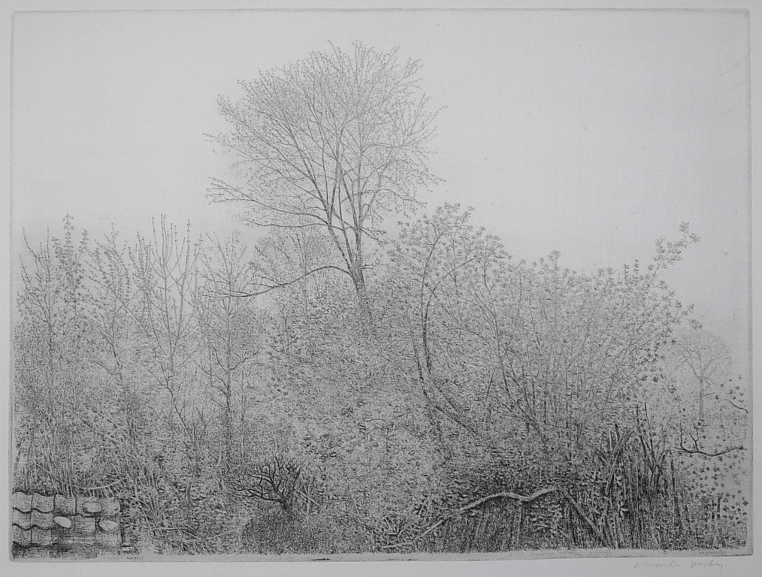 *Mooie ets van de bekende Utrechtse graficus Charles donker. Aanwas in Rhijnauwen met dankpannen, 1980, 3e staat. Met onderschrift in plaat geetst, links: ekster poetst, twijfel - rechts: uitzichtloos, fitis, zwartkop, ringmus, tjiftjaf.