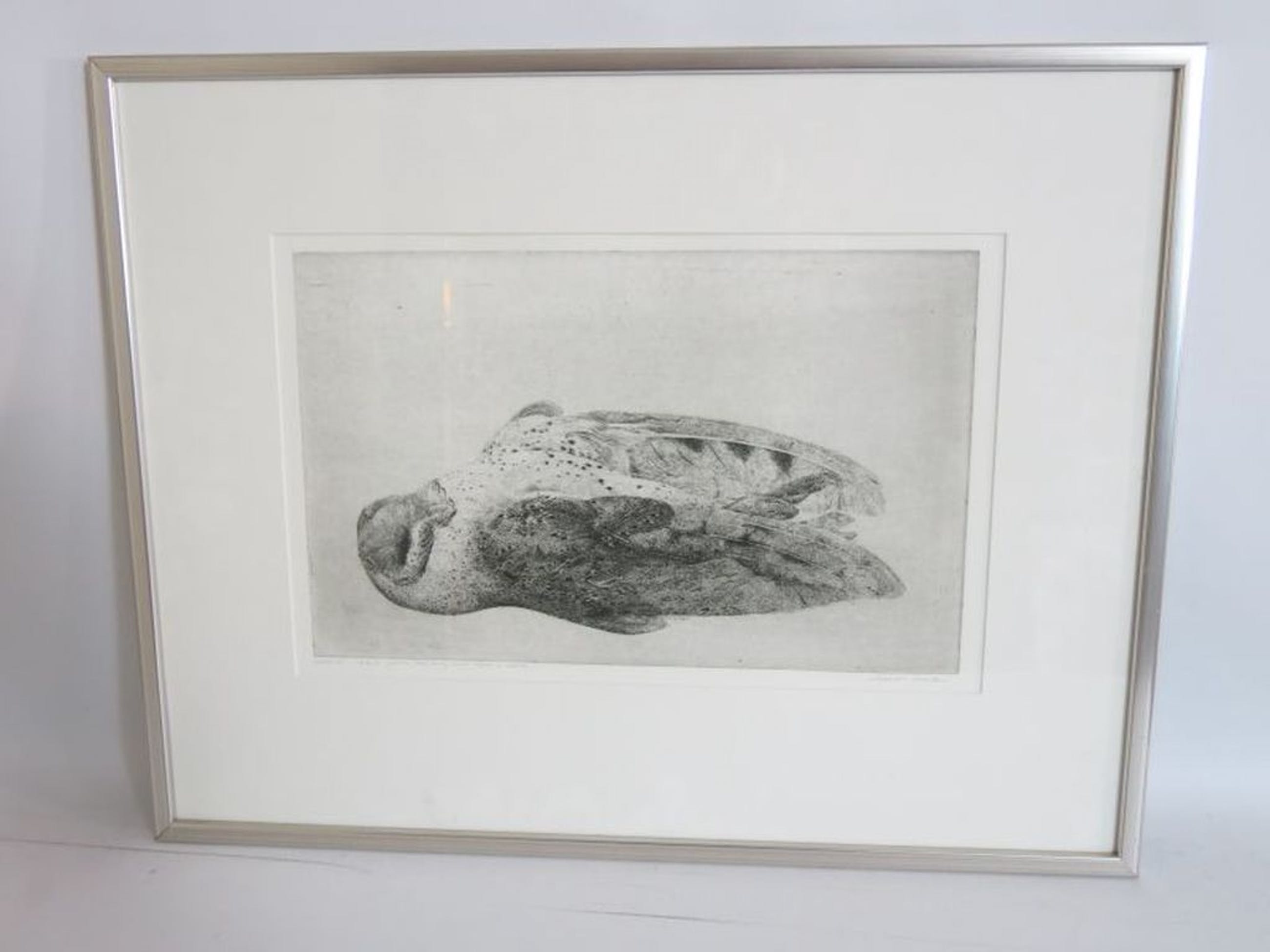 Zeer gedetailleerde ets van een dode kerkuil door kunstenaar Charles Donker