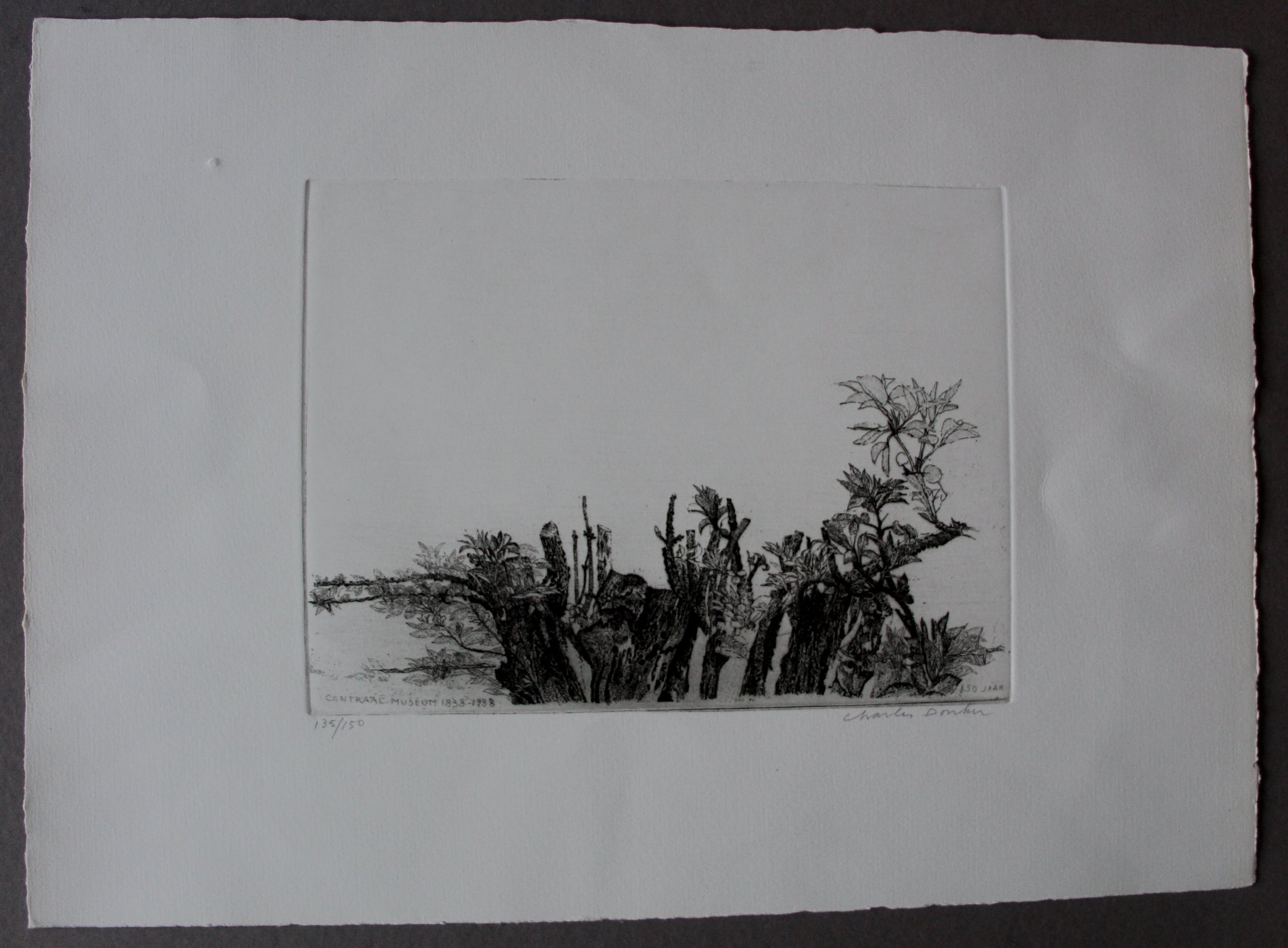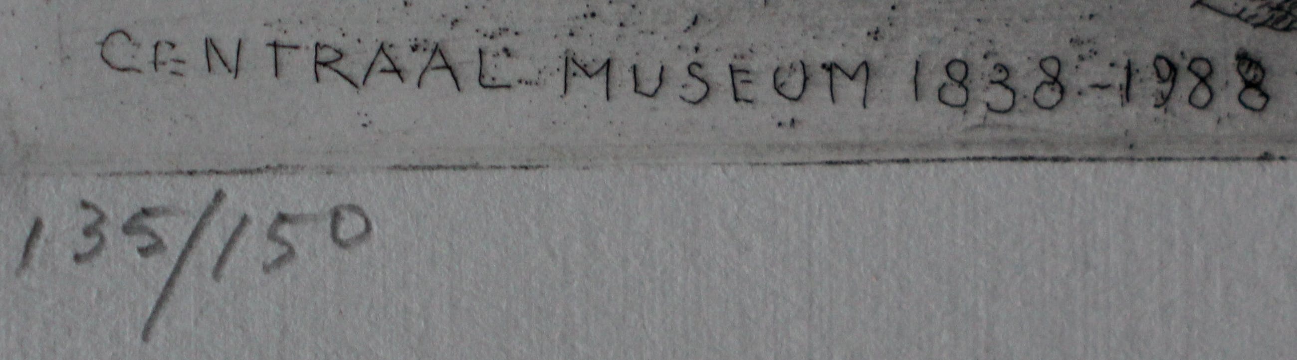 Ets van Charles Donker. Titel: Centraal museum 1838-1988, 150 jaar. Nummer: 135/150. Afmetingen werk: H28 x b39.5 cm. Afmetingen voorstelling: H16.5 x b22cm. Het werk is , rechtsonder, met potlood gesigneerd door de kunstenaar.