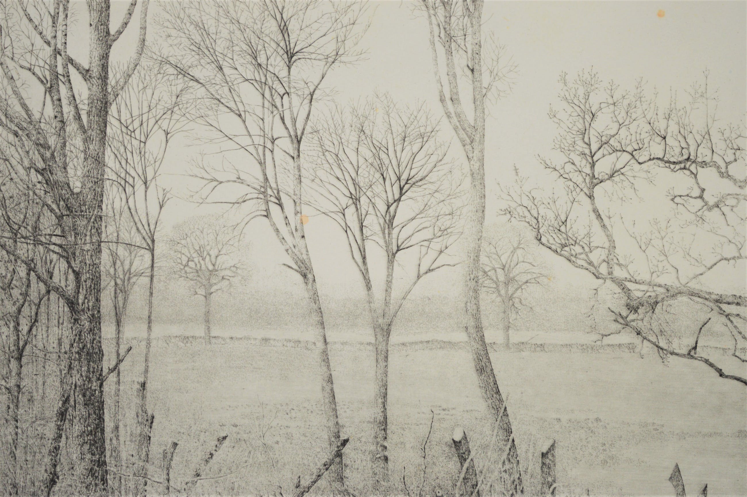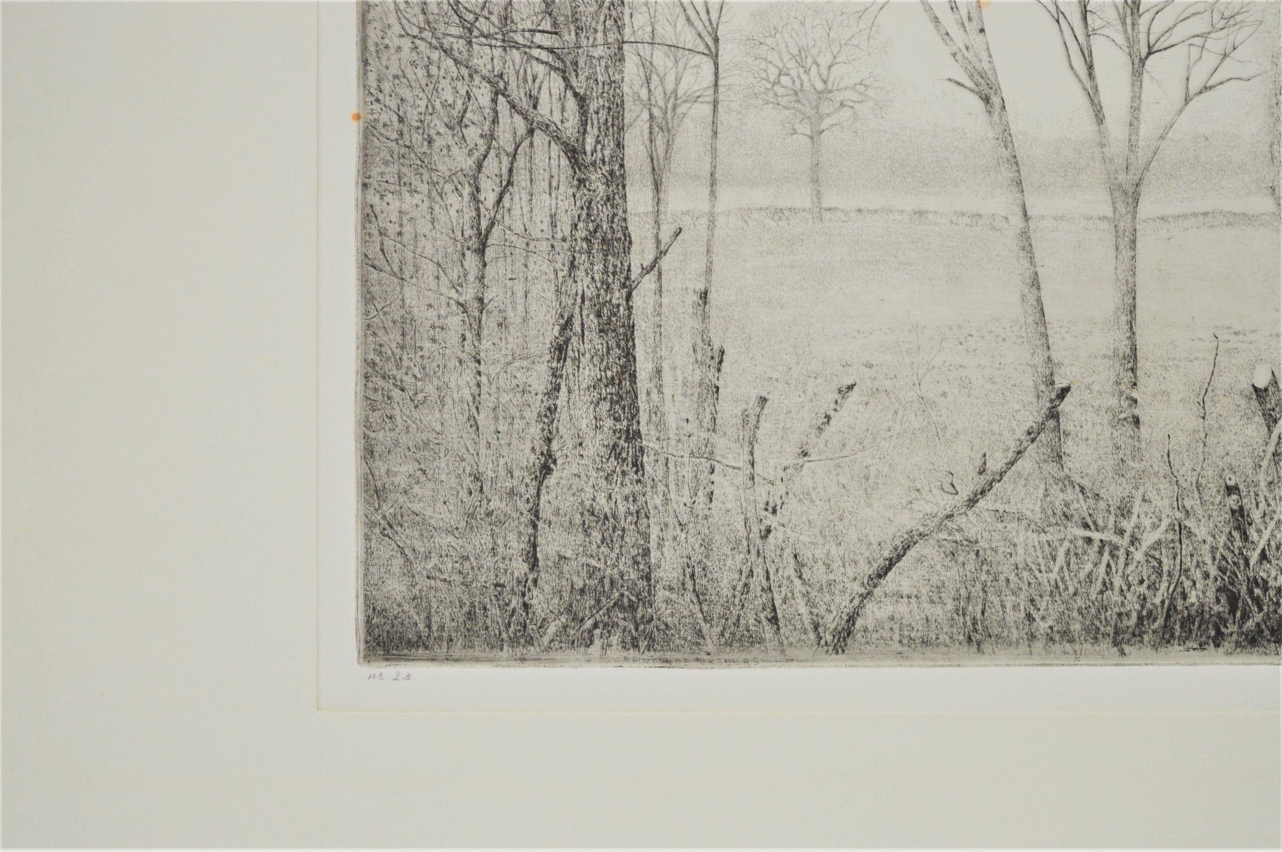 De oplage is mij onbekend. Wel staat links onder no. 23. Gemaakt tussen 1978 - 1982. Opschrift onder in beeld staat heel klein geschreven: BLINKENDE EKSTERS de zwarte kraai de glanzende kraai glimmende kraai de blinkende eksters en snel dalende kauwtjes. Deze ets heb ik toendertijd gekocht bij Galerie Petit aan de Nieuwezijds Voorburgwal in Amsterdam.