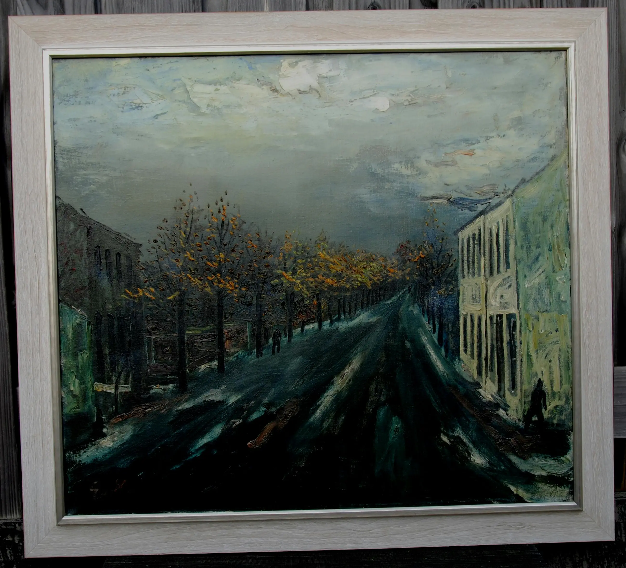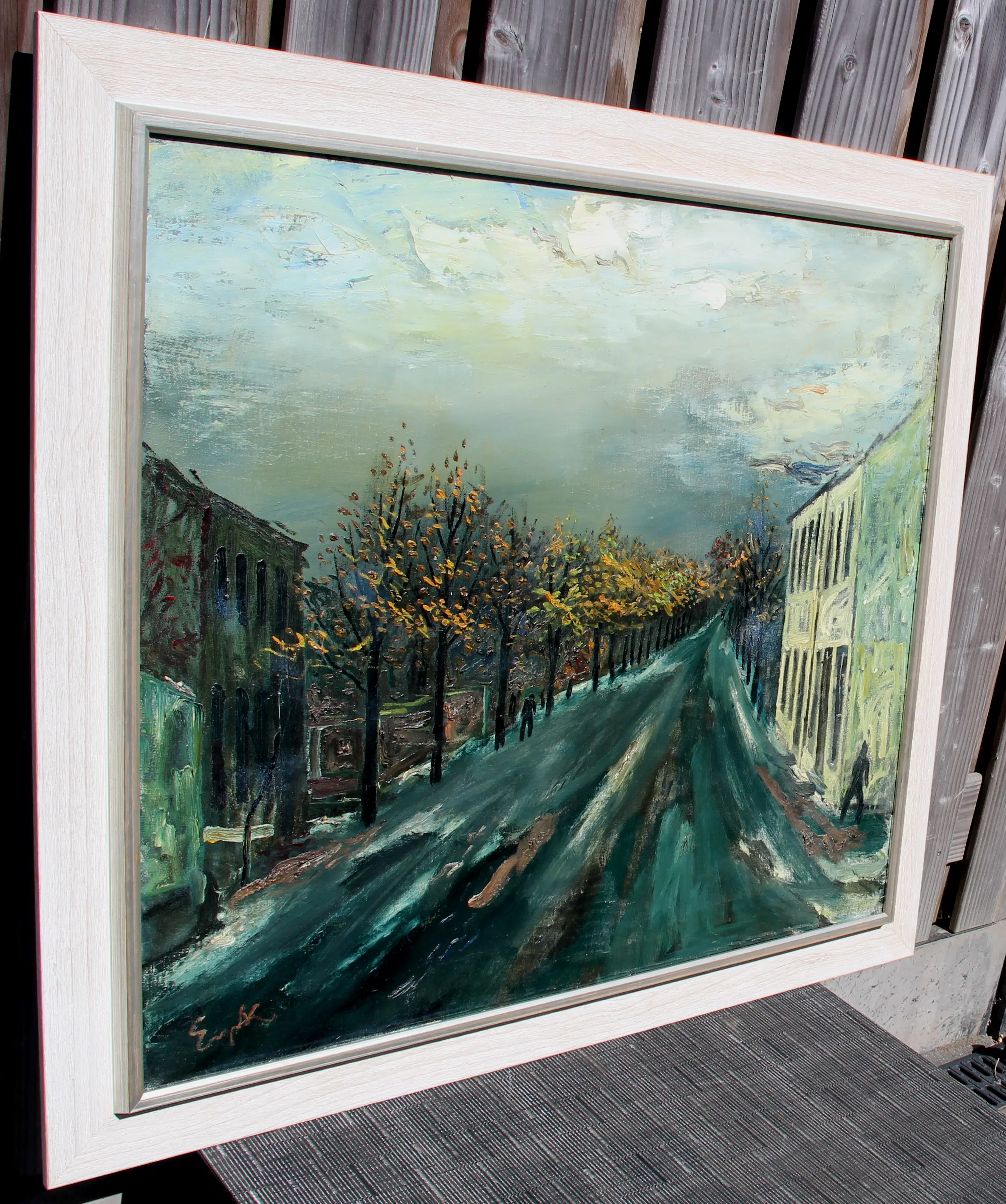 Ingelijste olieverf op doek, van Charles Eyck. Voorstelling van een straat te Valkenburg. Het werk is links onder gesigneerd door de kunstenaar.