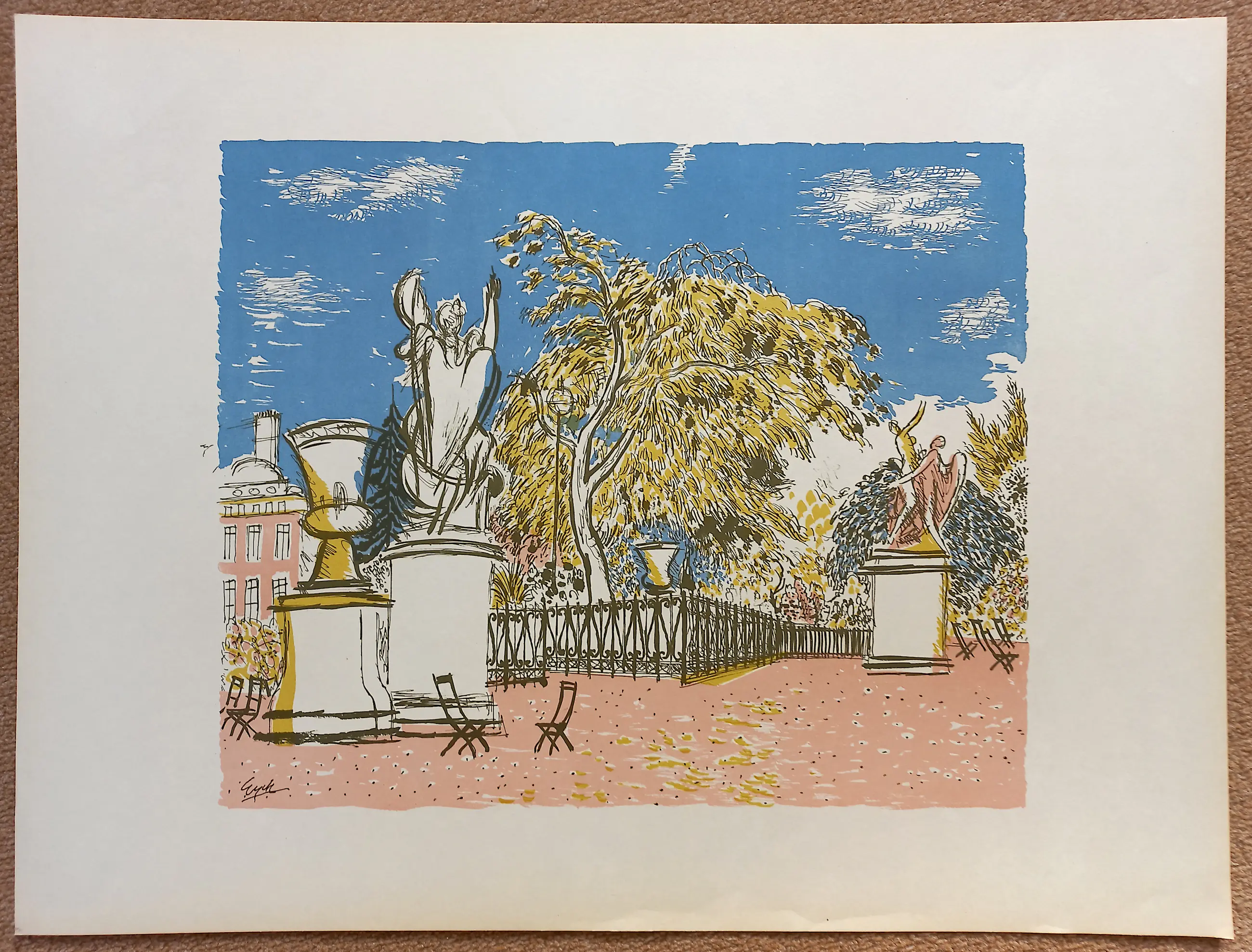 Zeer mooie litho van Charles Eyck uit de serie Schildersprenten (1947). De Jardin du Luxembourg in Parijs. In de steen gesigneerd linksonder. In goede conditie.