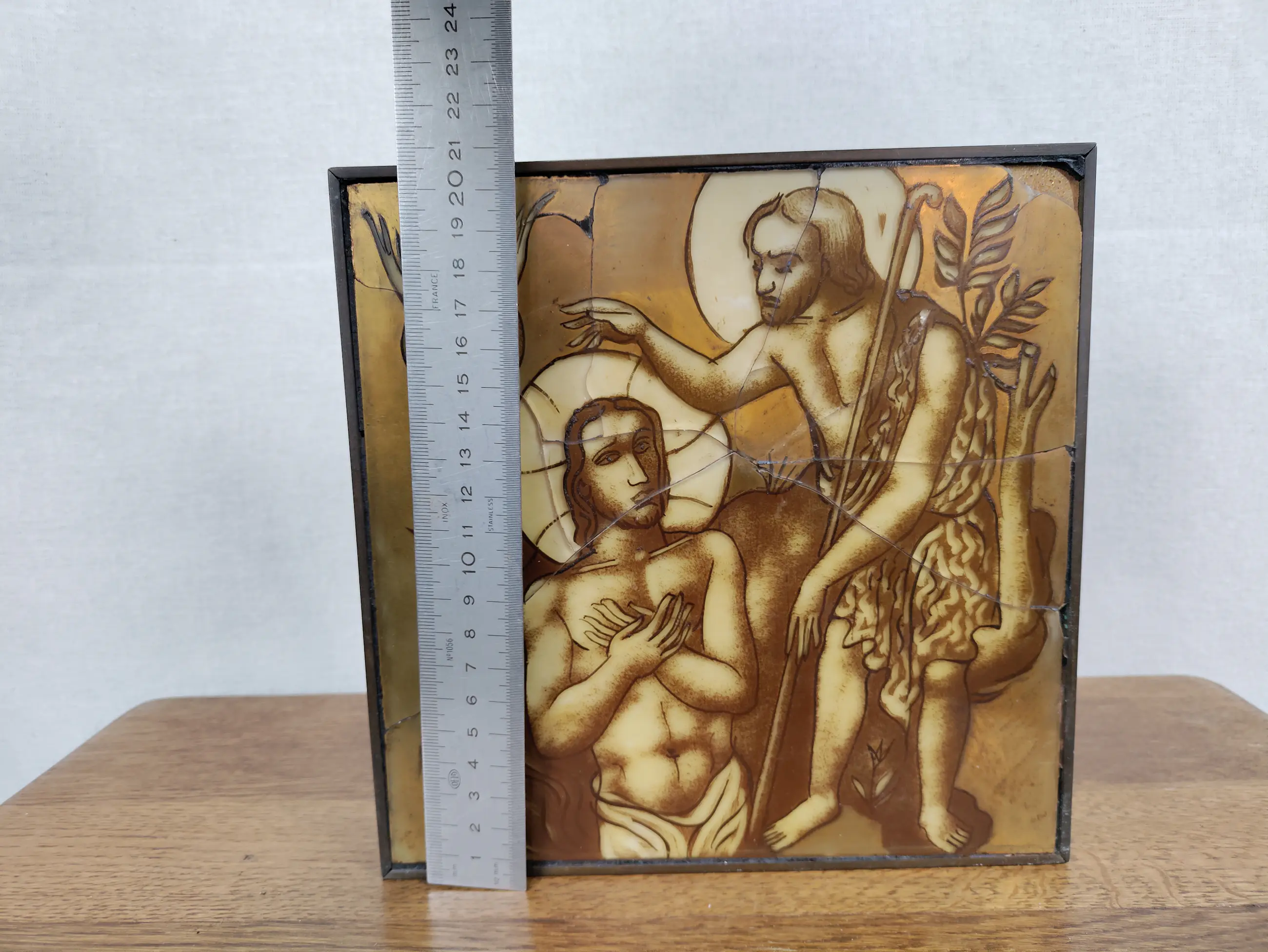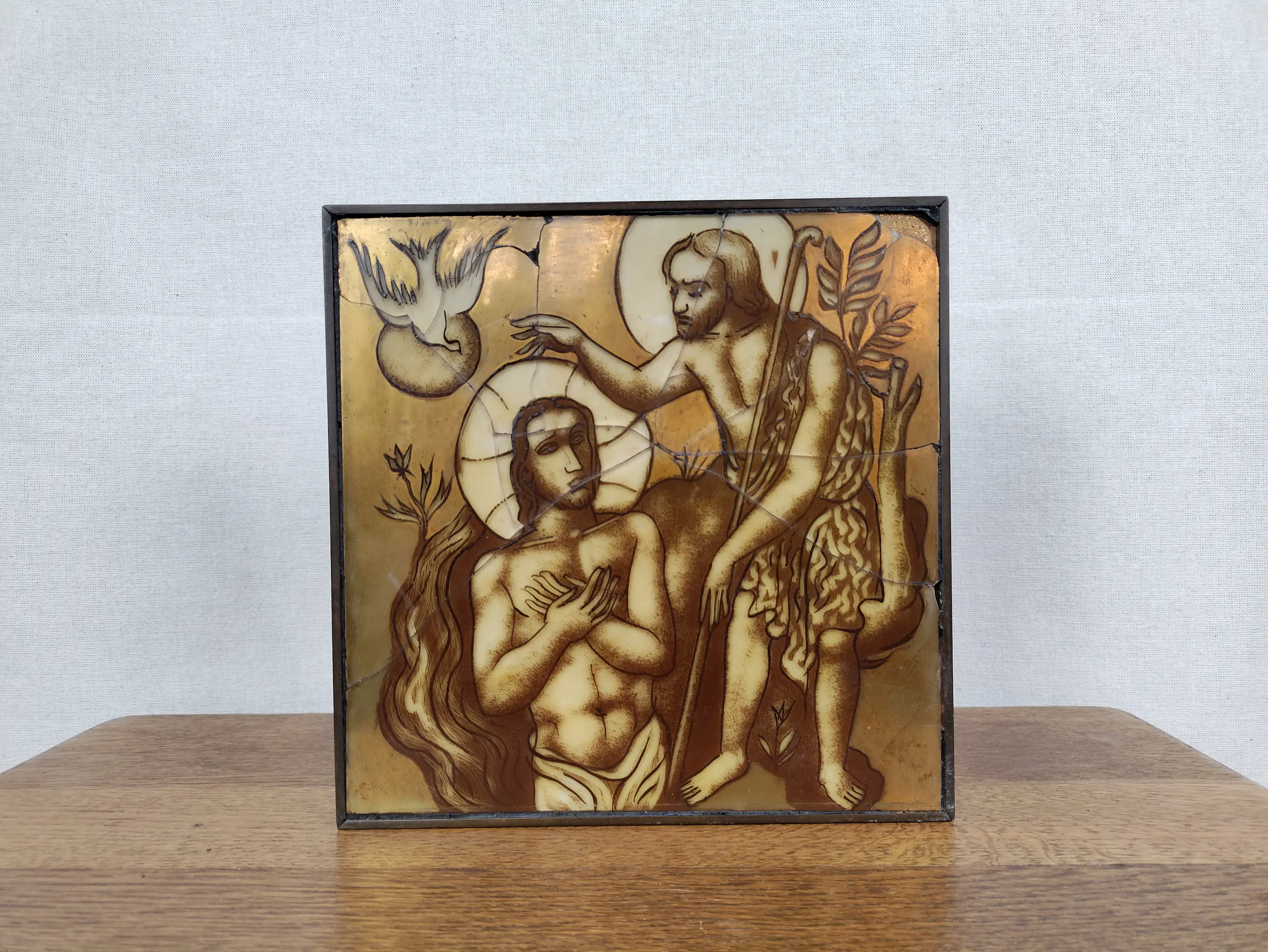 Religieus glas schildering. Van Charles Eyck. Jezus wordt gedoopt in de Jordaan door Johannes de Doper. Uit een familie erfenis, 1953