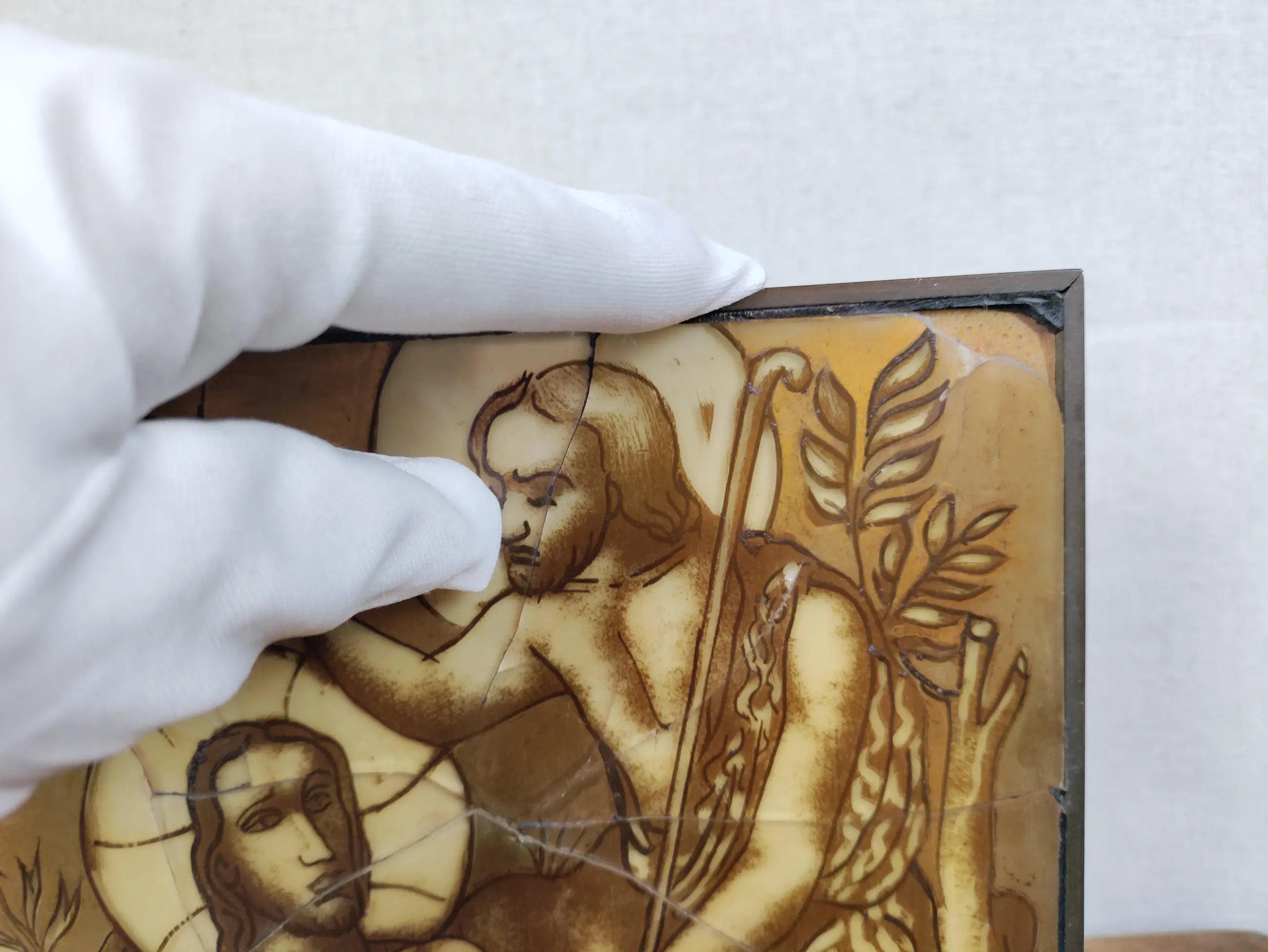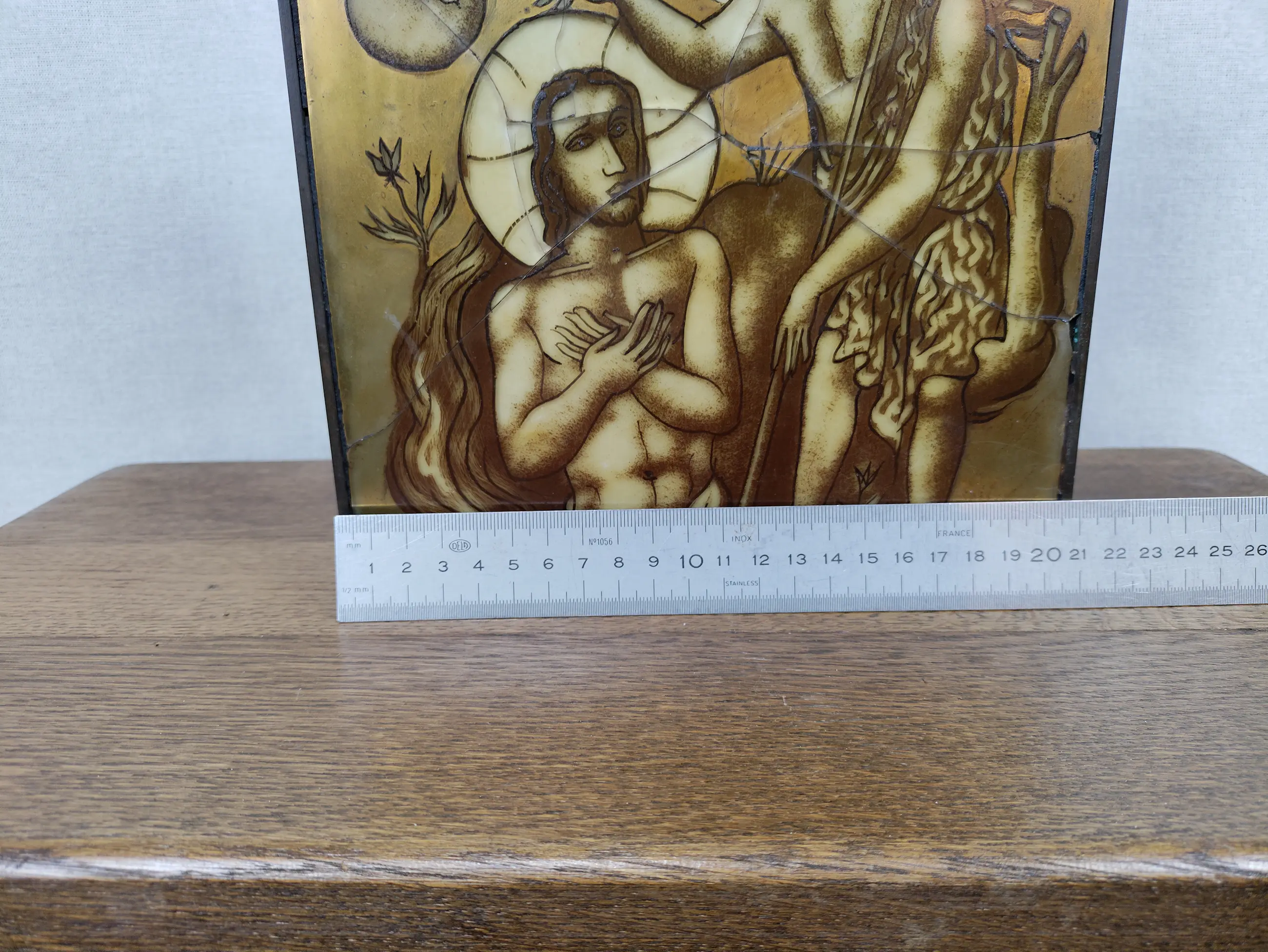 Charles Eyck kreeg opdrachten kerkramen te maken en dit met breuken ok glas in lood te maken, is een voorstudie die binnen familie is gebleven. Uniek magnifiek object.