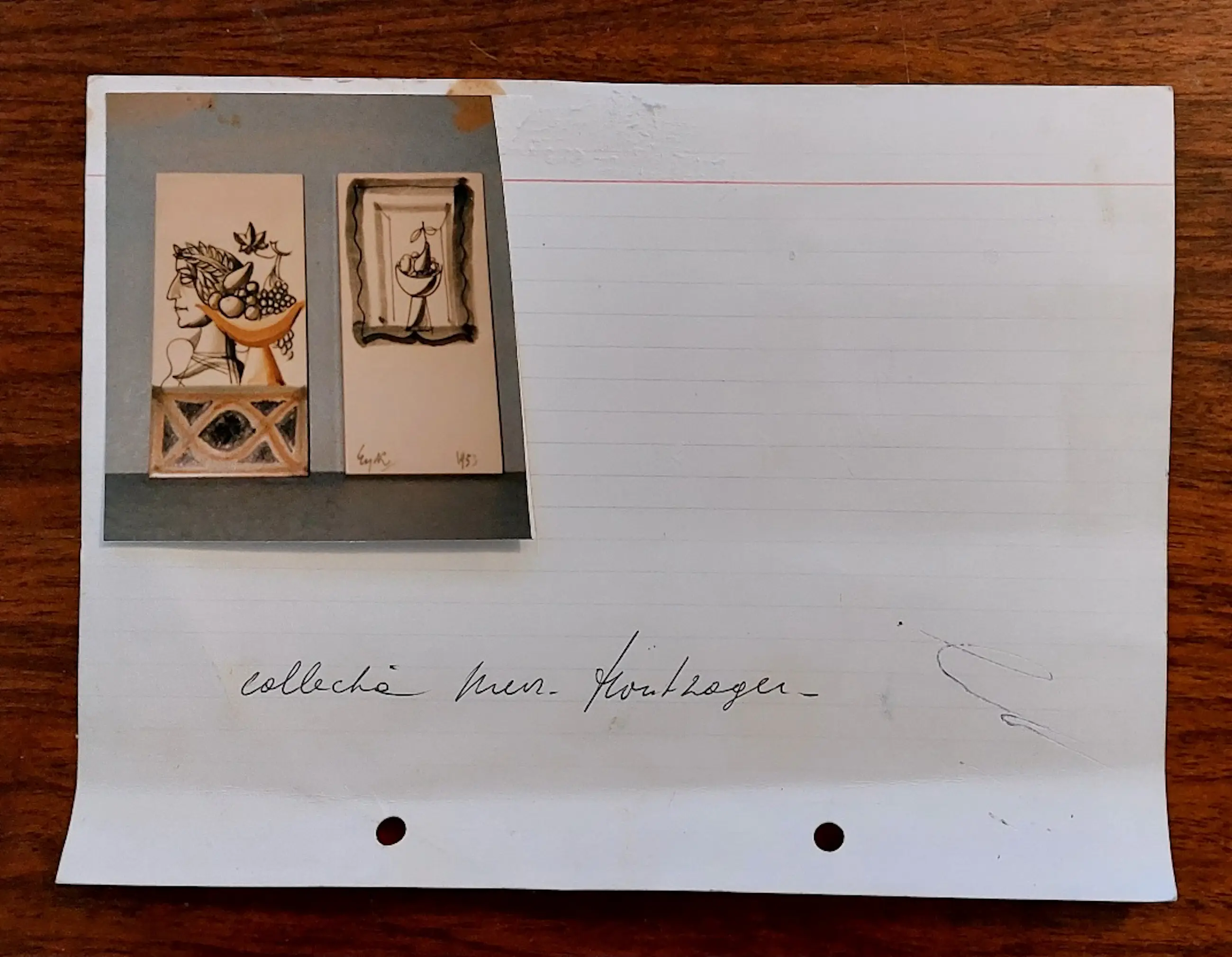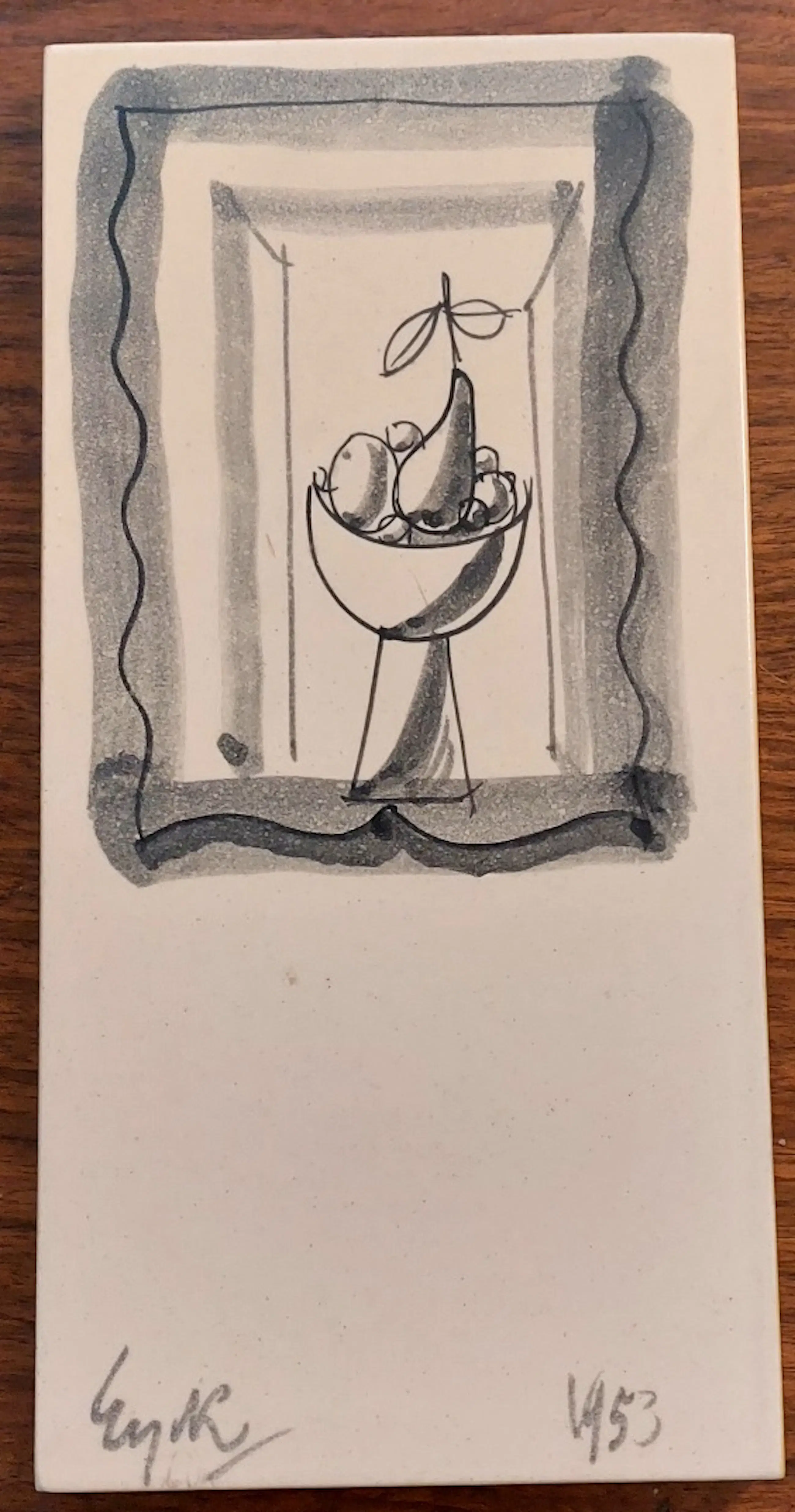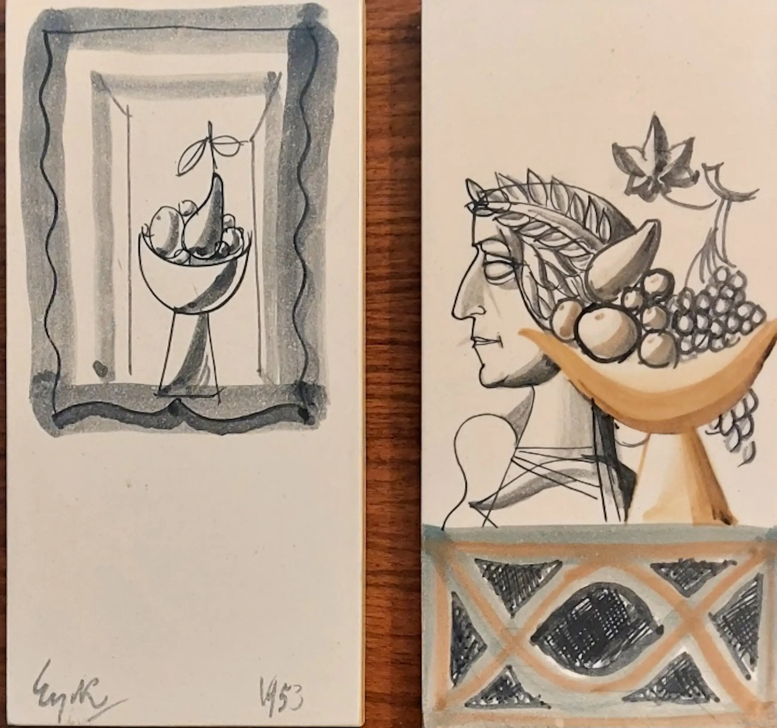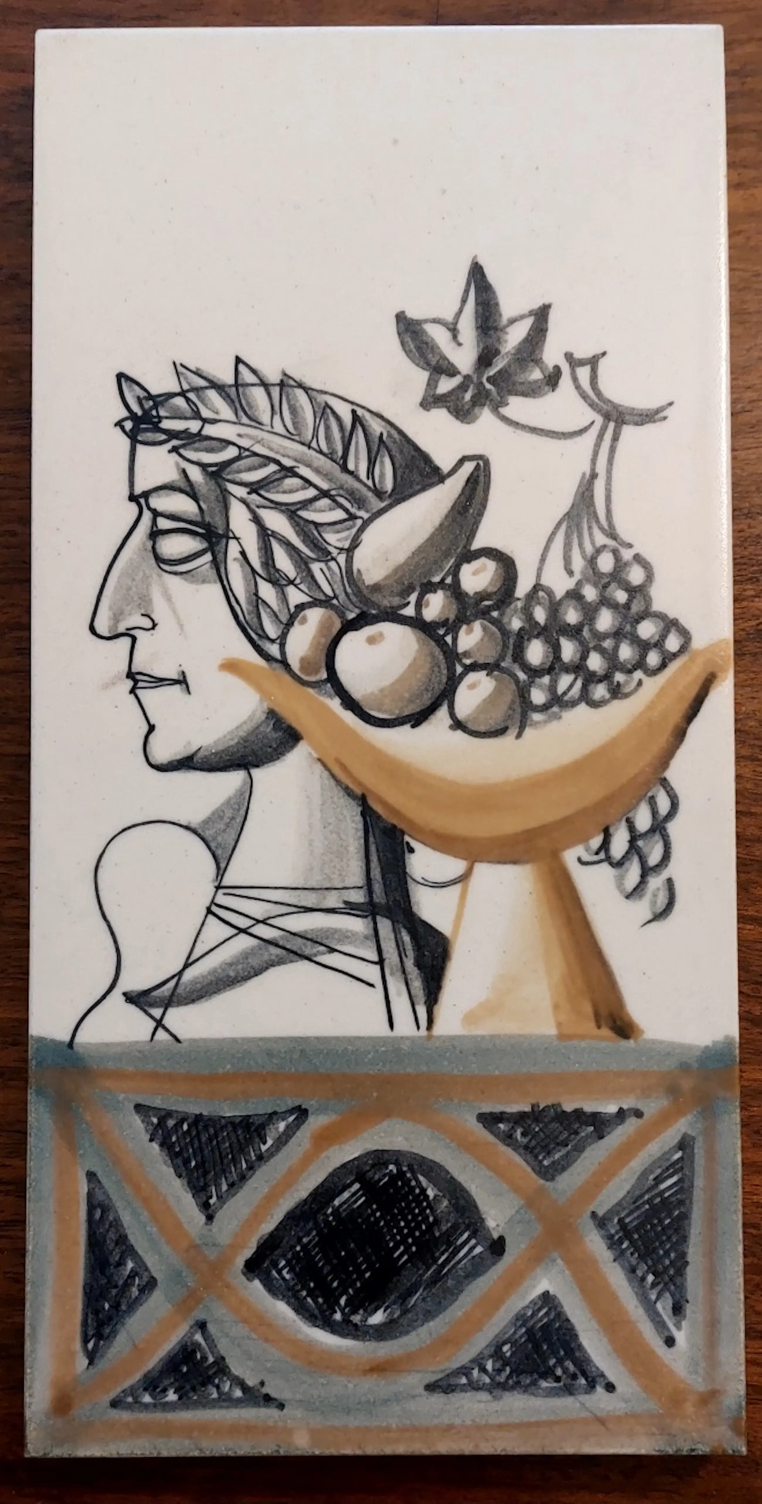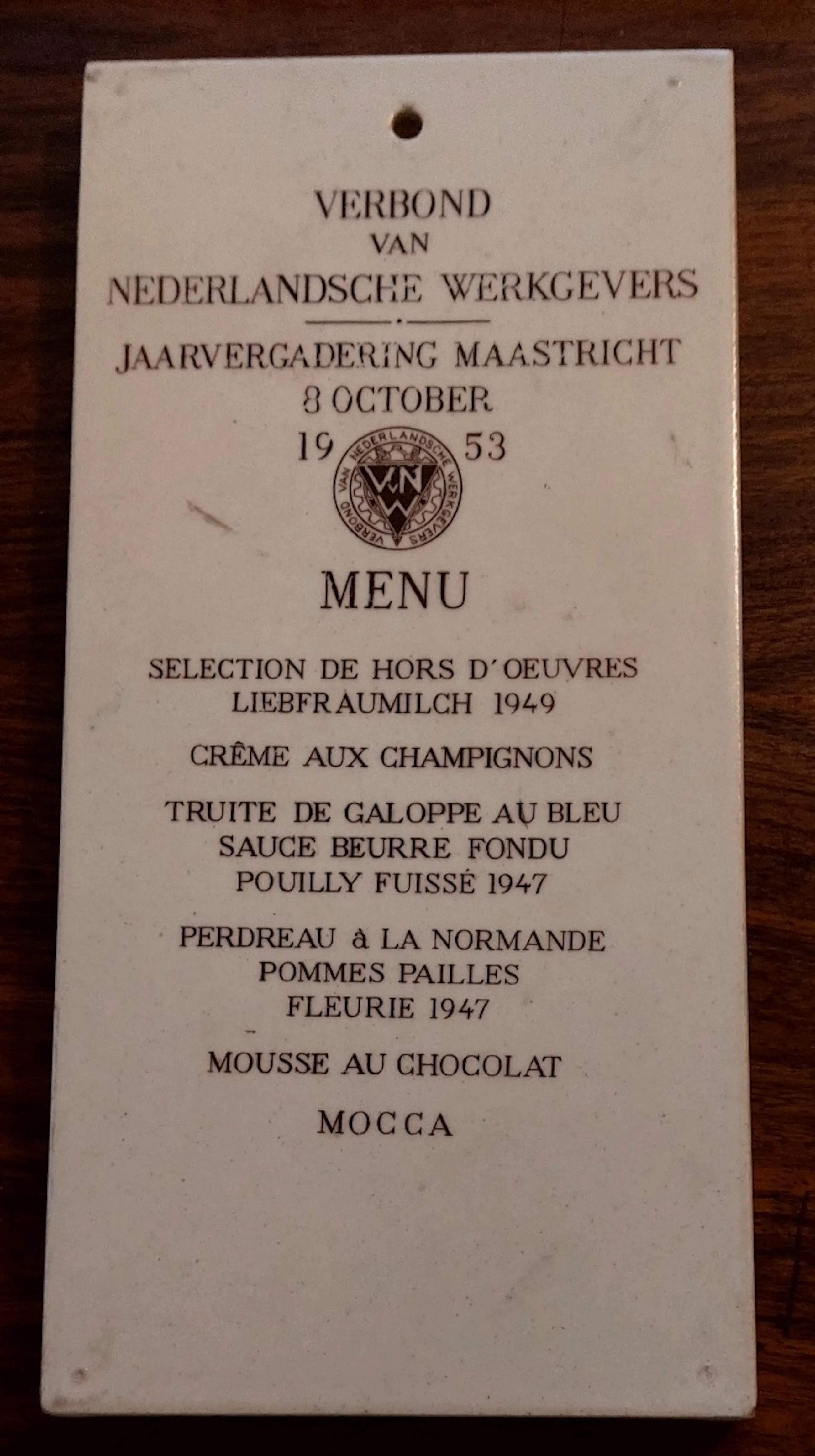 Twee keramische tegels beschilderd (in opdracht) door Charles Eyck. Op de achterzijde is een menu afgebeeld. Eyck maakte in totaal 15 tegels. Waarvan twee hier aangeboden. De tegels werden gemaakt in opdracht van' Het Verbond van Nederlandse Werkgevers' voor hun jaarlijkse diner. Waar de resterende tegels zijn is onbekend. De hier aangeboden tegels komen uit de nalatenschap van Mevrouw Houtzager, voormalig directeur van Het Centraal Museum in Utrecht. De tegels zijn gebakken bij Petrus Ragout in Maastricht