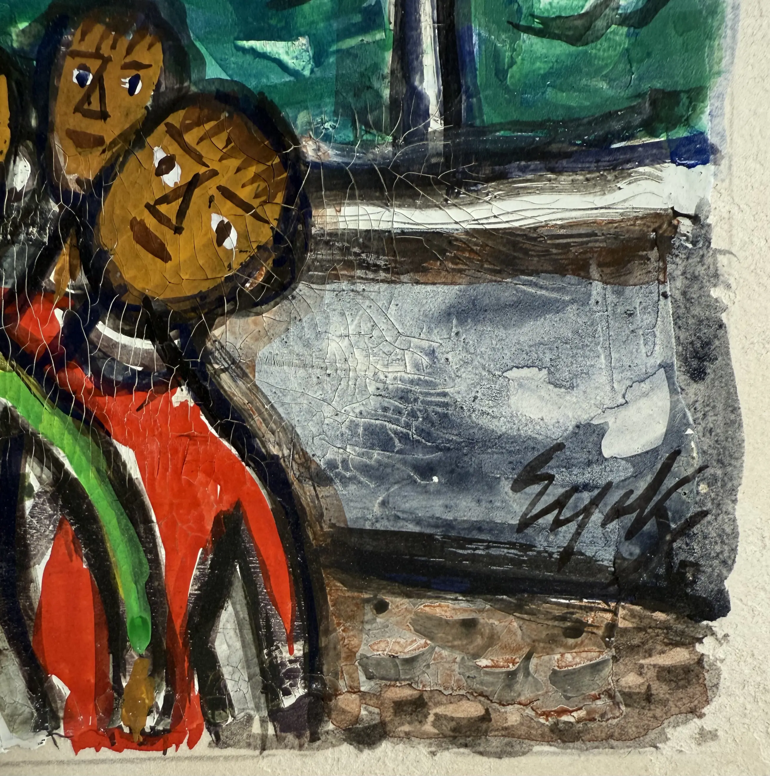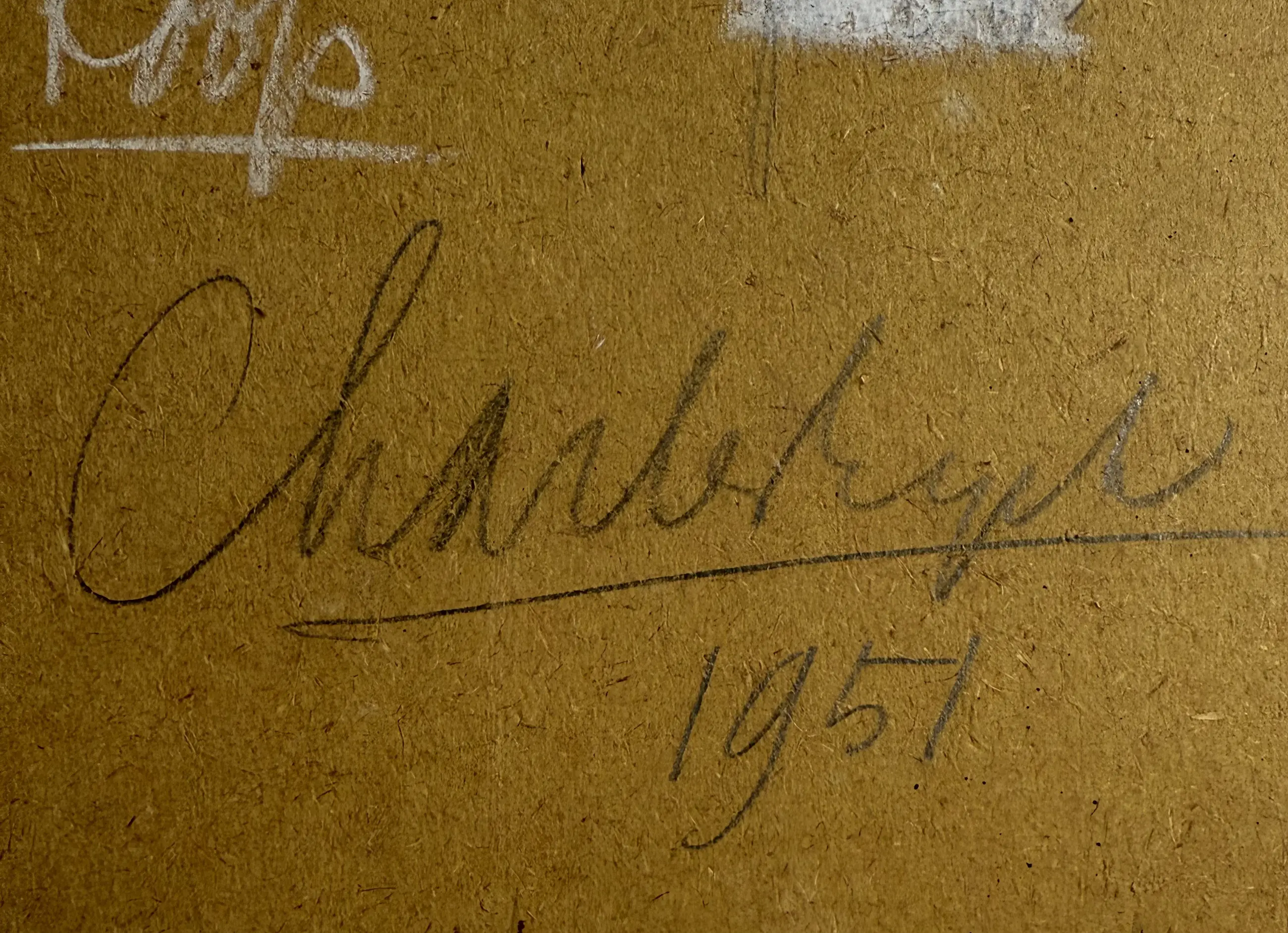 Het werk is zowel op de voorzijde, als op de achterzijde van het karton gesigneerd. Verder nog op het board gesigneerd en getiteld waar het werk ooit mee is ingelijst geweest. Zie de laatste twee foto's.Dit houten lijstje heeft z'n beste tijd gehad en het werk verdient dan ook iets nieuws.