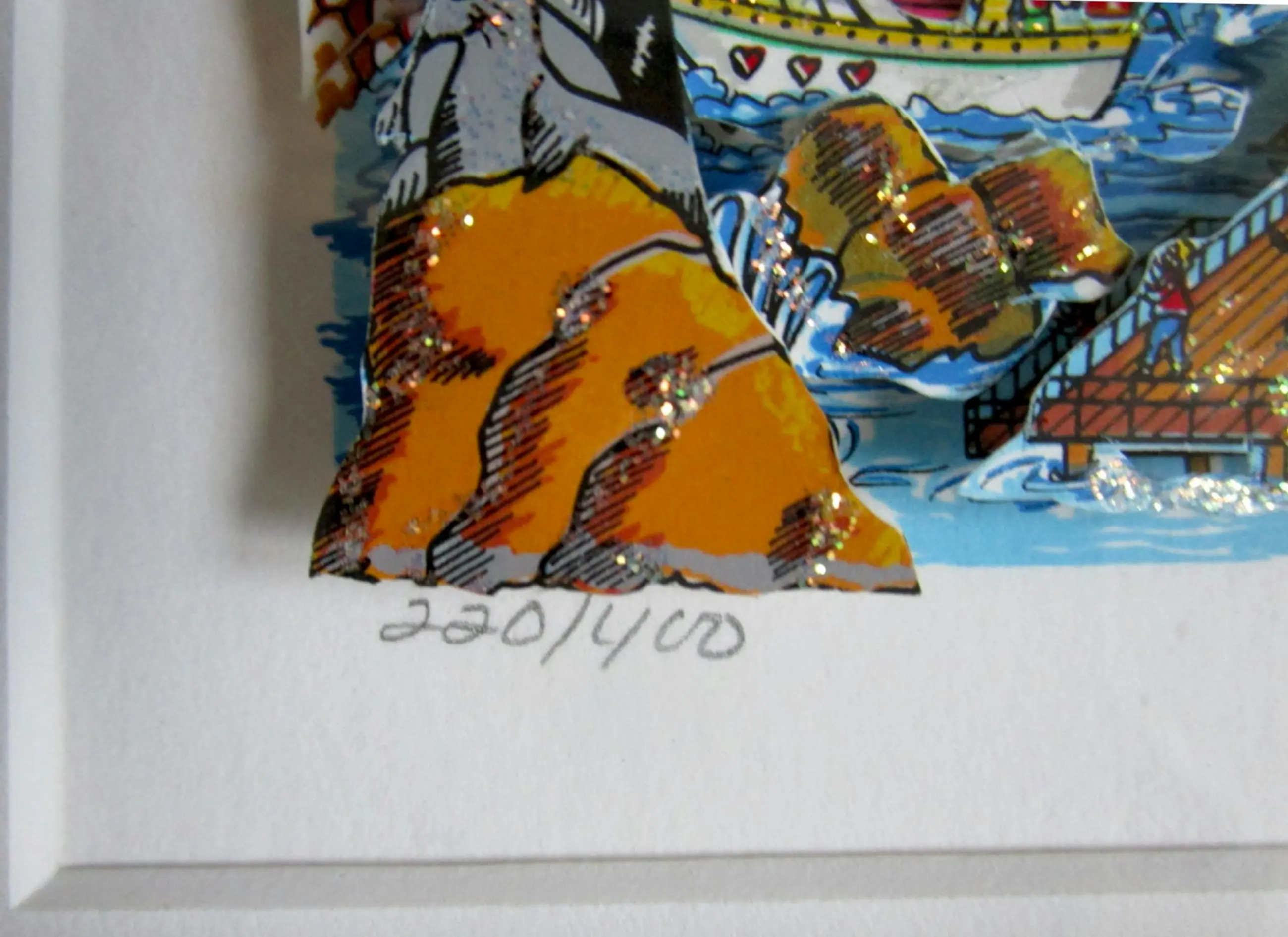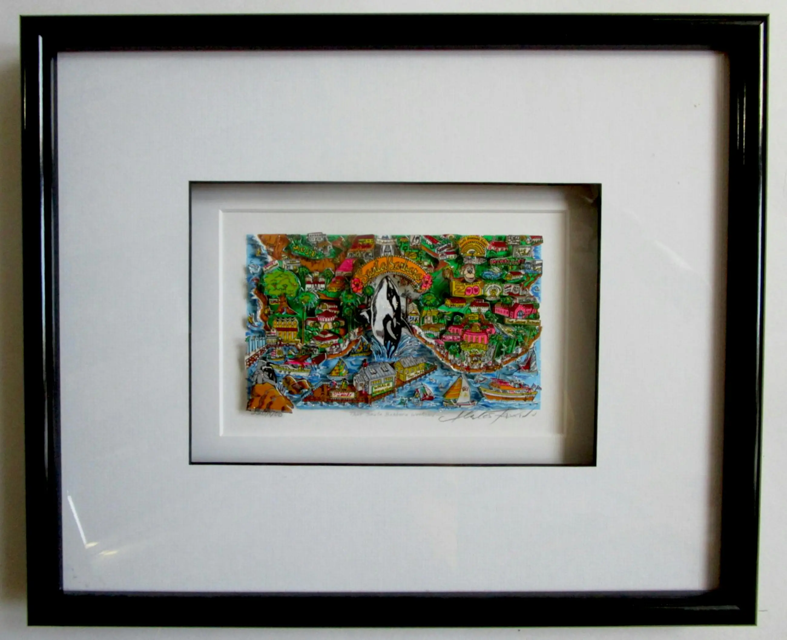 3D-ontwerp door Charles Fazzino Titel: "Dat weekend in Santa Barbara..." Publicatiejaar: 1995 Oplage: 400 exemplaren, dit is nummer 220/400 Handgesigneerd en handgenummerd Afmetingen van het motief: ca. 17 cm x 11 cm Frame: Hout / zwart Afmetingen van de lijst: 40 cm x 34 cm Conditie: in zeer goede staat, zie foto's!