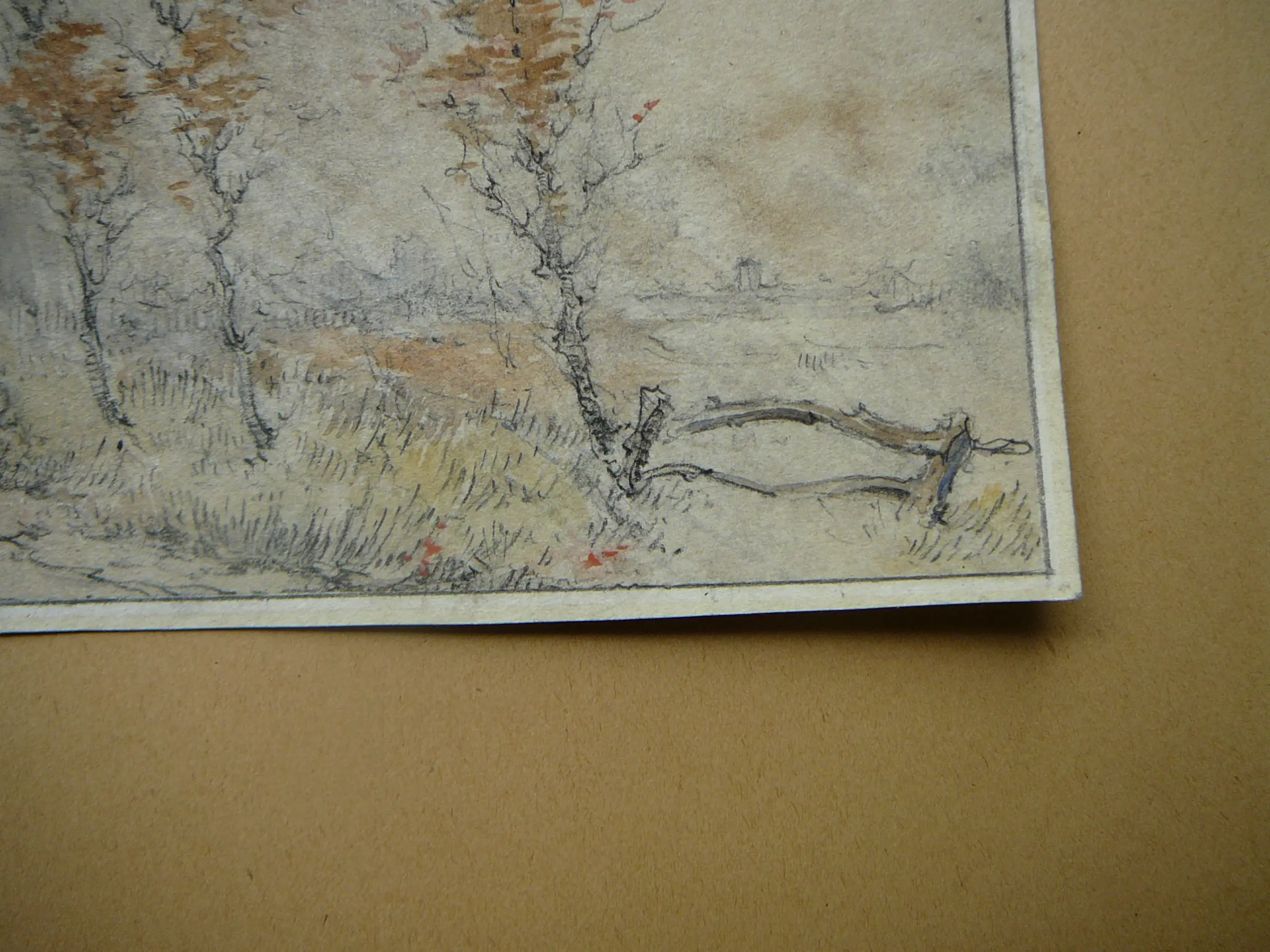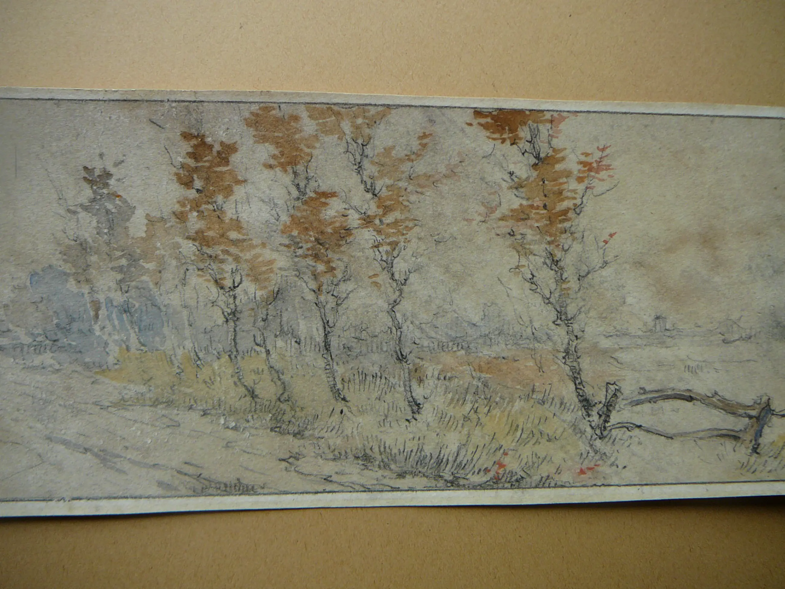 Mooi langwerpig aquarel van landschap met boerderijtjes bij Vught door Charles Grips (1907-1955). . Aquarel en potlood. . Grips werd geboren in een kunstenaarsfamilie, hij was een zoon van de schilder Frits Grips en Hendrika Maria Font Freide. Hij trouwde met Johanna Maria Petronella Ghijben.