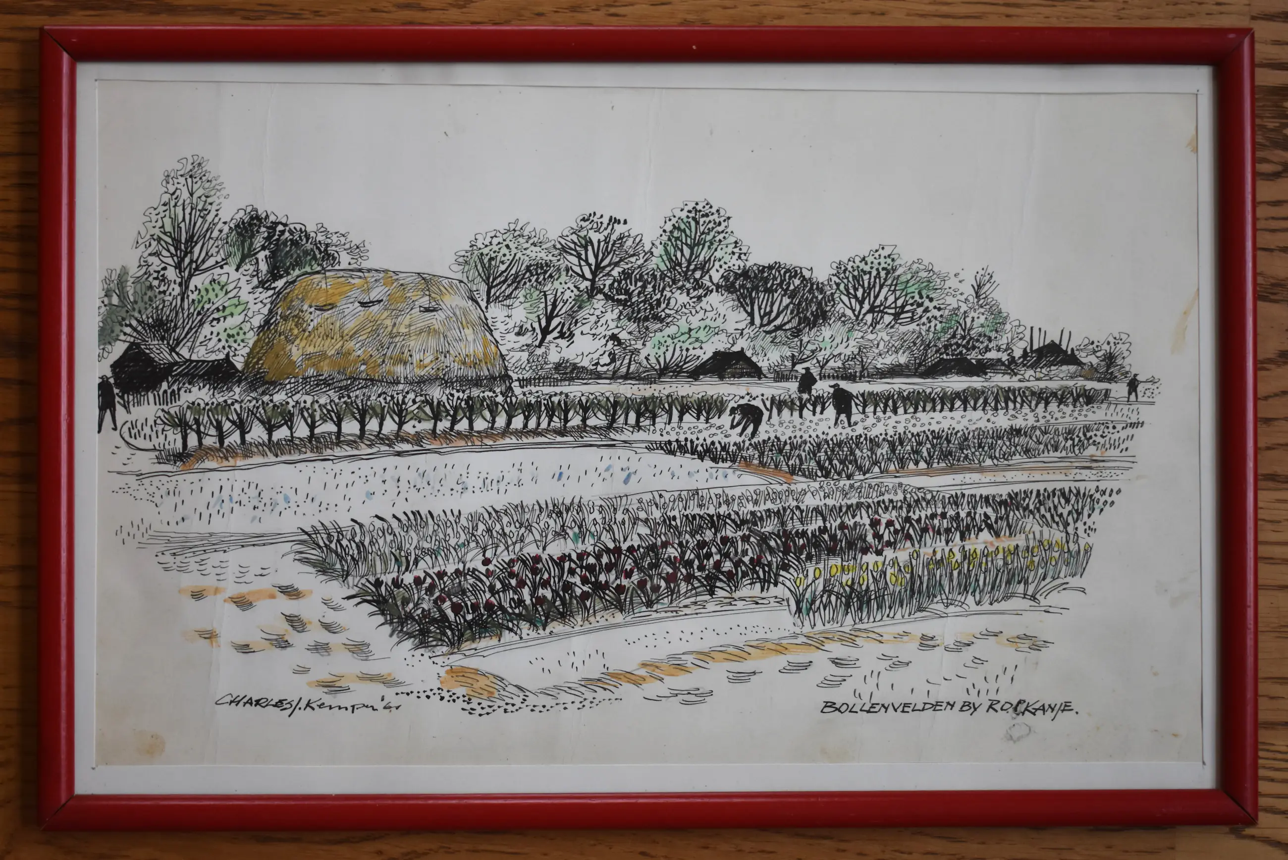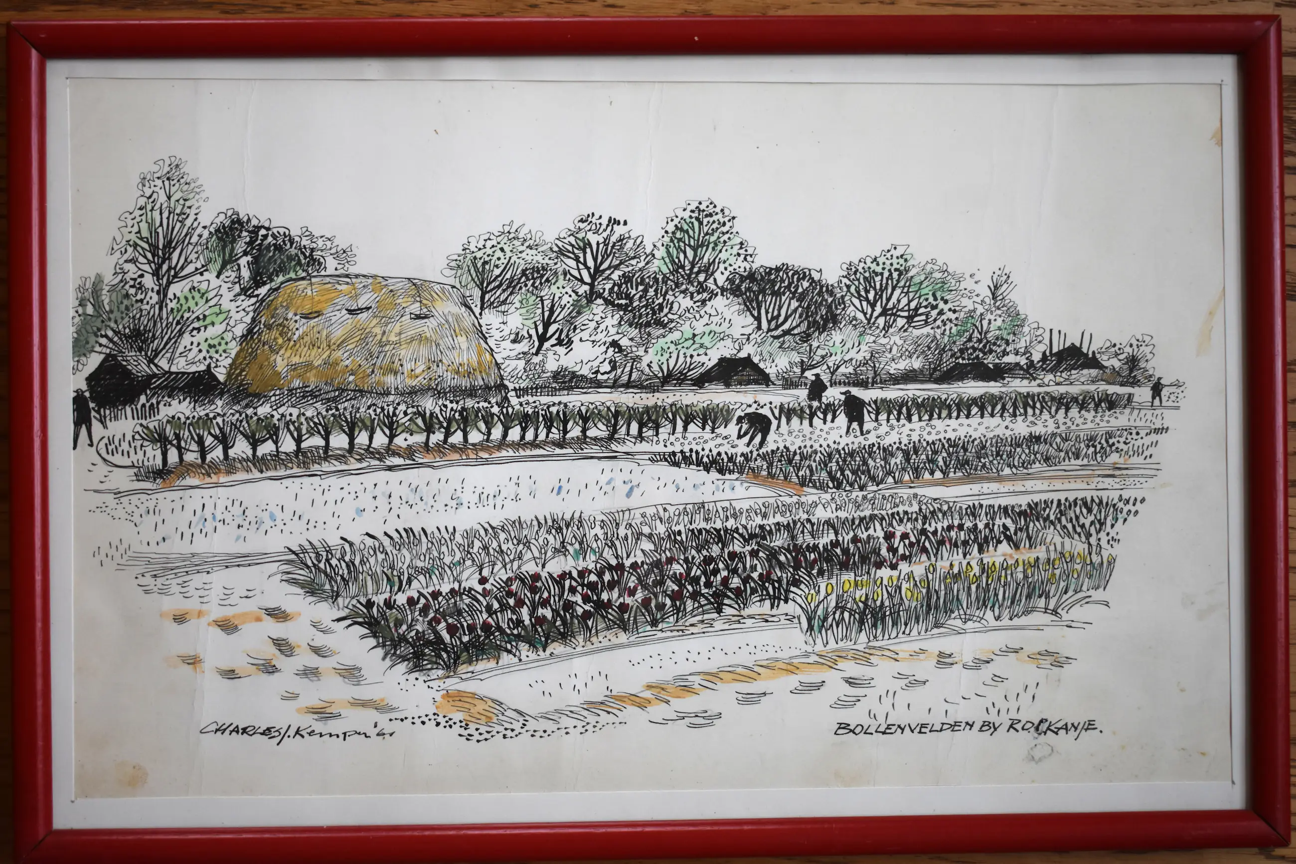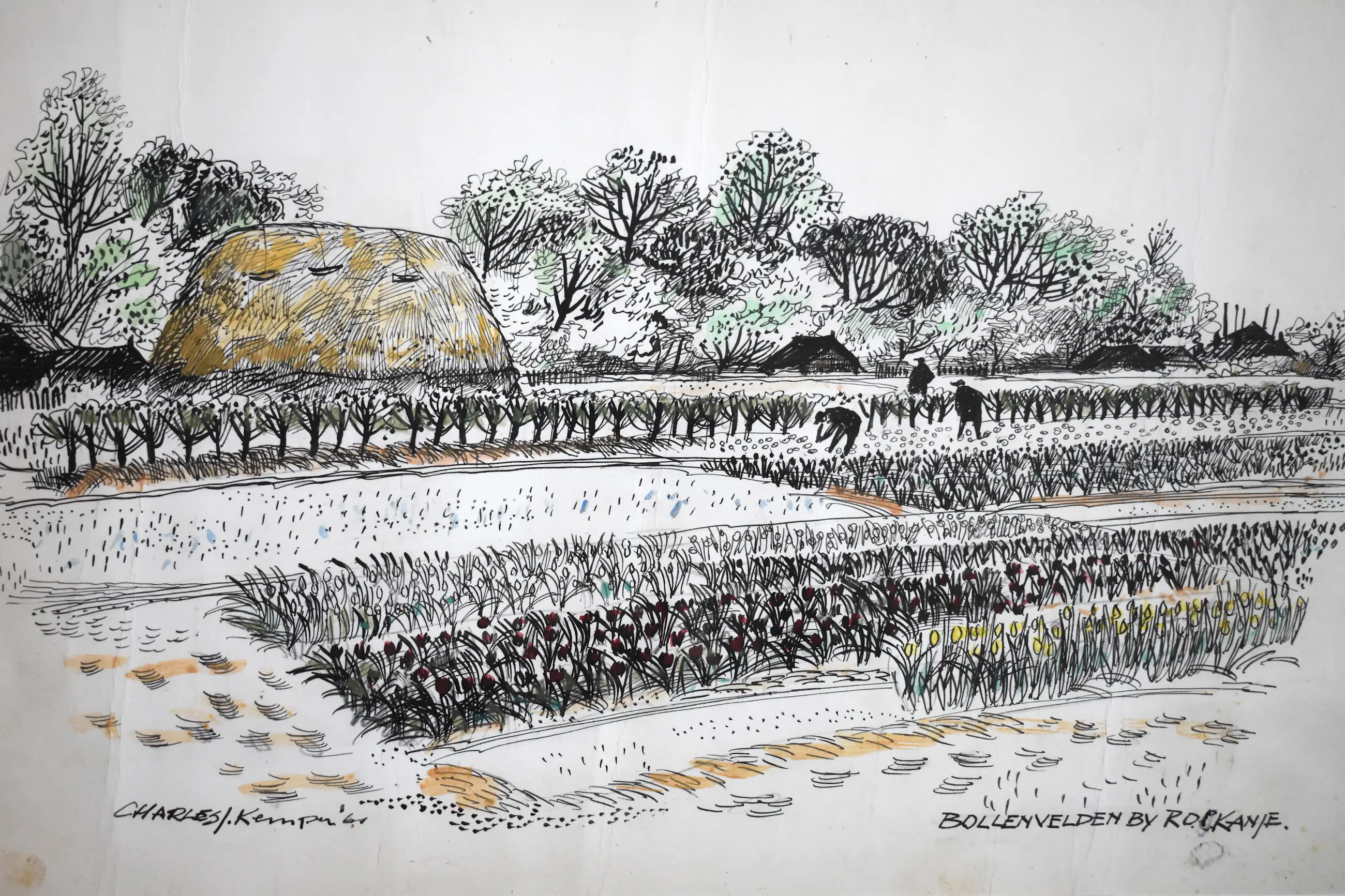 Charles J Kemper is vermaard om zijn vele zeer gedetailleerde tekeningen van Rotterdam en omgeving gedurende wereld oorlog 2. Het Rotterdamse gemeente archief bezit zeer veel werk van hem en gaf zelfs boeken uit vol met tekeningen van deze kunstenaar. Ook na de oorlog bleef Kemper nog doorwerken en kreeg in 1953 de Willink van Collenprijs voor zijn oeuvre. De hier aangeboden bijzondere tekening zit in een lijst en heeft 2 lichte niet storende kreukvouwen en een kleine papier correctie onder de c van Rockanje.