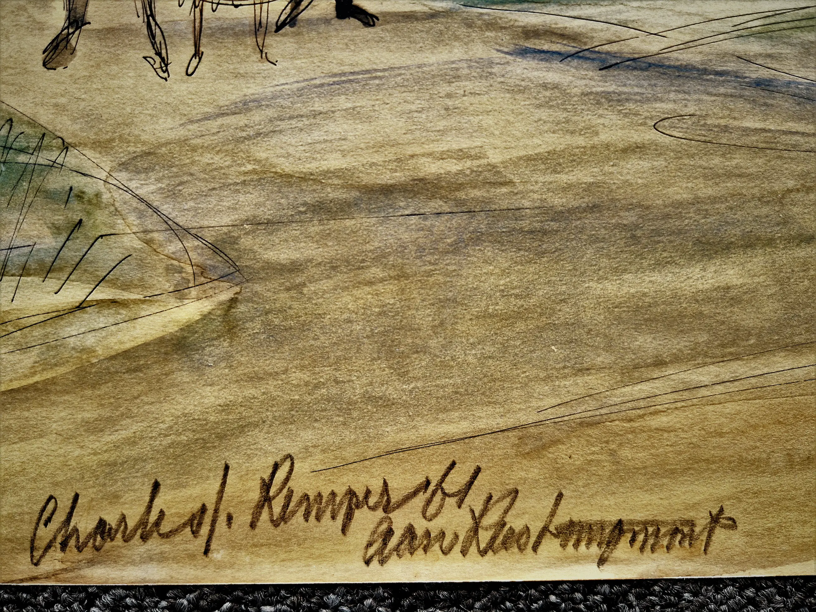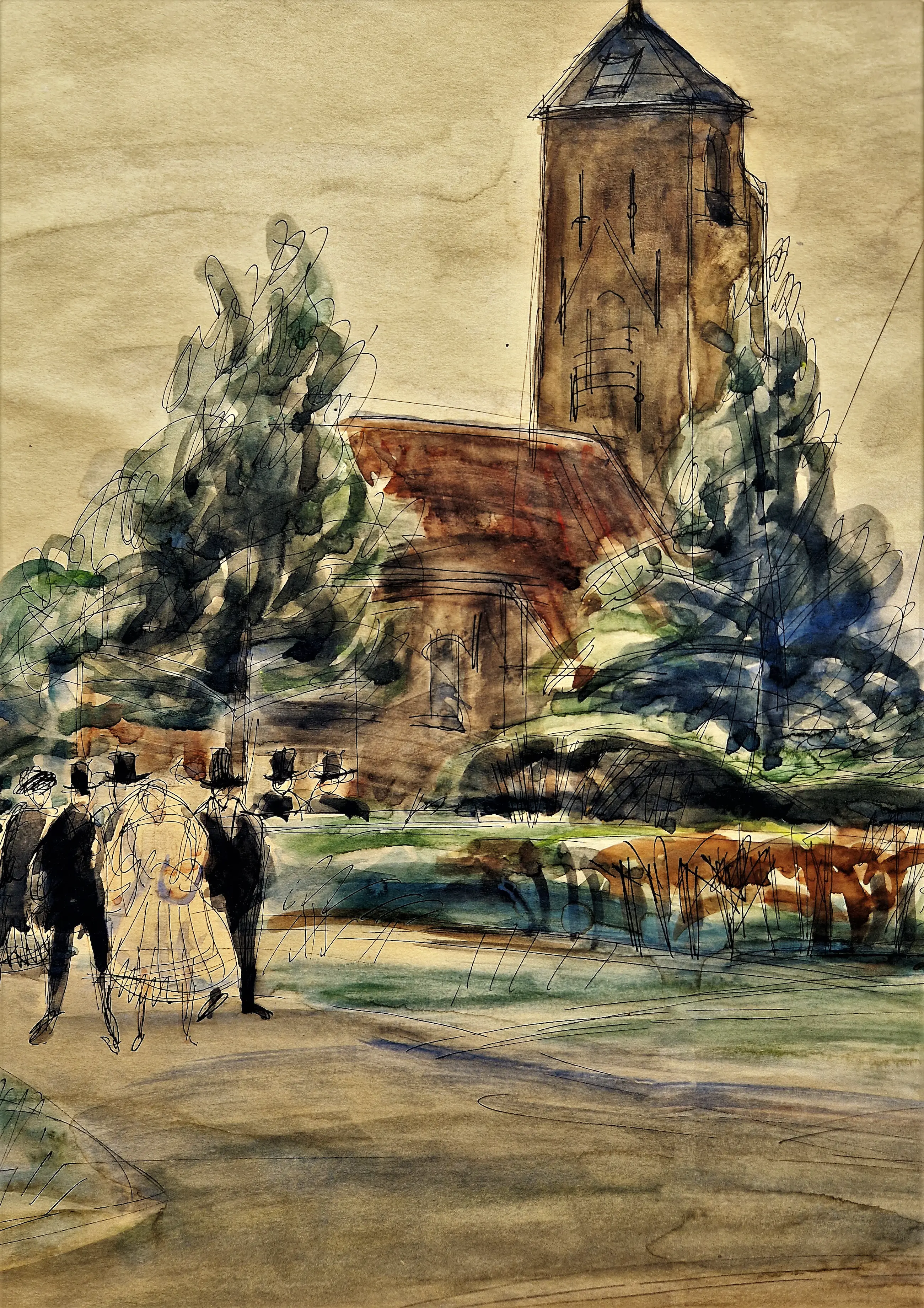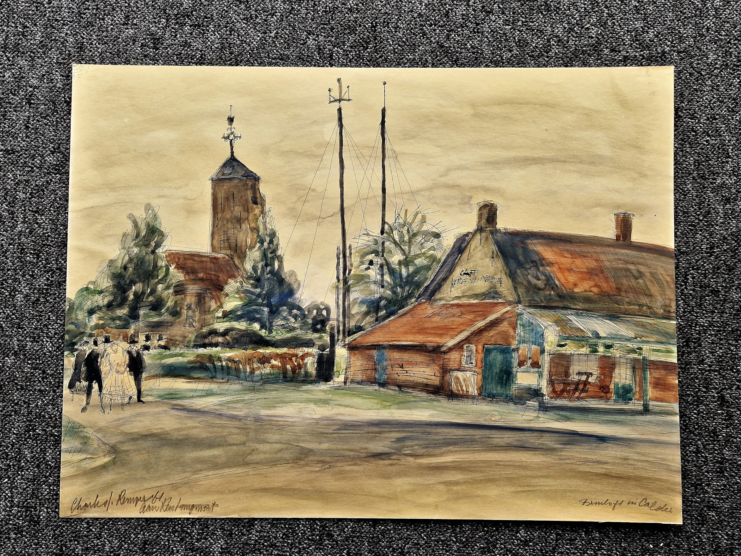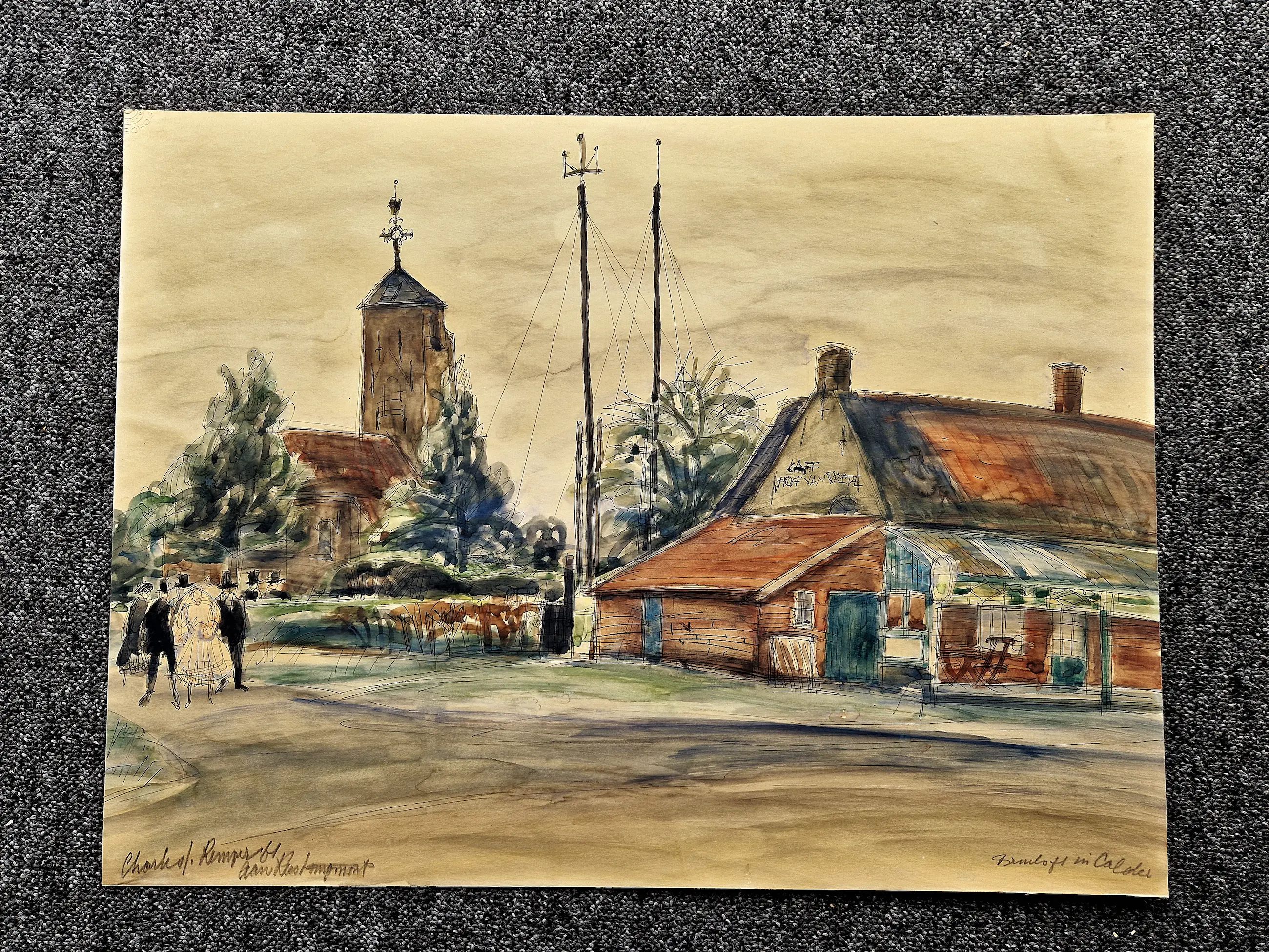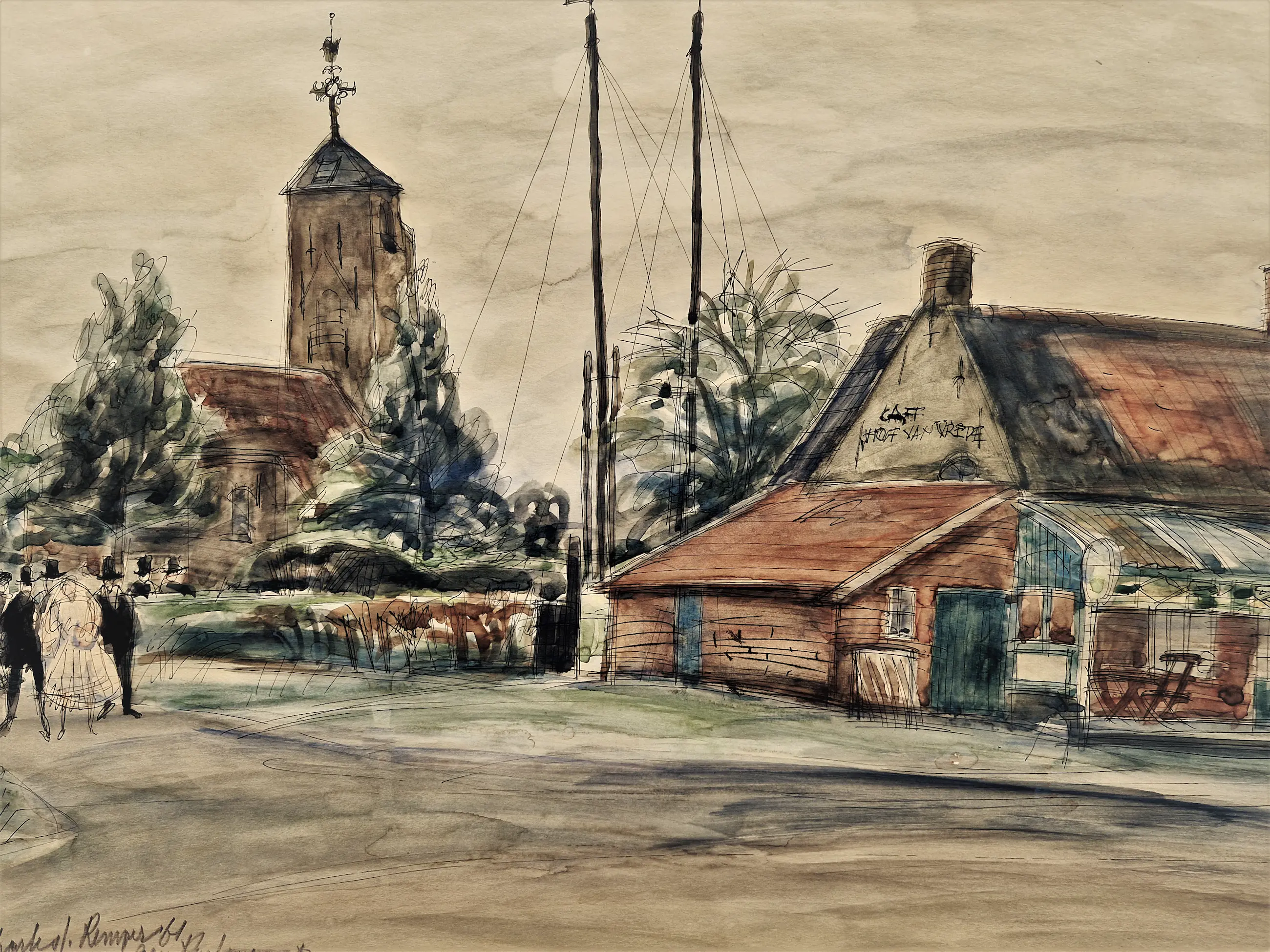 - Grote aquarel van Charles J. Kemper. Titel:Bruiloft in het dorp . Afmetingen blad H45 x b60cm. Het werk is links onderaan met potlood gesigneerd door de kunstenaar.